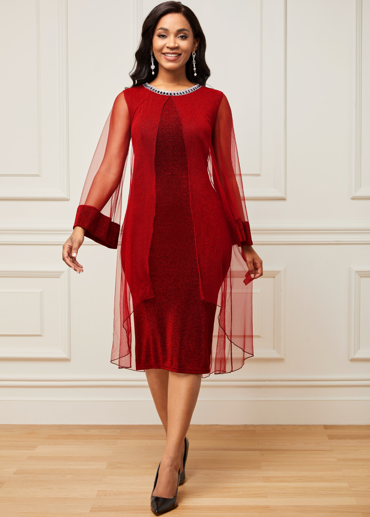 Chiffon Mesh Stitching Wine Red Embellished Neck Dress