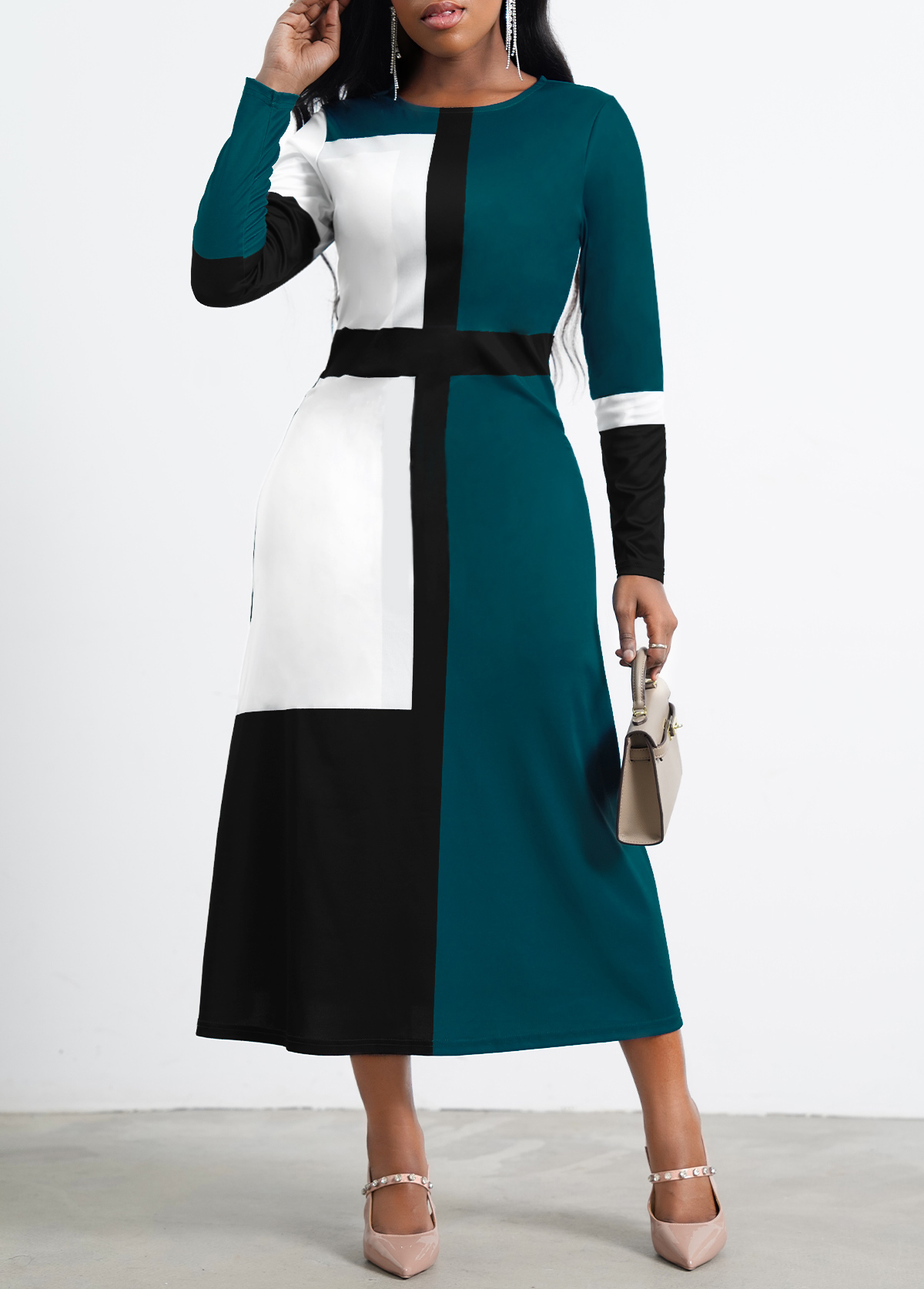 Green Contrast Long Sleeve Round Neck Dress
