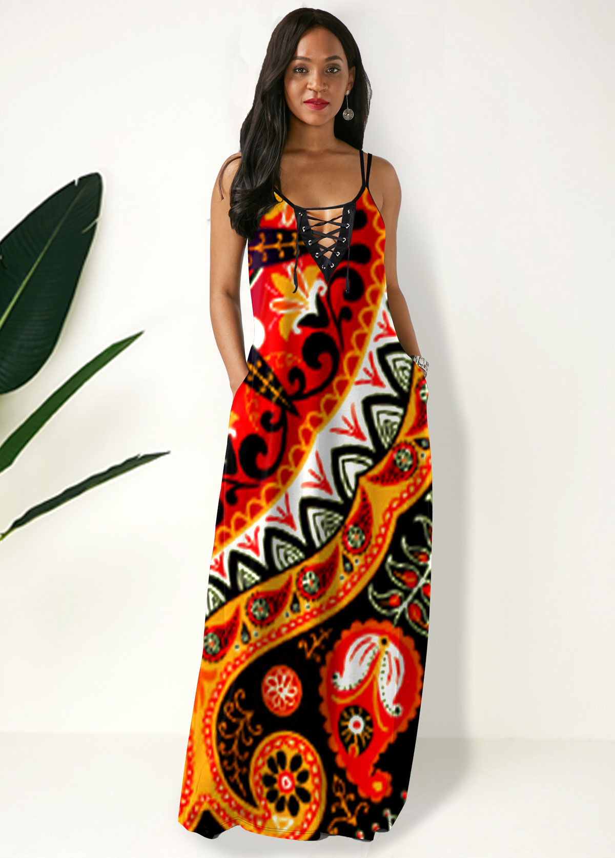 Side Pocket Tribal Print Spaghetti Strap Maxi Dress