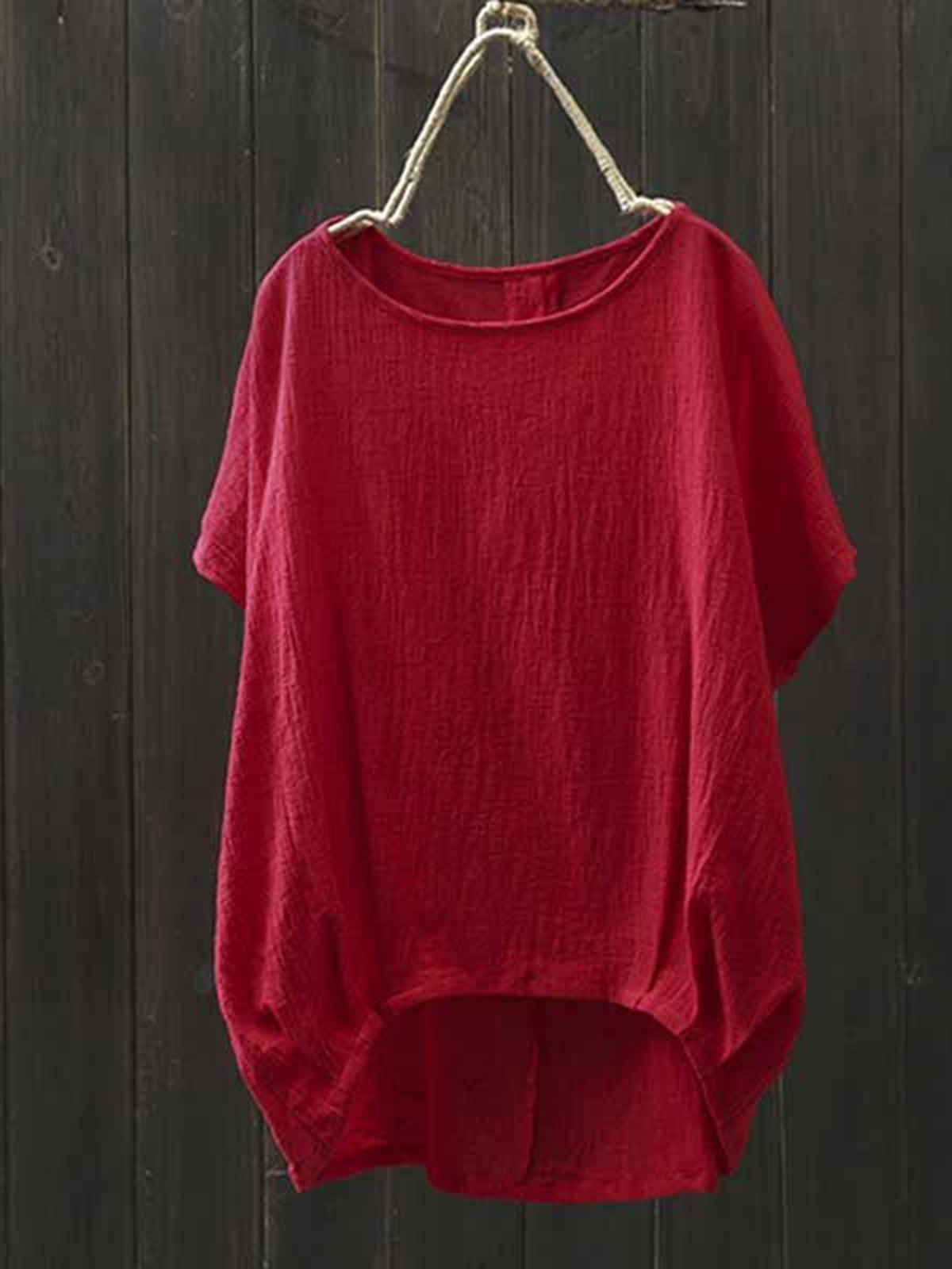 Basic Short Sleeve Solid Crew Neck Asymmetric Linen Blouse