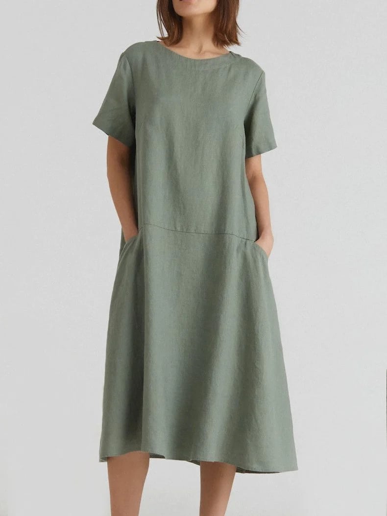 Round Neck A-Line Loose Two Pocket Short Sleeve Mid Sleeve Cotton Linen Dress