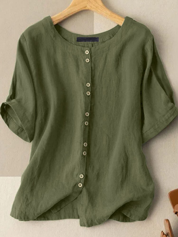 Solid Button Half Sleeve Round Neck Casual Cotton Blouse