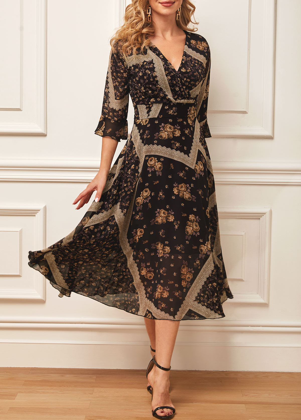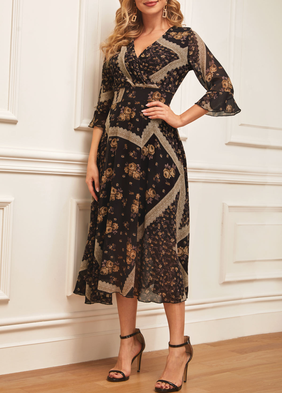 Black Chiffon Floral Print V Neck Dress