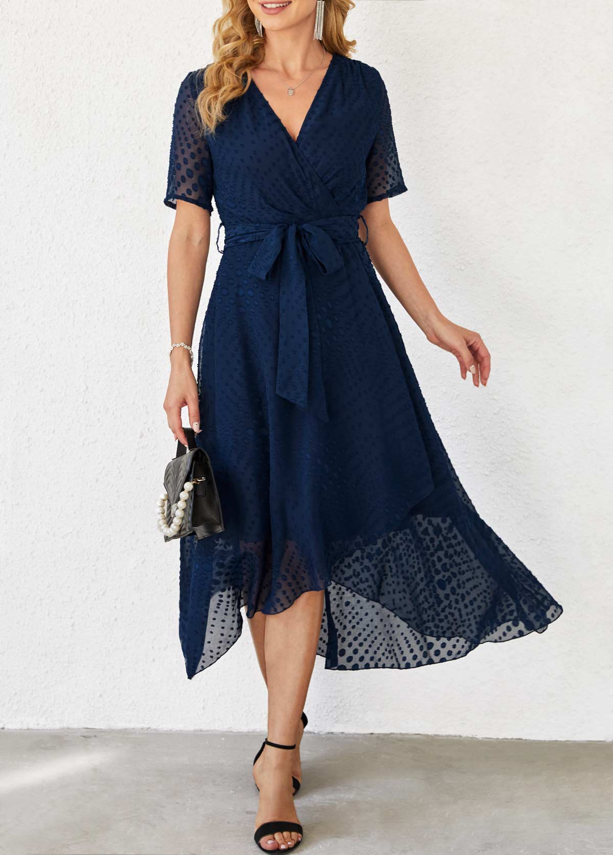 Chiffon Cut Flowers Belted Navy Blue Dress