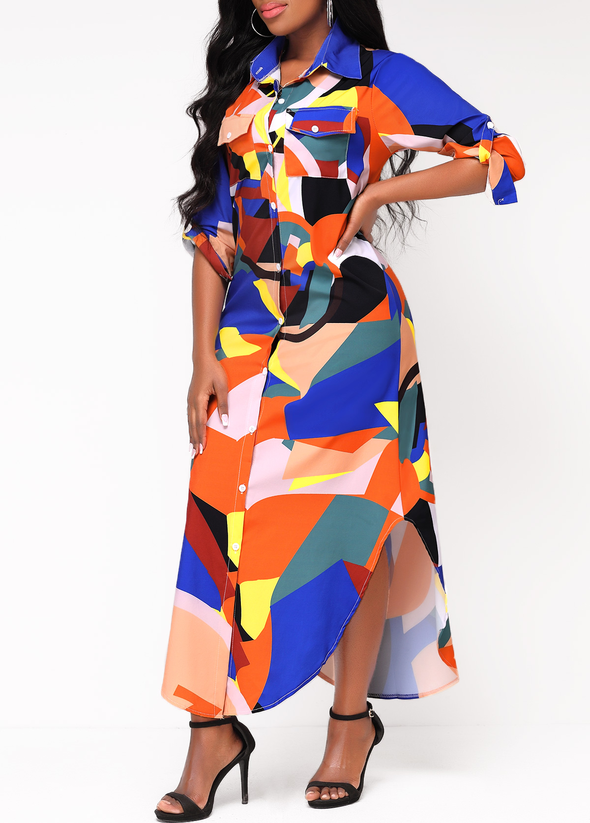 Geometric Print Button Up Long Sleeve Maxi Dress
