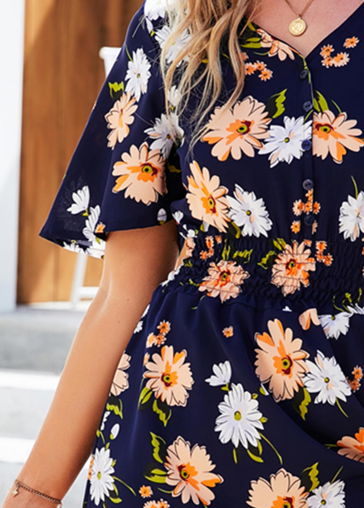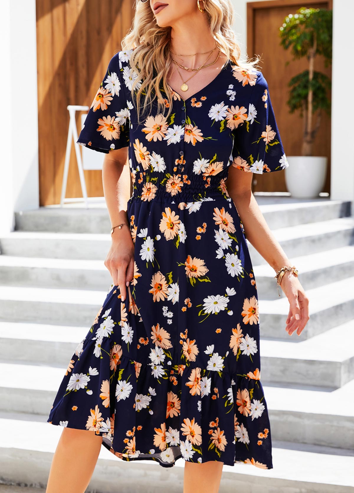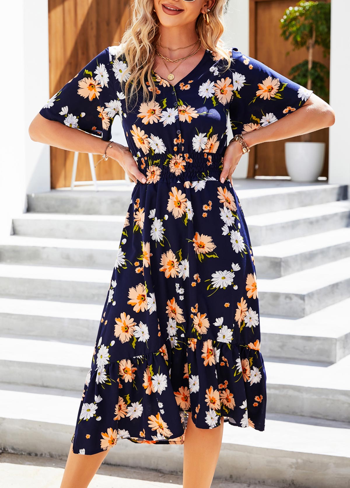 Navy Blue Smocked Floral Print Flounce Dress