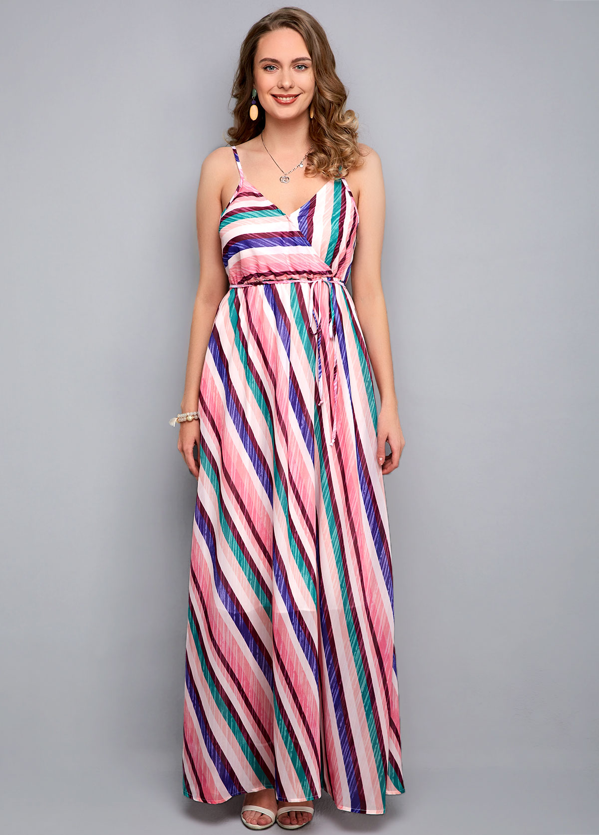 Sleeveless Drawstring Waist Striped Print Maxi Dress