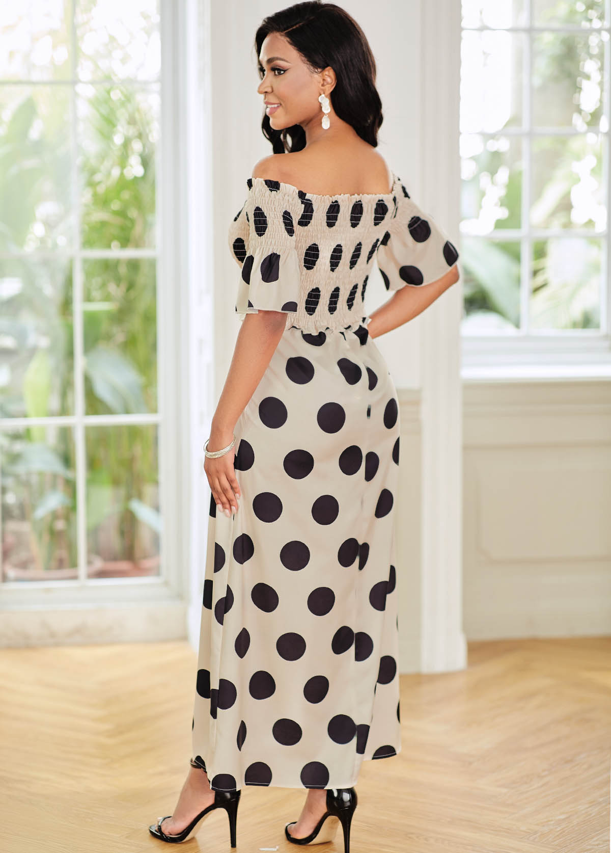 Smocked Off Shoulder Polka Dot Dress