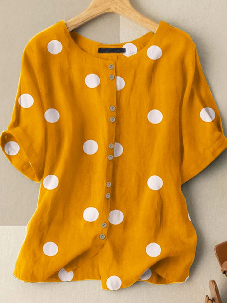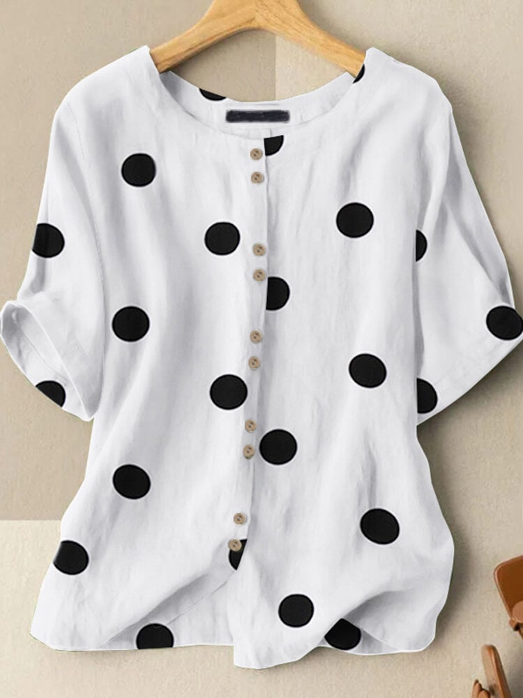 Dot Print Button Front Crew Neck Half Sleeve Blouse