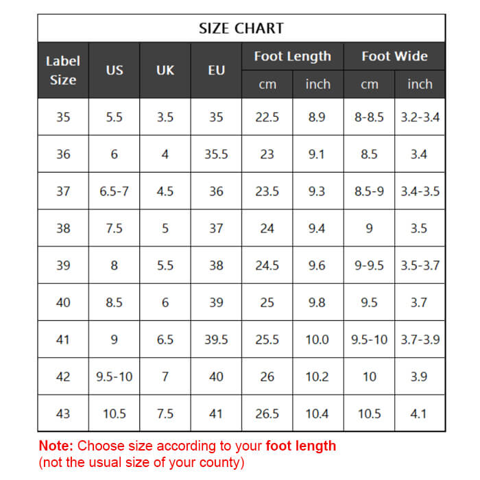 • The foot length refers to the insole length. Eg. US 7.5 (9.4"/24cm) is the length of the insole only