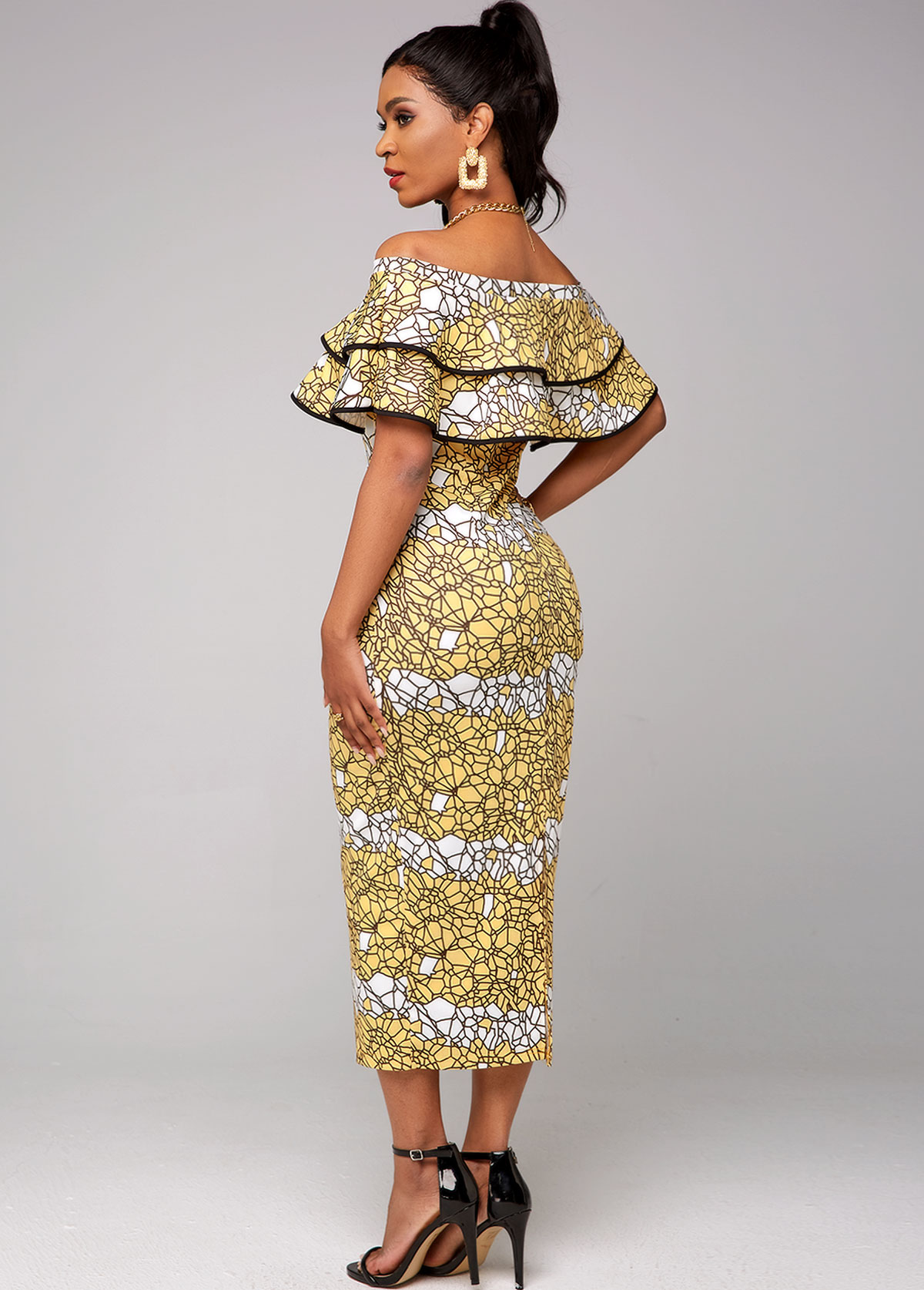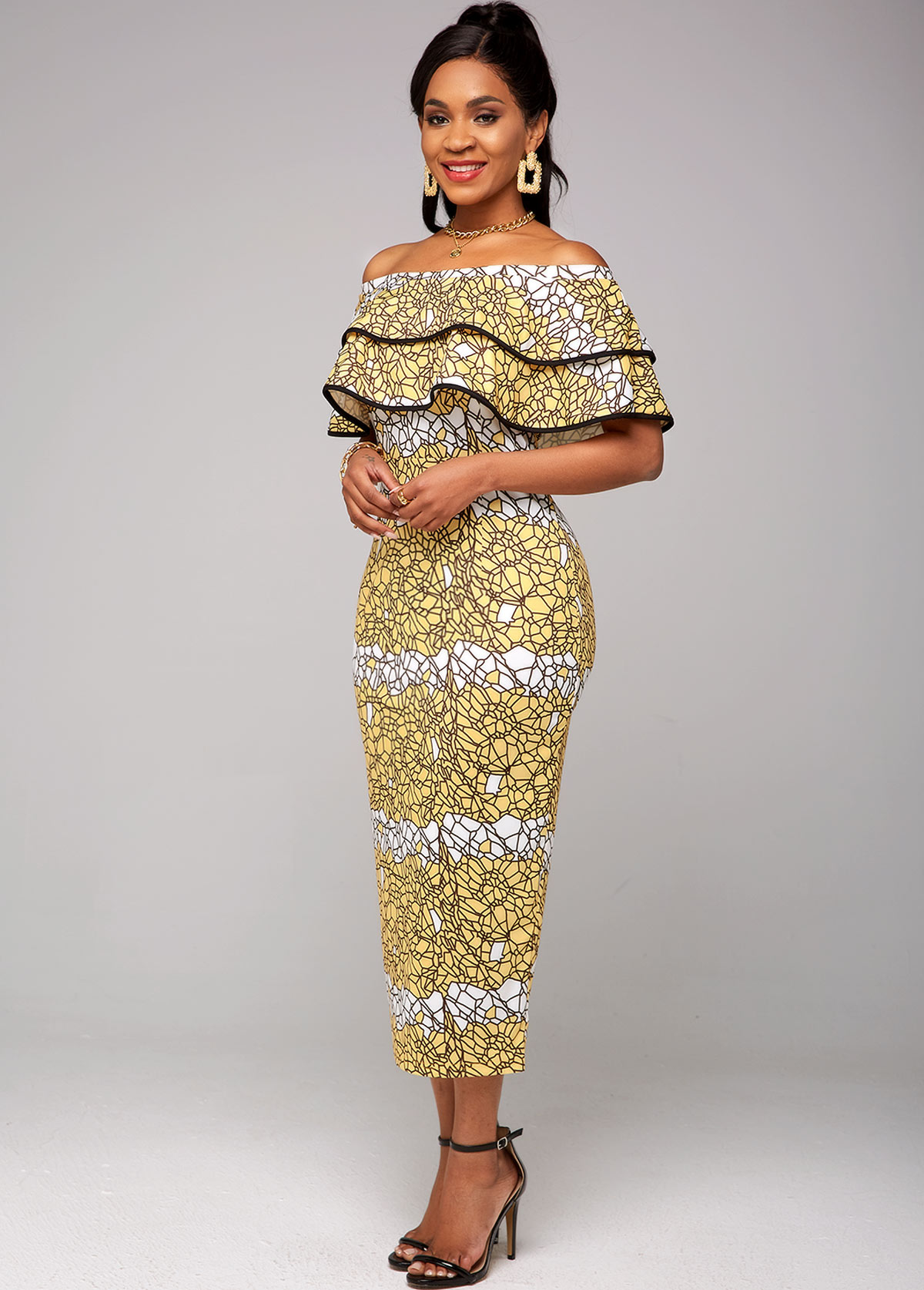 Ruffle Overlay Printed Off Shoulder Dress
