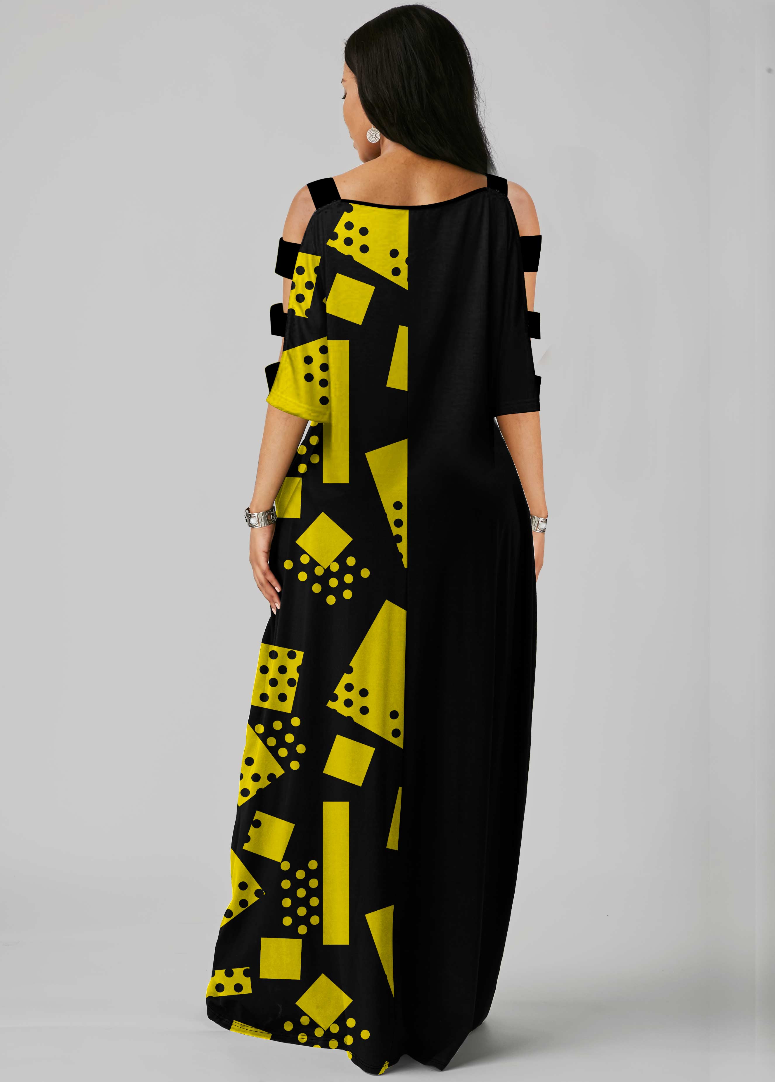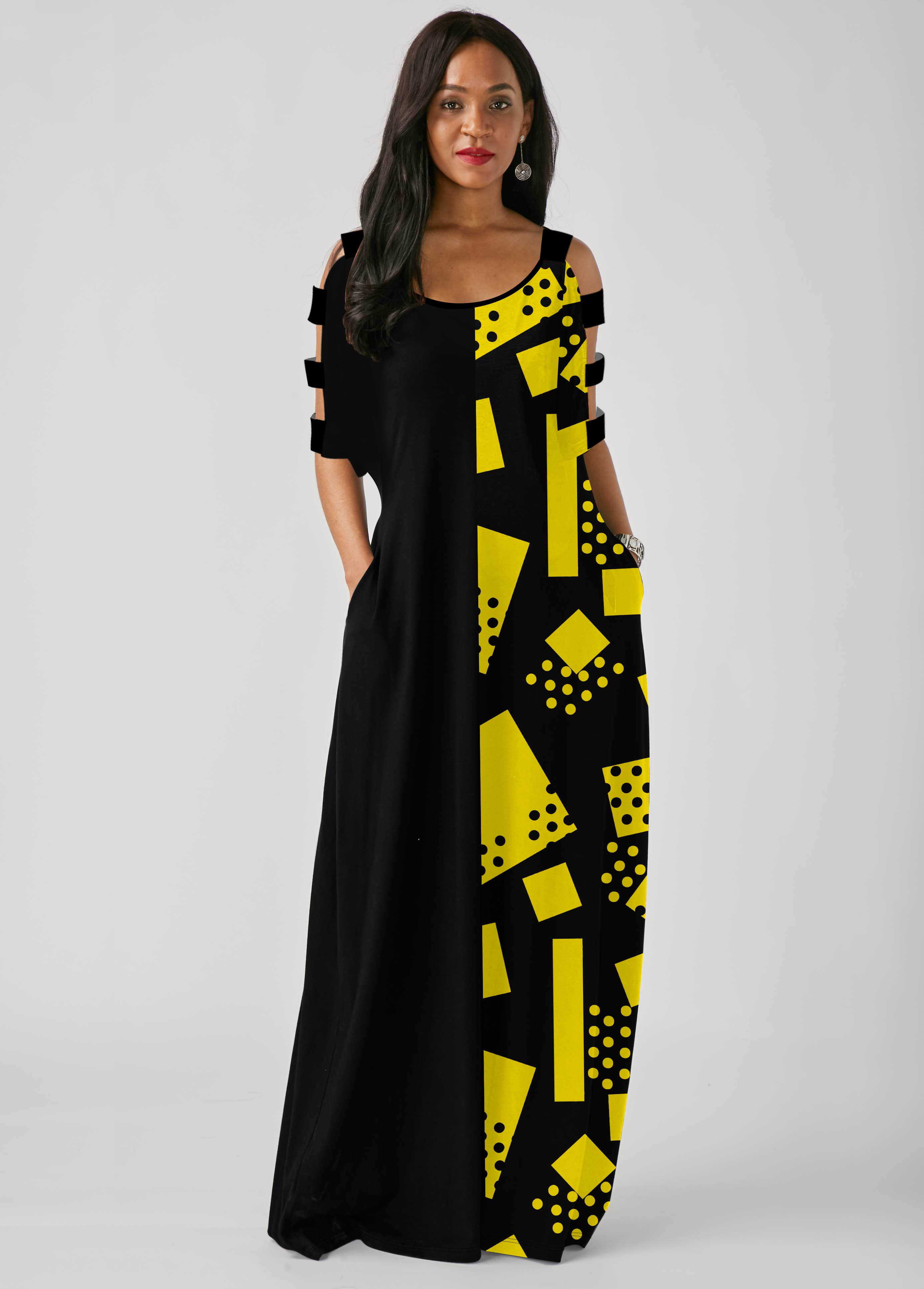 Side Pocket Geometric Print Ladder Cutout Sleeve Maxi Dress