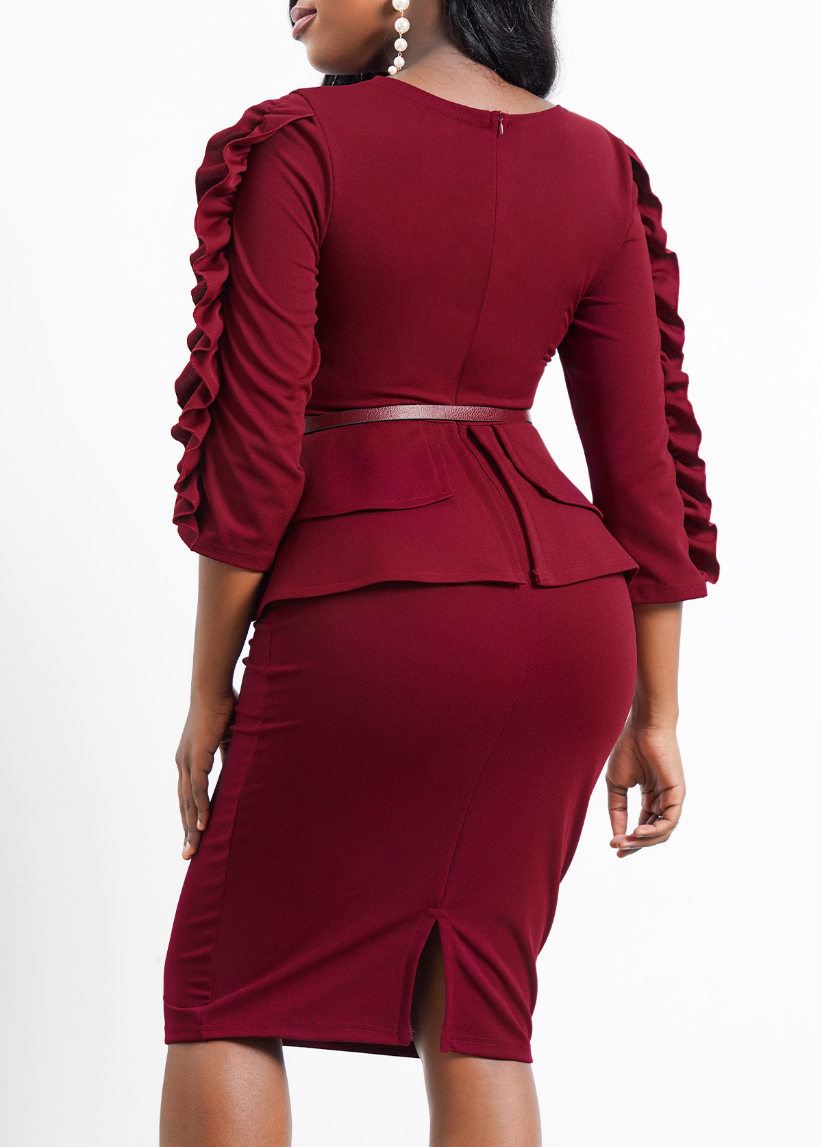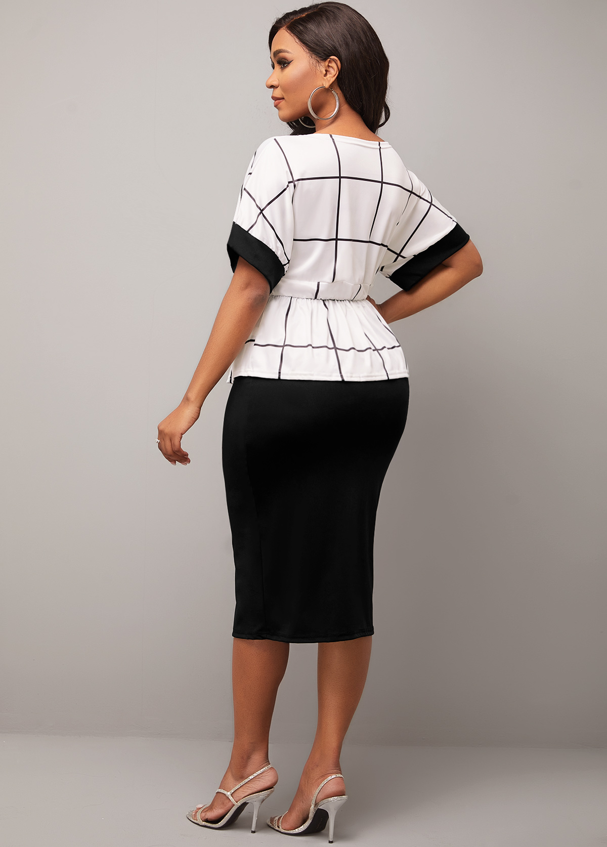 Round Neck Peplum Waist Rose Pink Plaid Dress