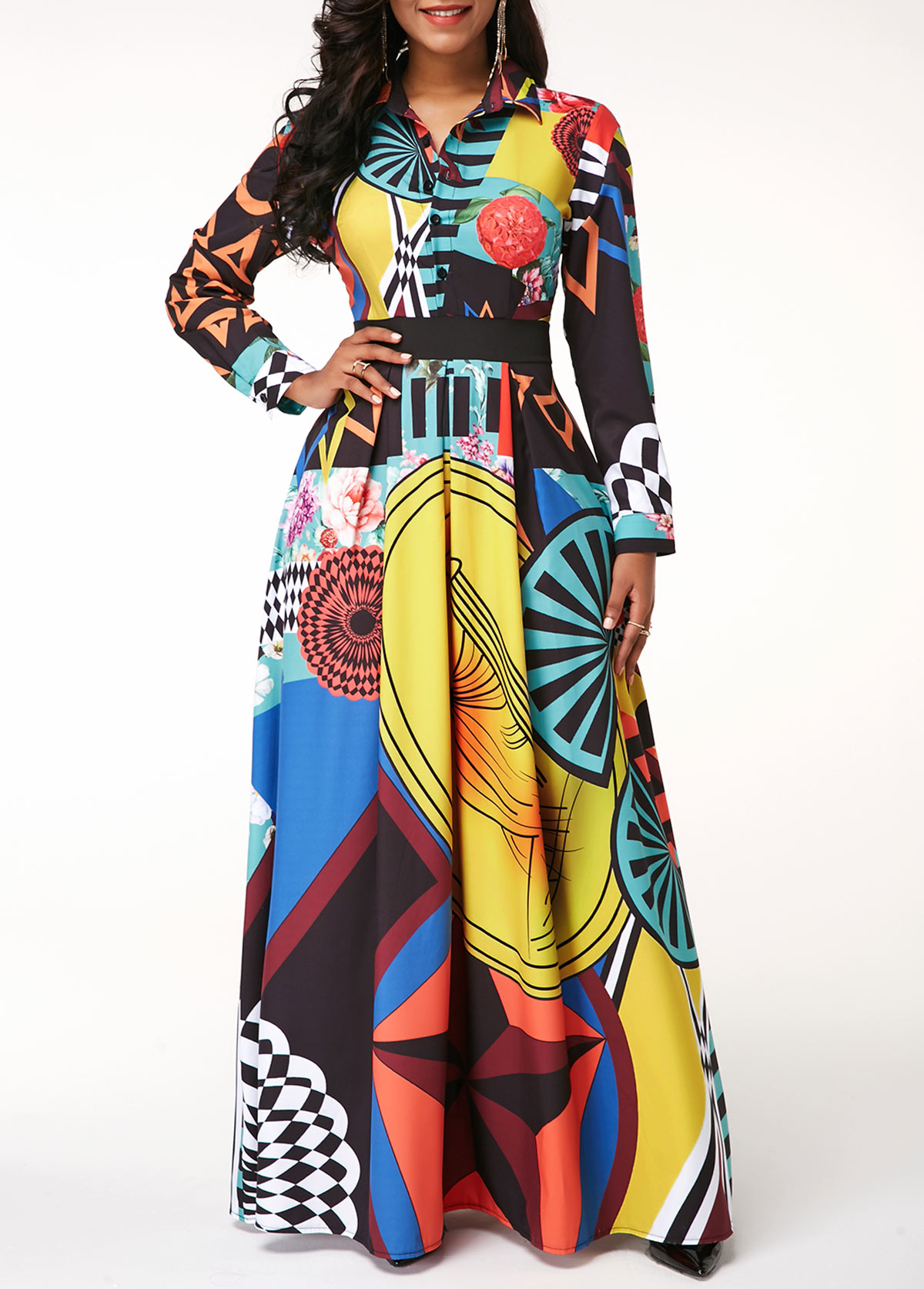 Printed Button Up Long Sleeve Turndown Collar Dress