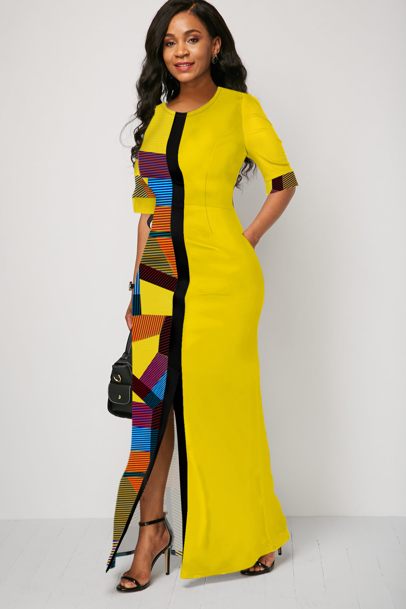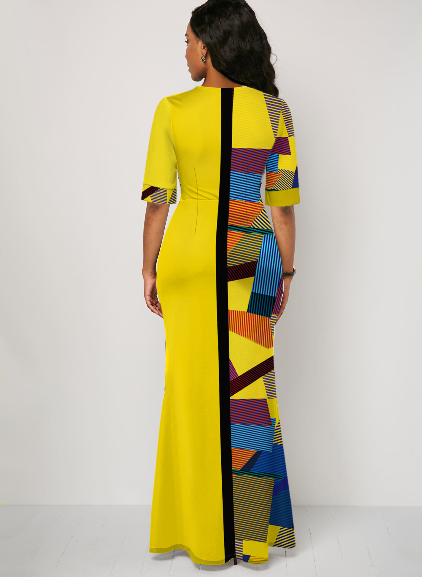 Geometric Print Round Neck Yellow Short Sleeve Dress