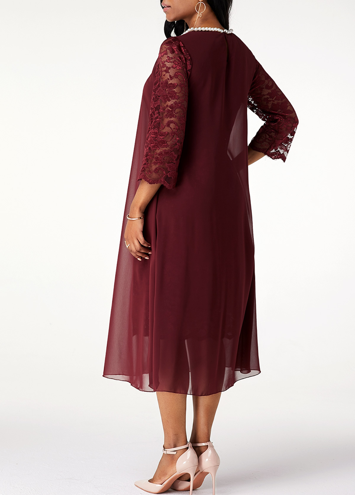 Lace Patchwork Wine Red 3/4 Sleeve Dress