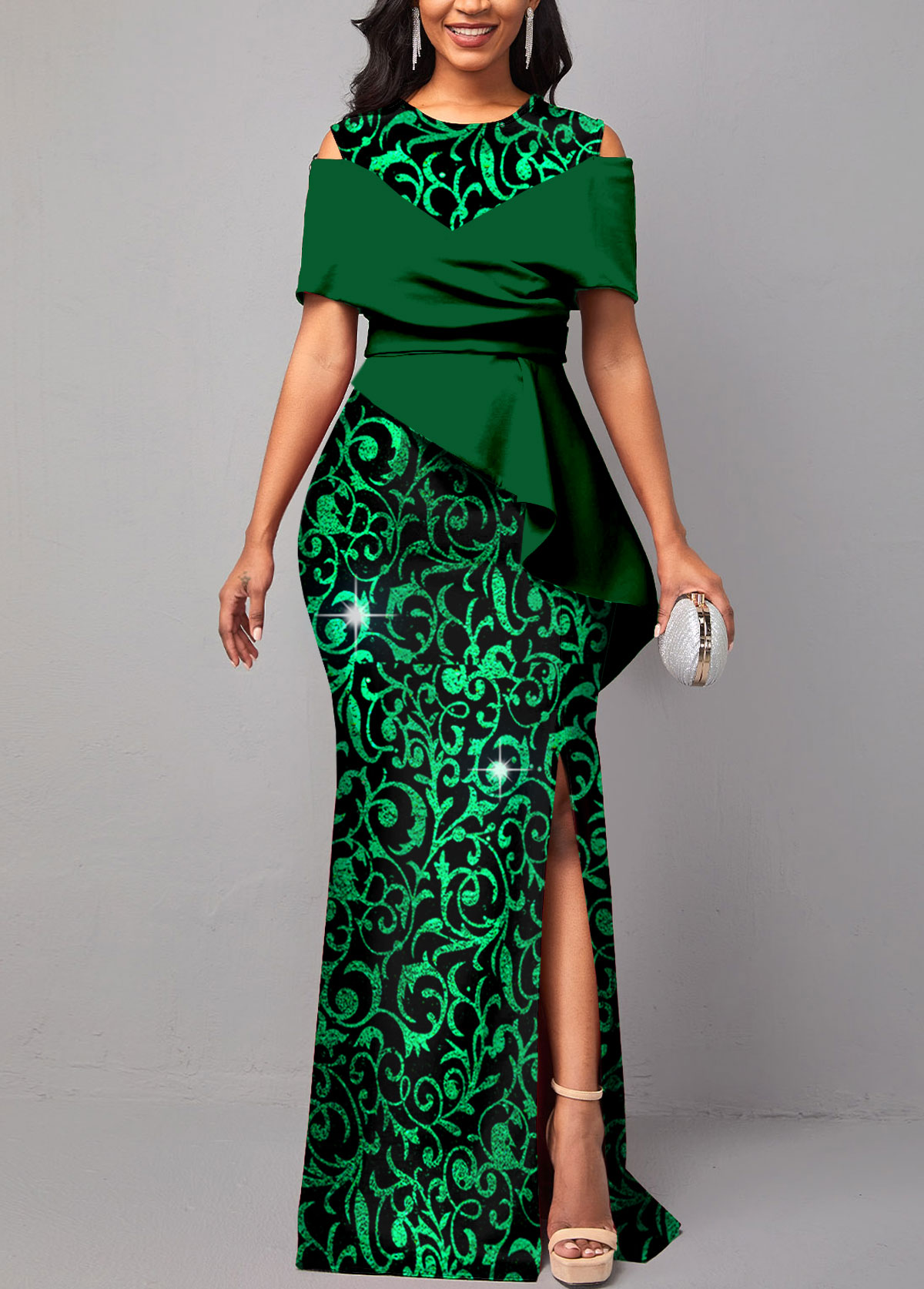 Double Side Pockets Black Cold Shoulder Maxi Dress