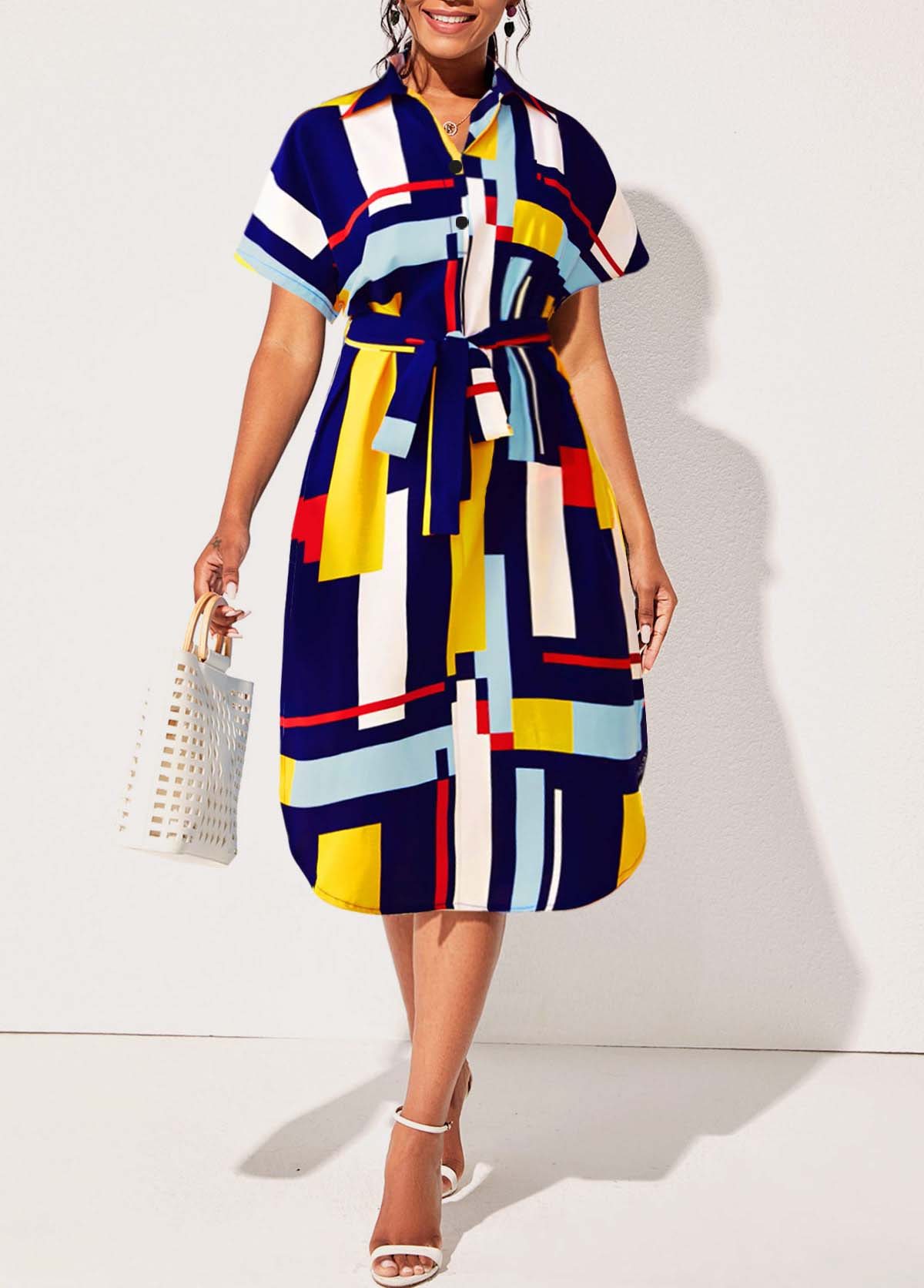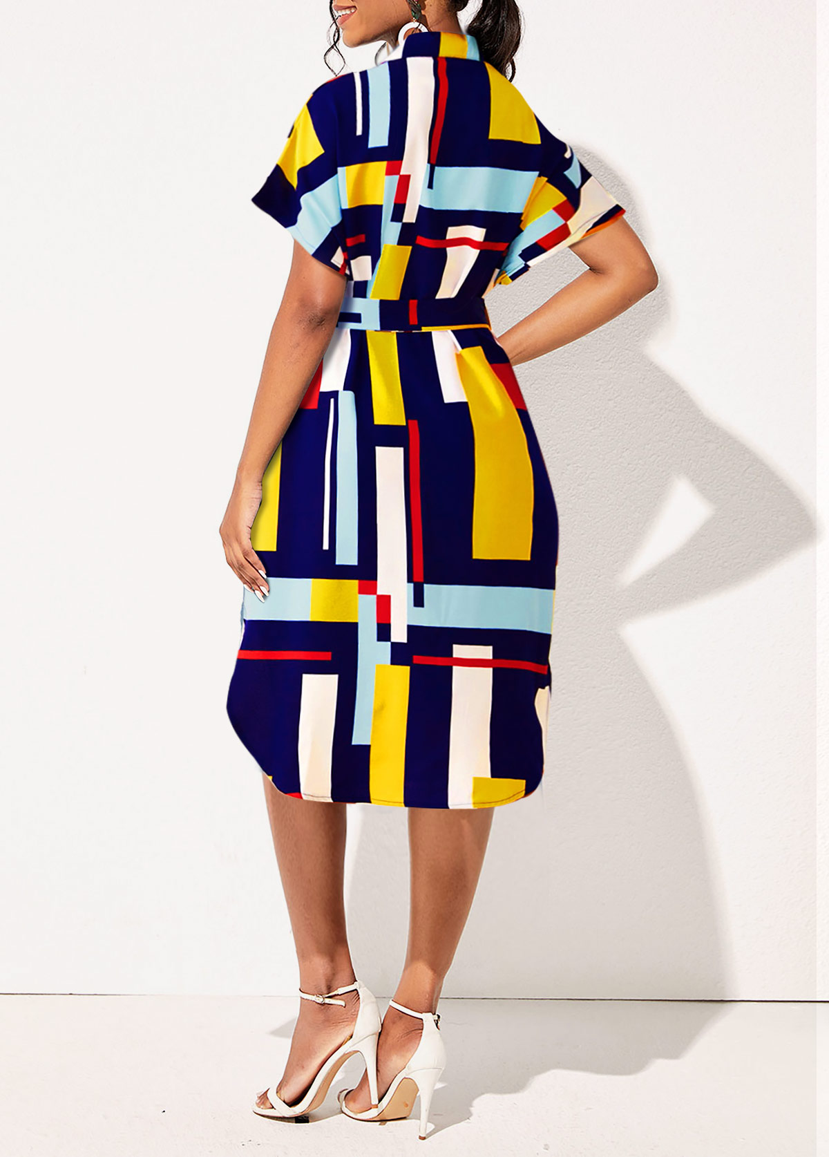 Belted Turndown Collar Geometric Print Dress