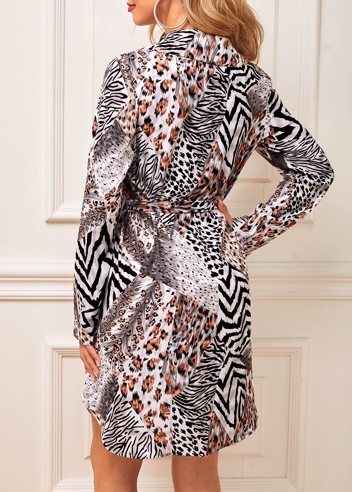 Belted Animal Pattern Turndown Collar Dress