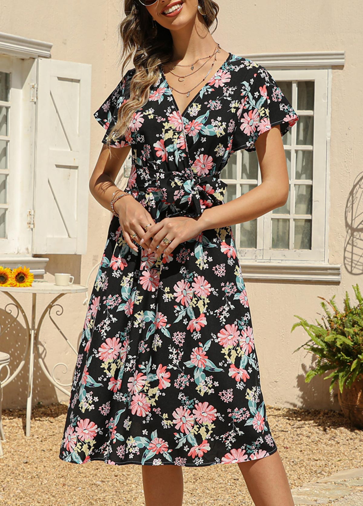 Black Belted Floral Print Cross Front Dress