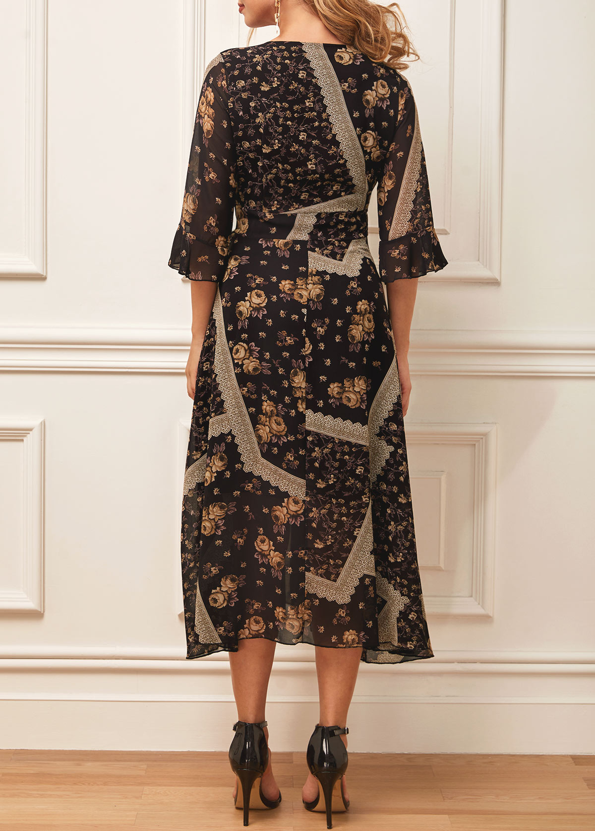 3/4 Sleeve Cutout Front Floral Print Maxi Dress