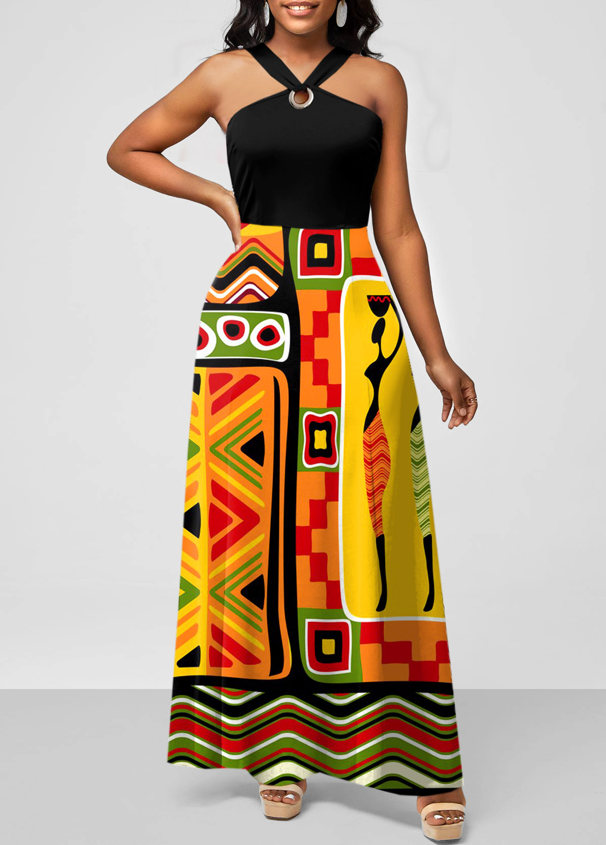 Belted Dashiki Print Bib Neck Maxi Dress