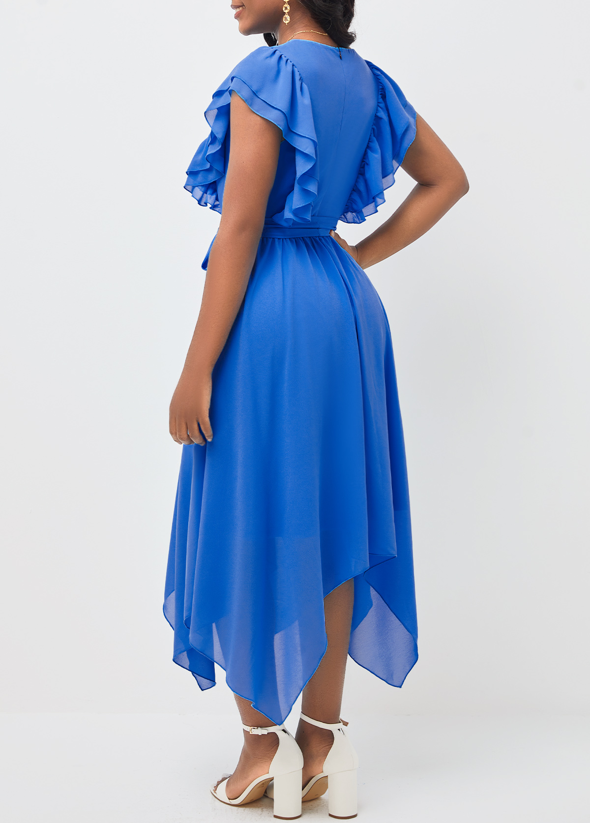 Blue Asymmetric Hem Belted V Neck Dress