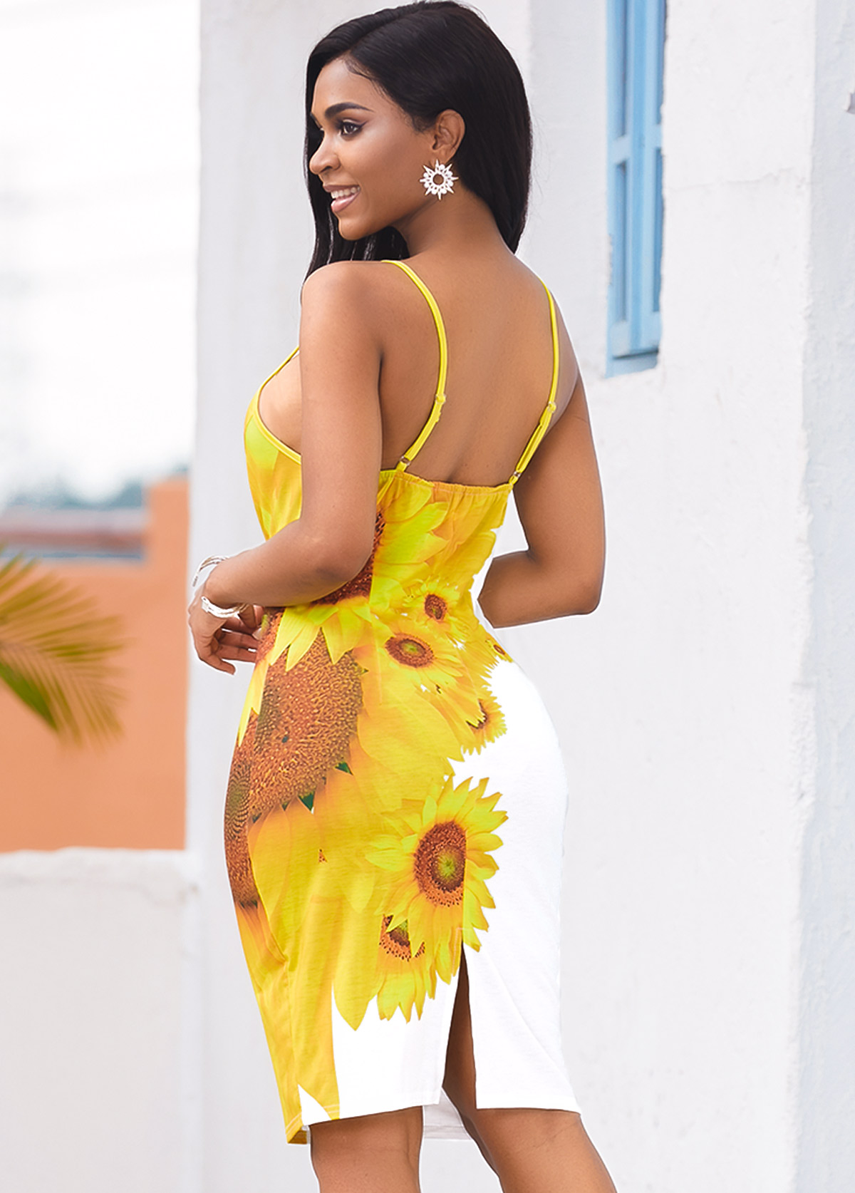 Back Slit Sunflower Print Spaghetti Strap Dress