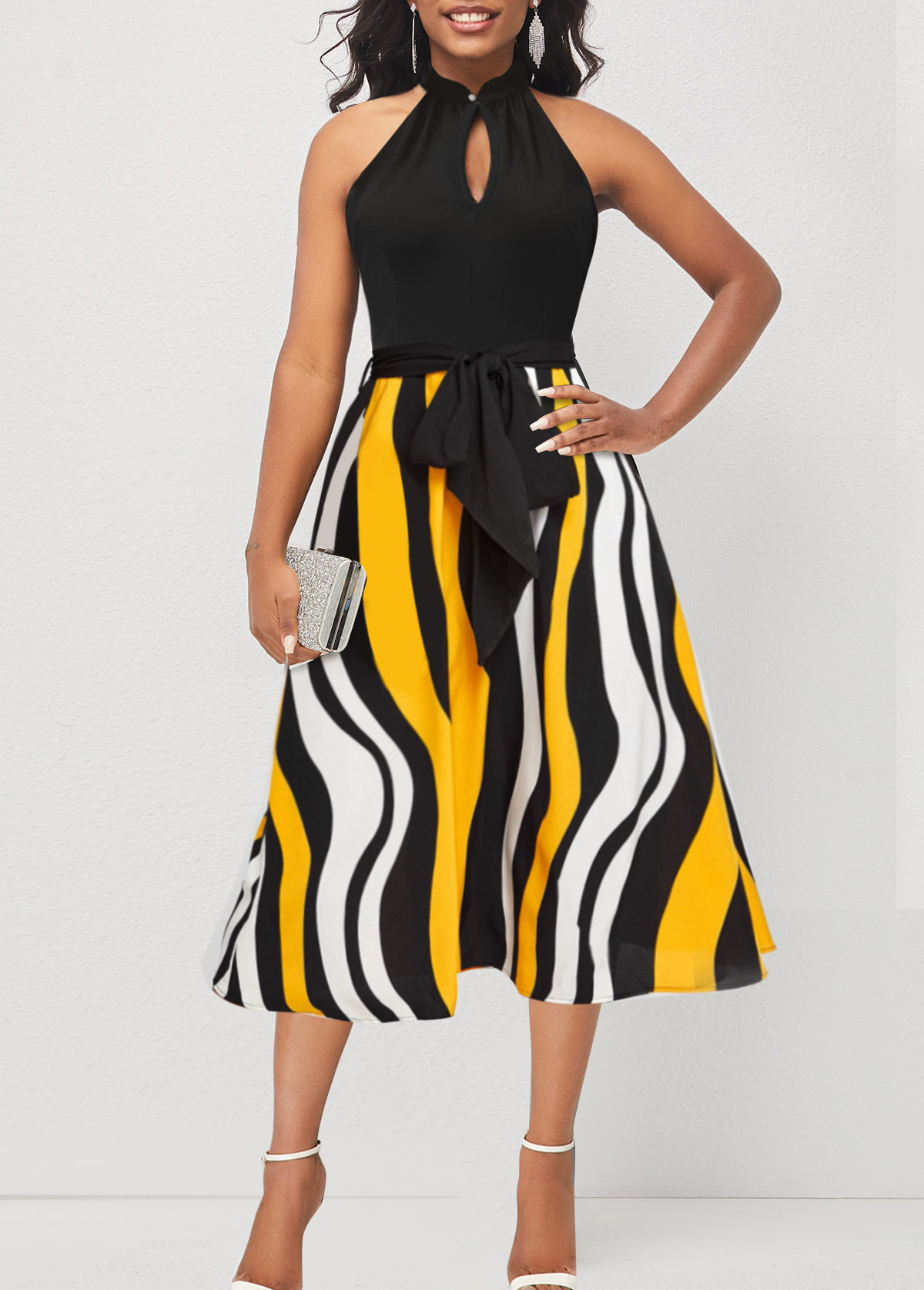 Bib Neck Color Block Striped Belted Dress