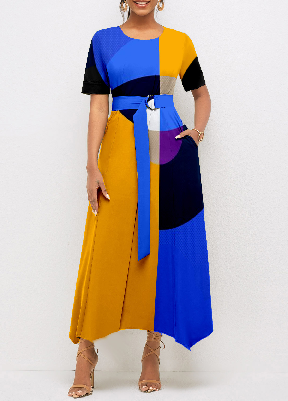 Belted Geometric Print Color Block Dress