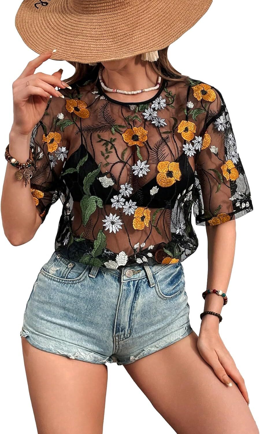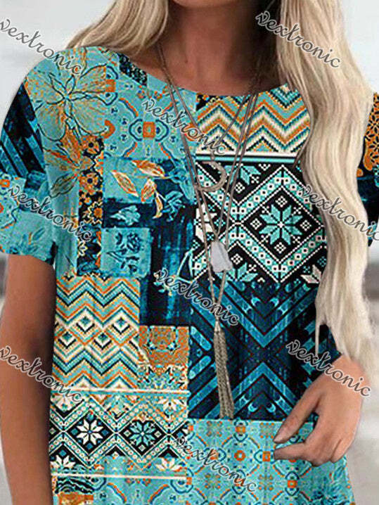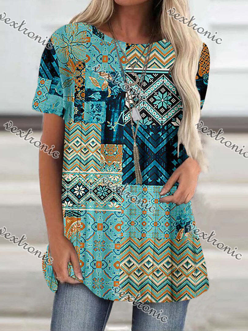 Women Short Sleeve Scoop Neck Floral Printed Graphic Geometric Tops