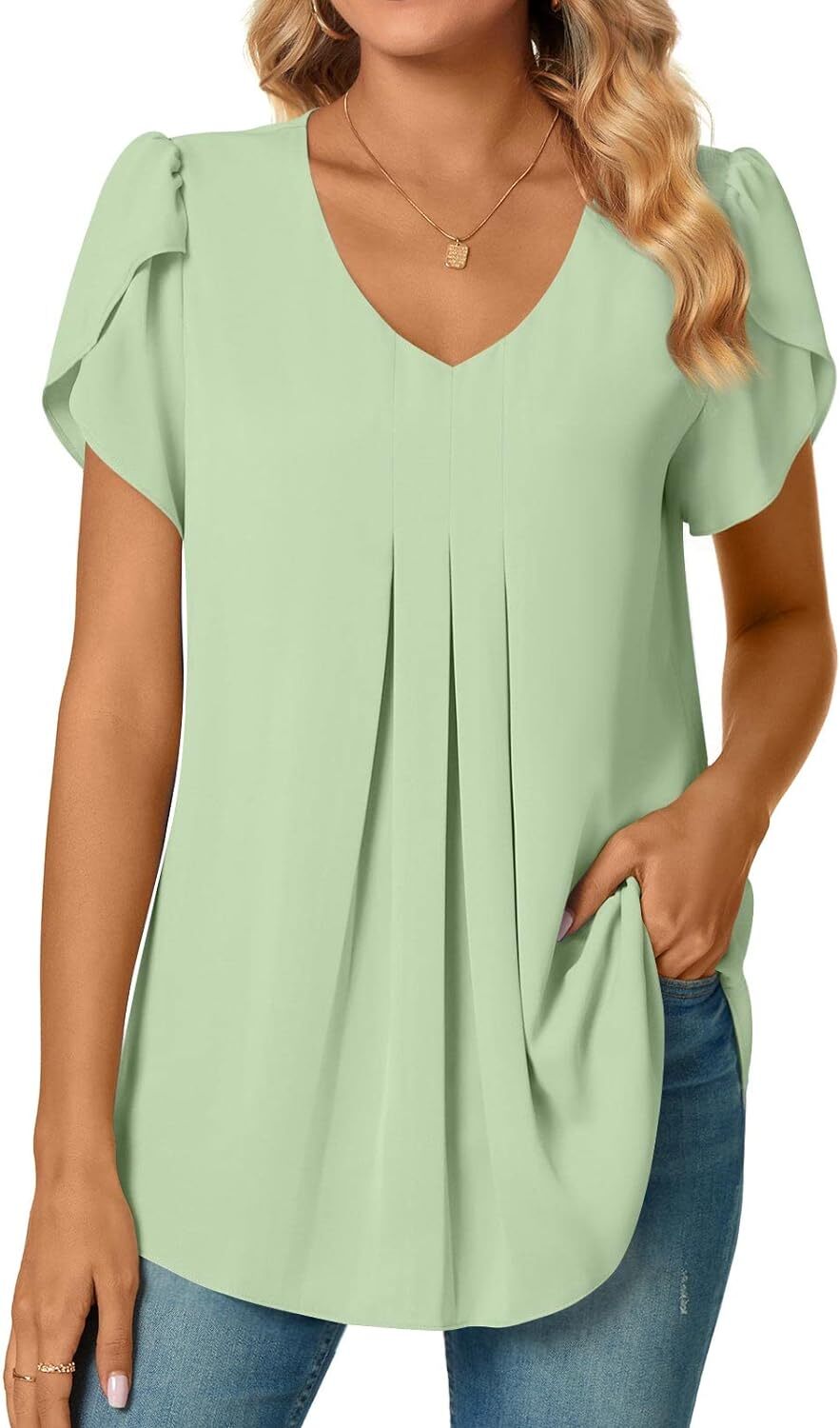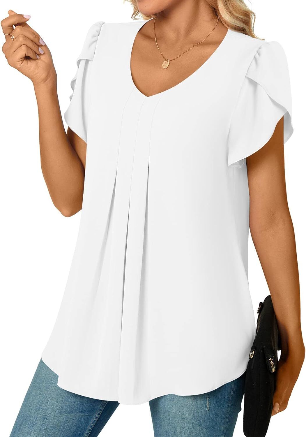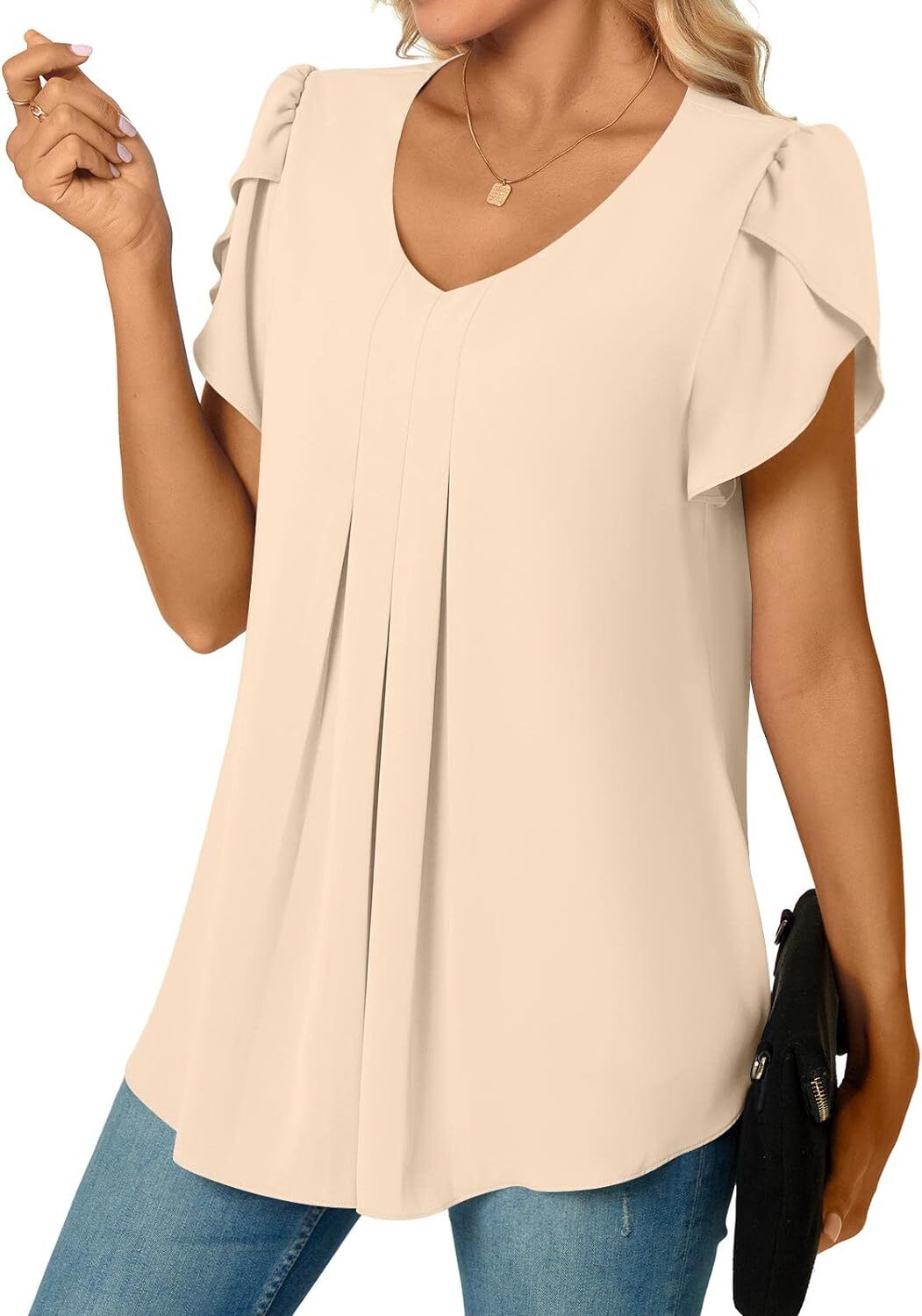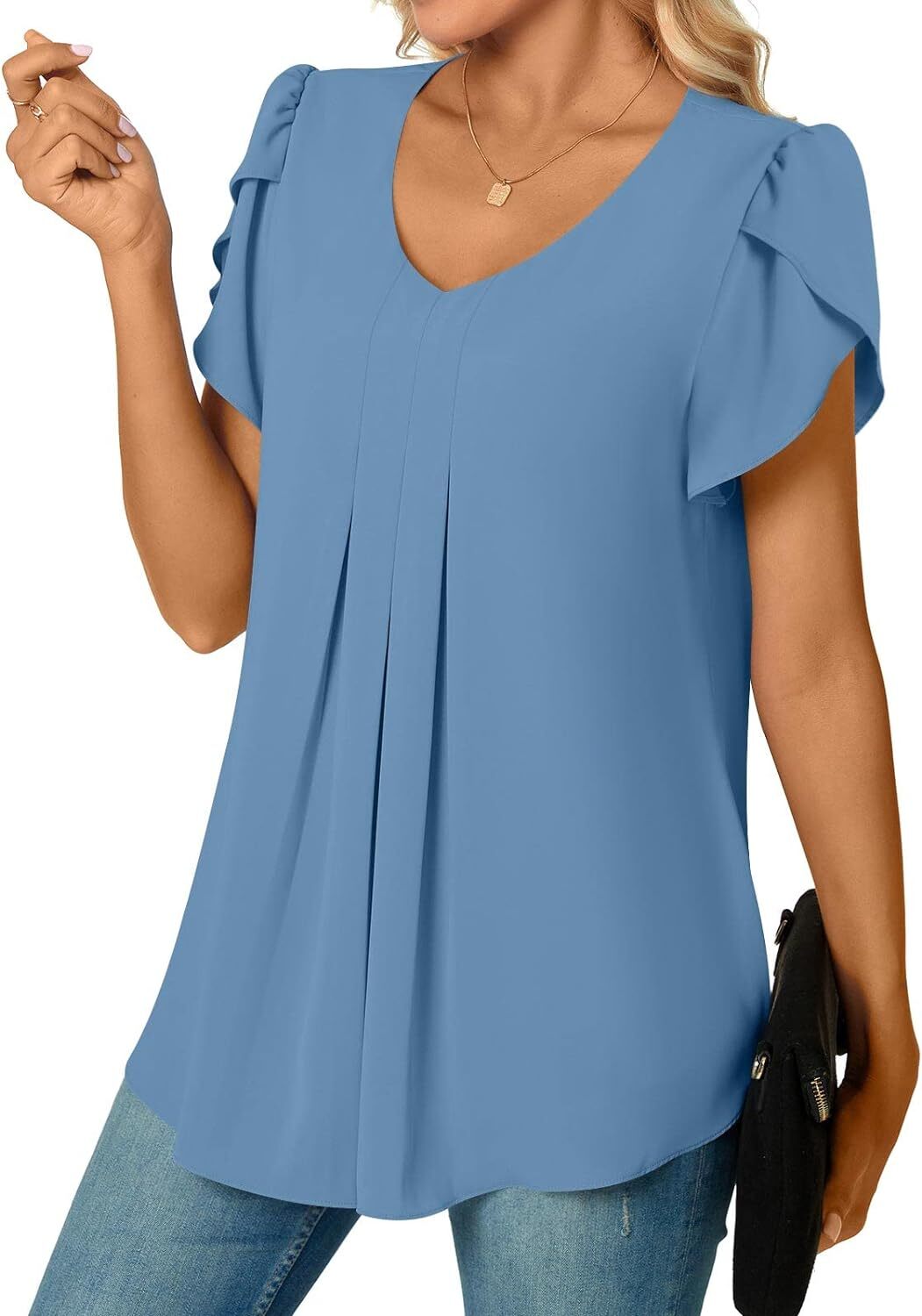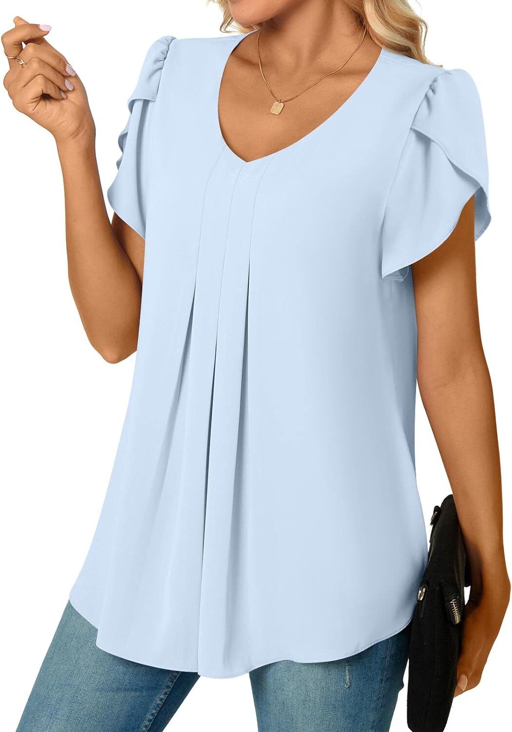 • Bestbee Women's Dressy Chiffon Blouse Shirts Pleated Tunic Tops V Neck Petal Short Sleeve Casual T-Shirts 2024 Summer Tops