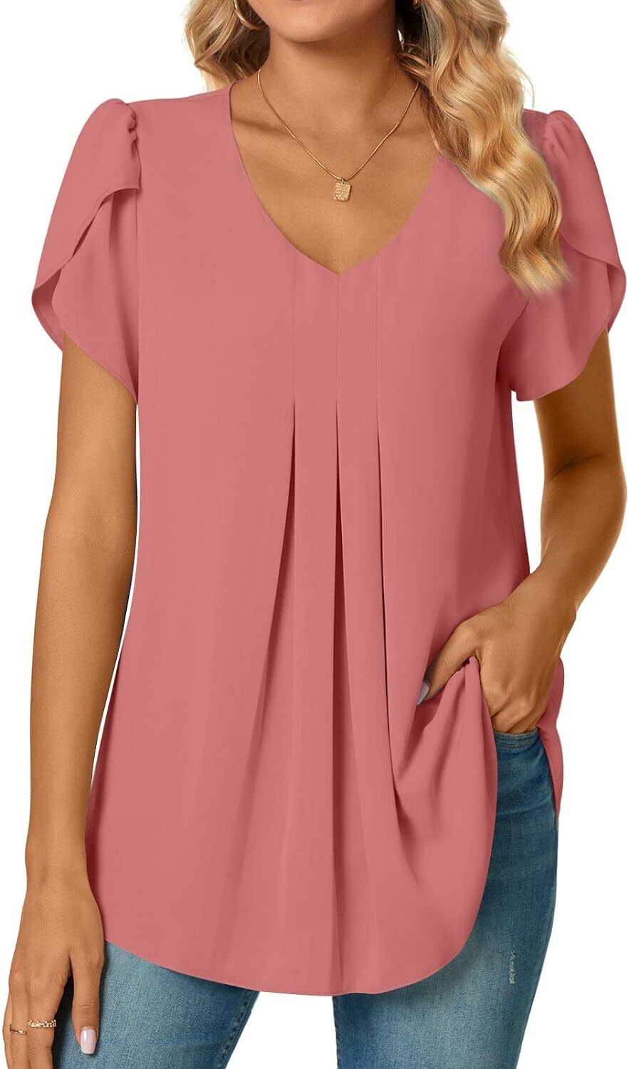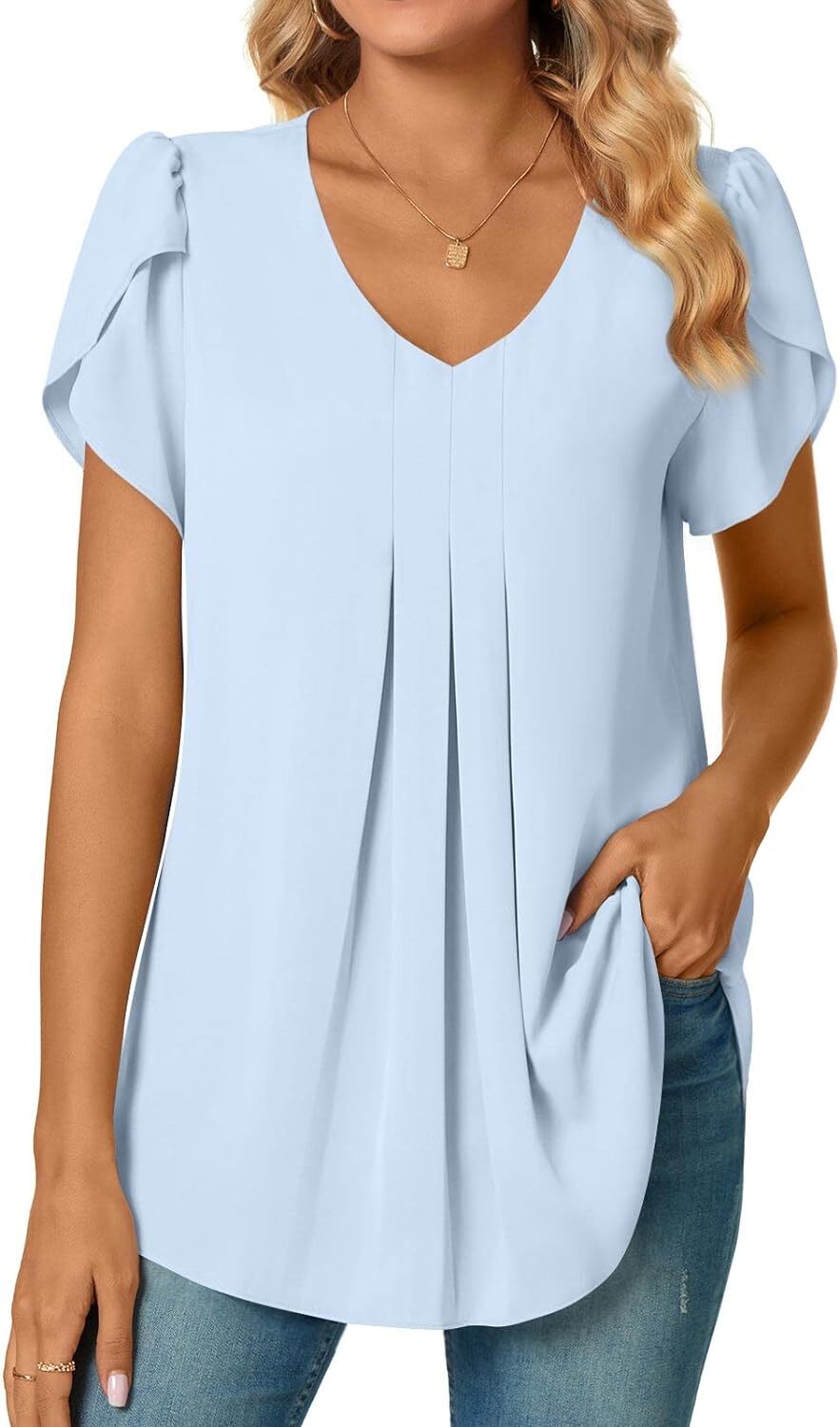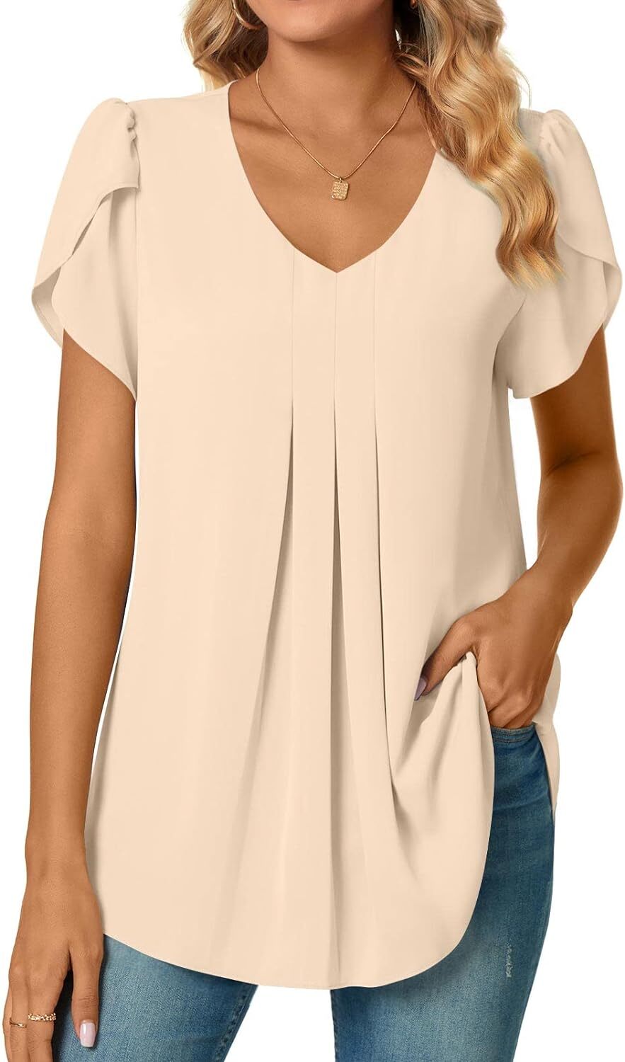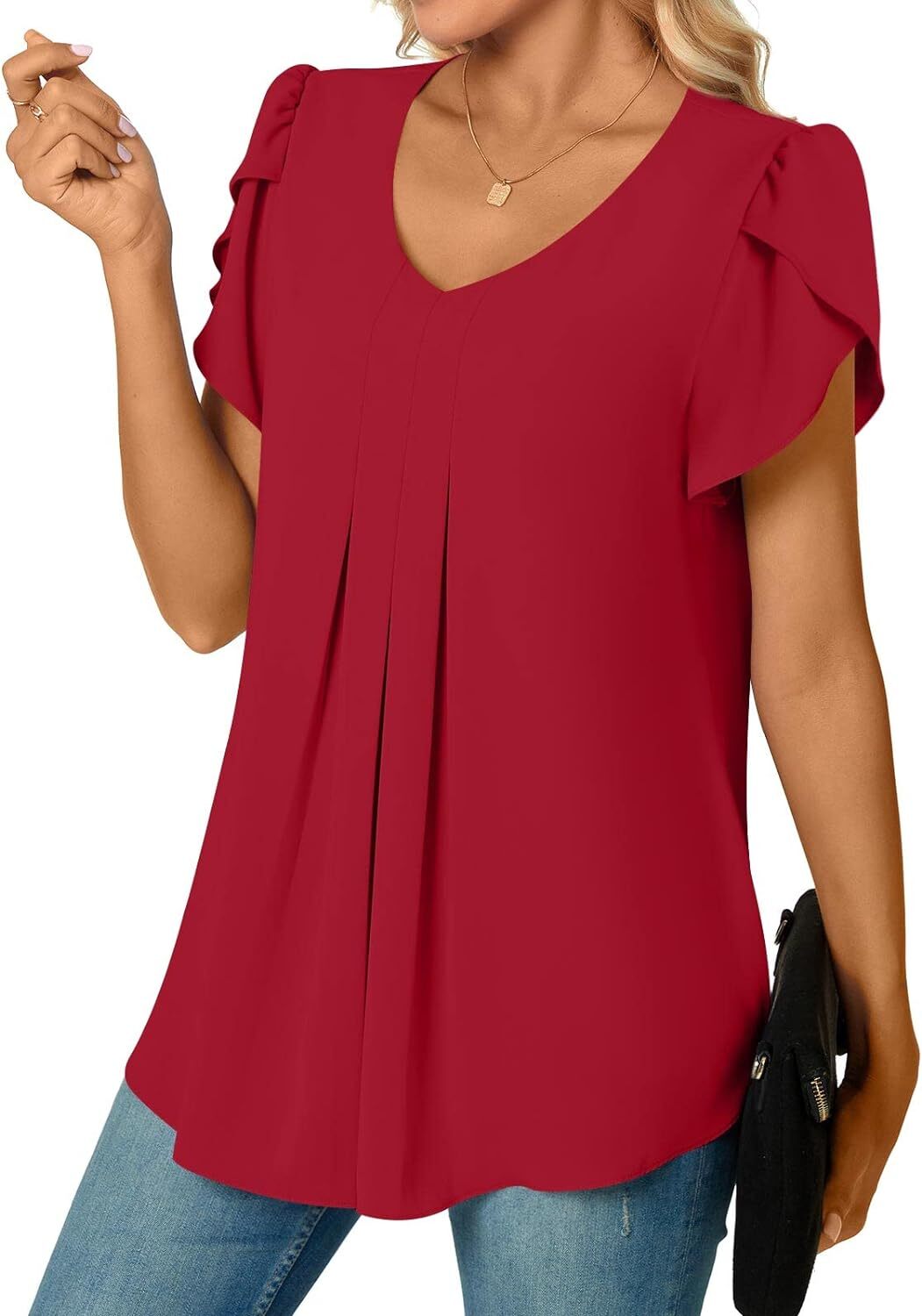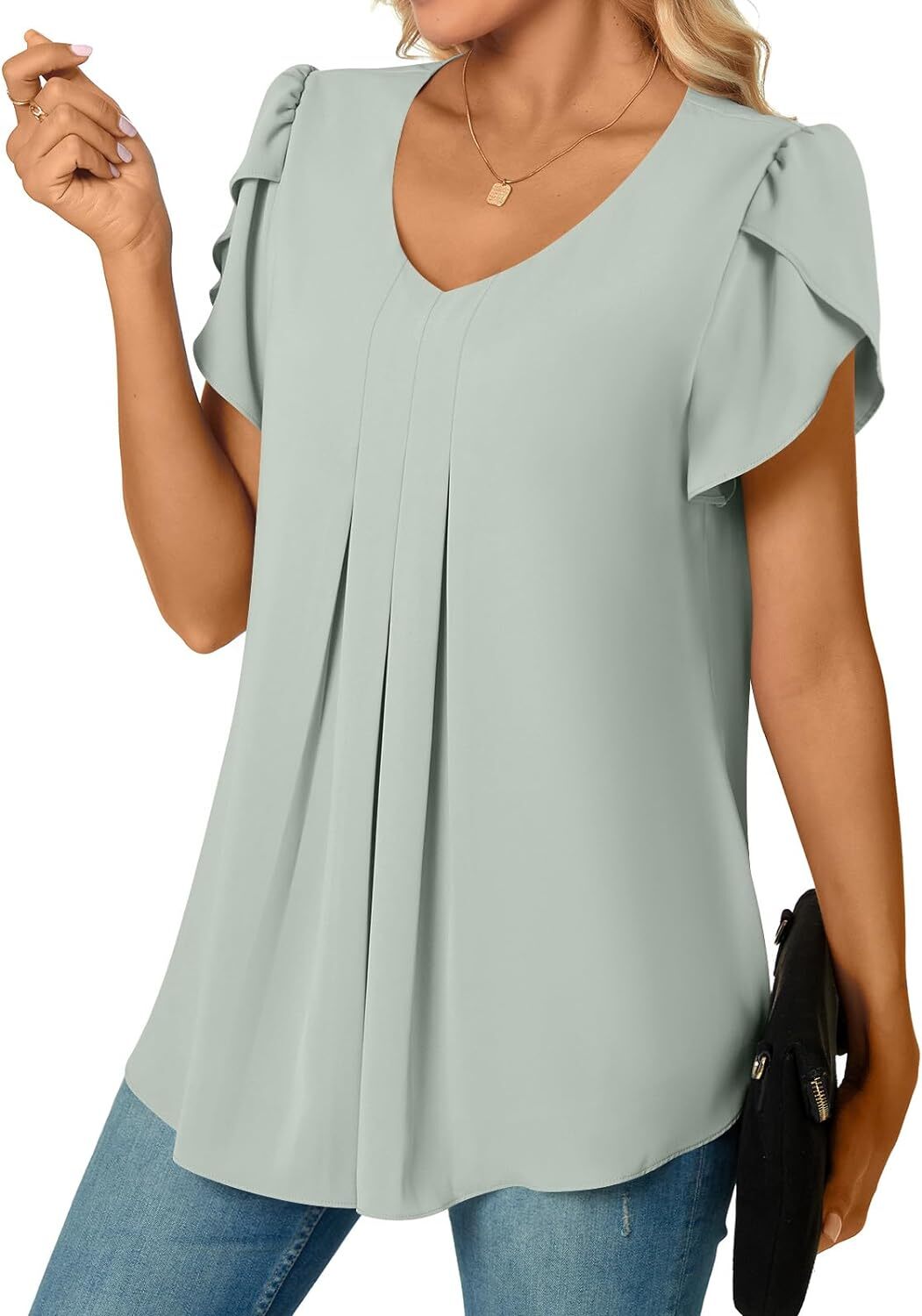 • Bestbee Women's Dressy Chiffon Blouse Shirts Pleated Tunic Tops V Neck Petal Short Sleeve Casual T-Shirts 2024 Summer Tops