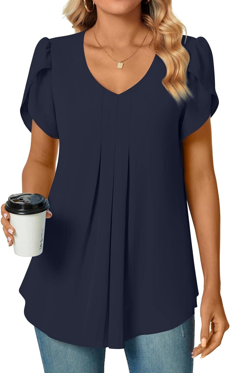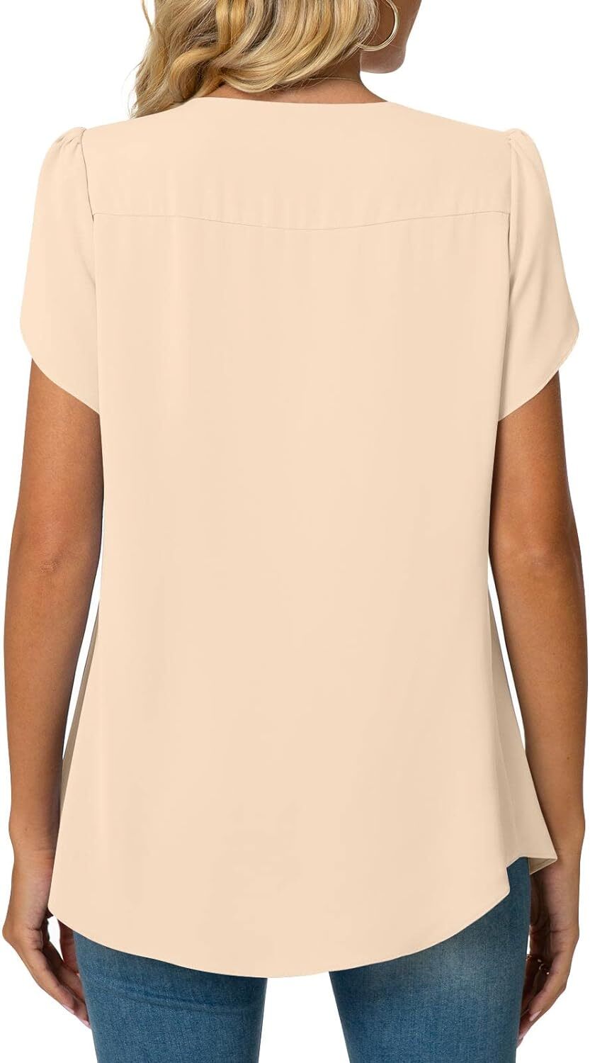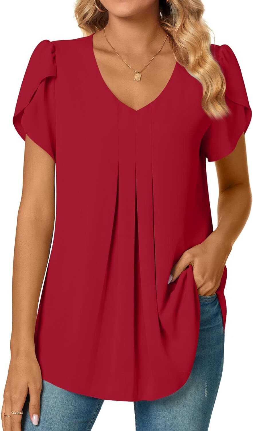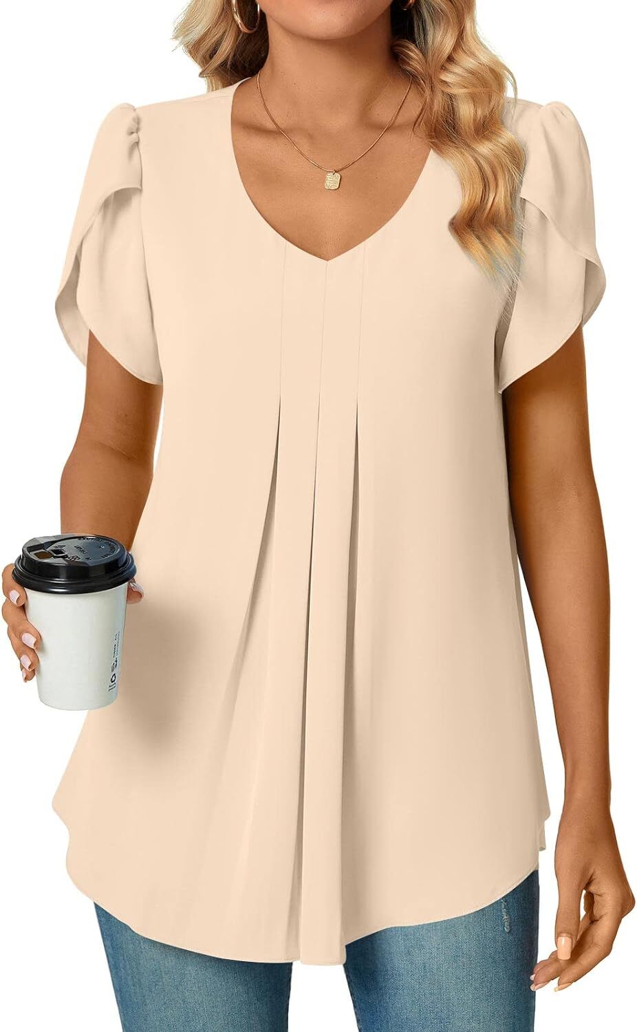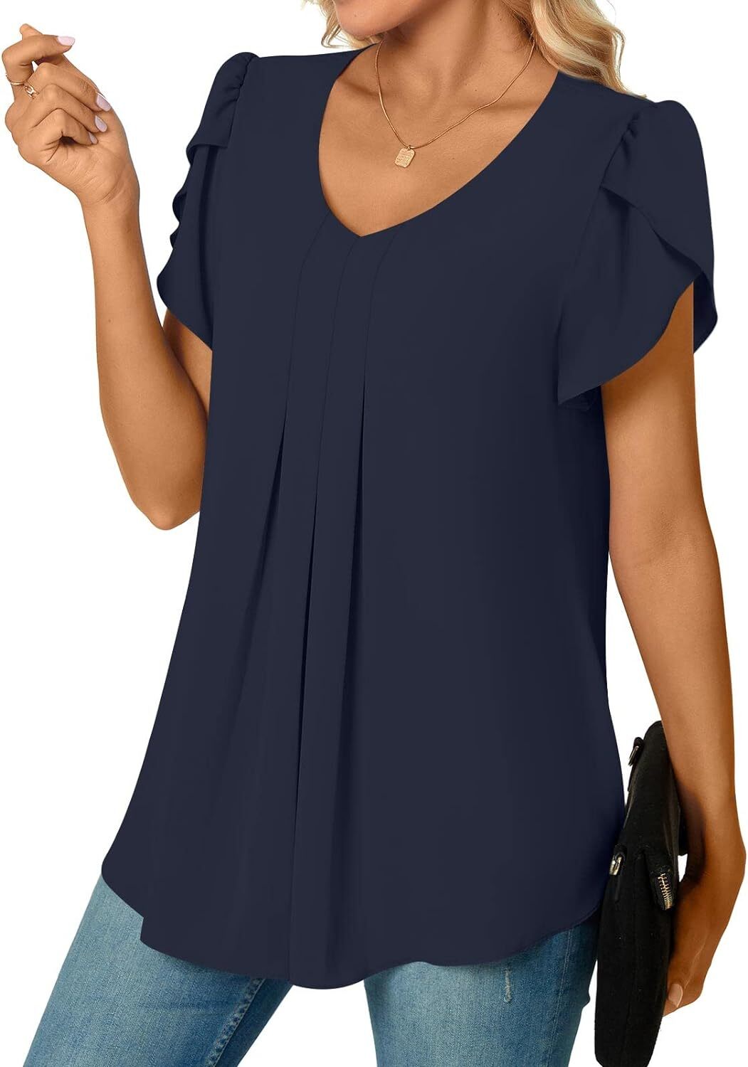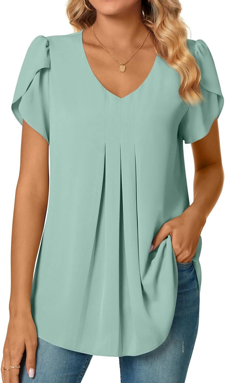 • Bestbee Women's Dressy Chiffon Blouse Shirts Pleated Tunic Tops V Neck Petal Short Sleeve Casual T-Shirts 2024 Summer Tops