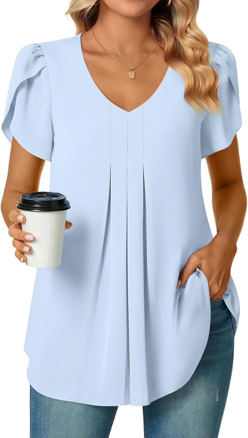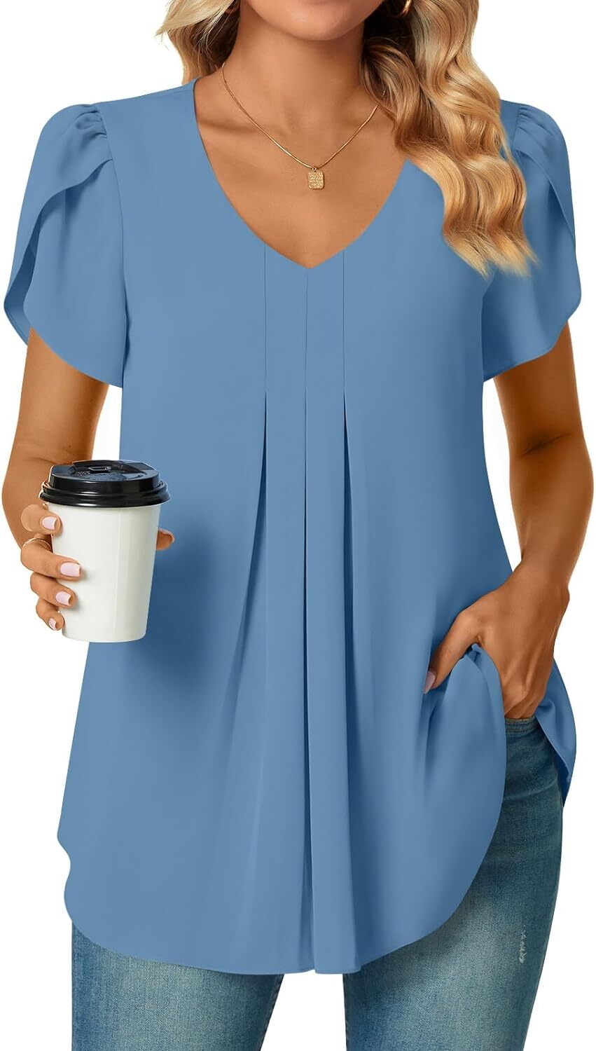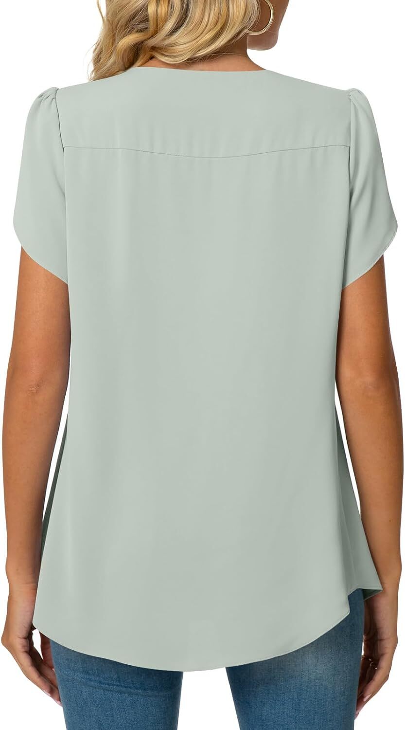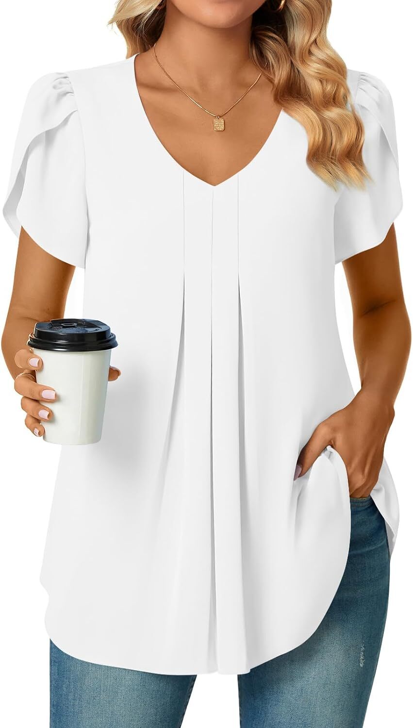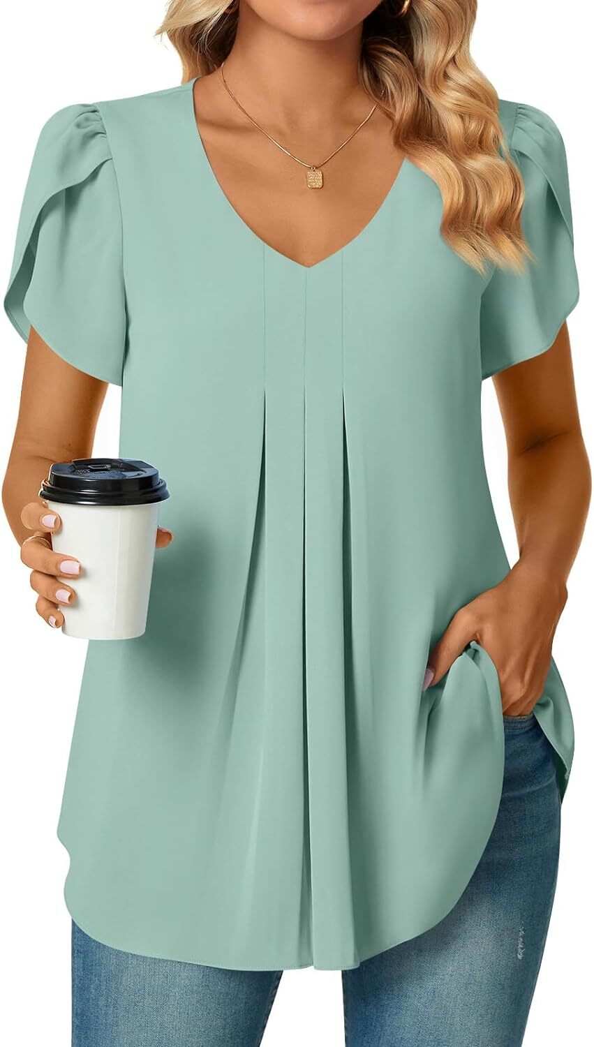 • Bestbee Women's Dressy Chiffon Blouse Shirts Pleated Tunic Tops V Neck Petal Short Sleeve Casual T-Shirts 2024 Summer Tops