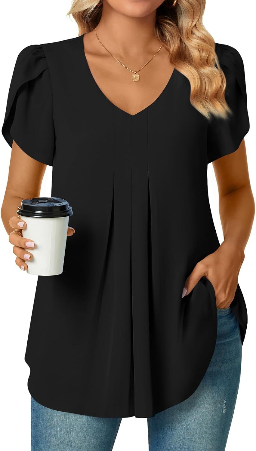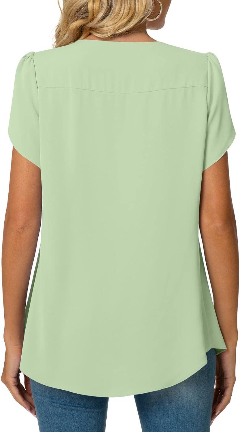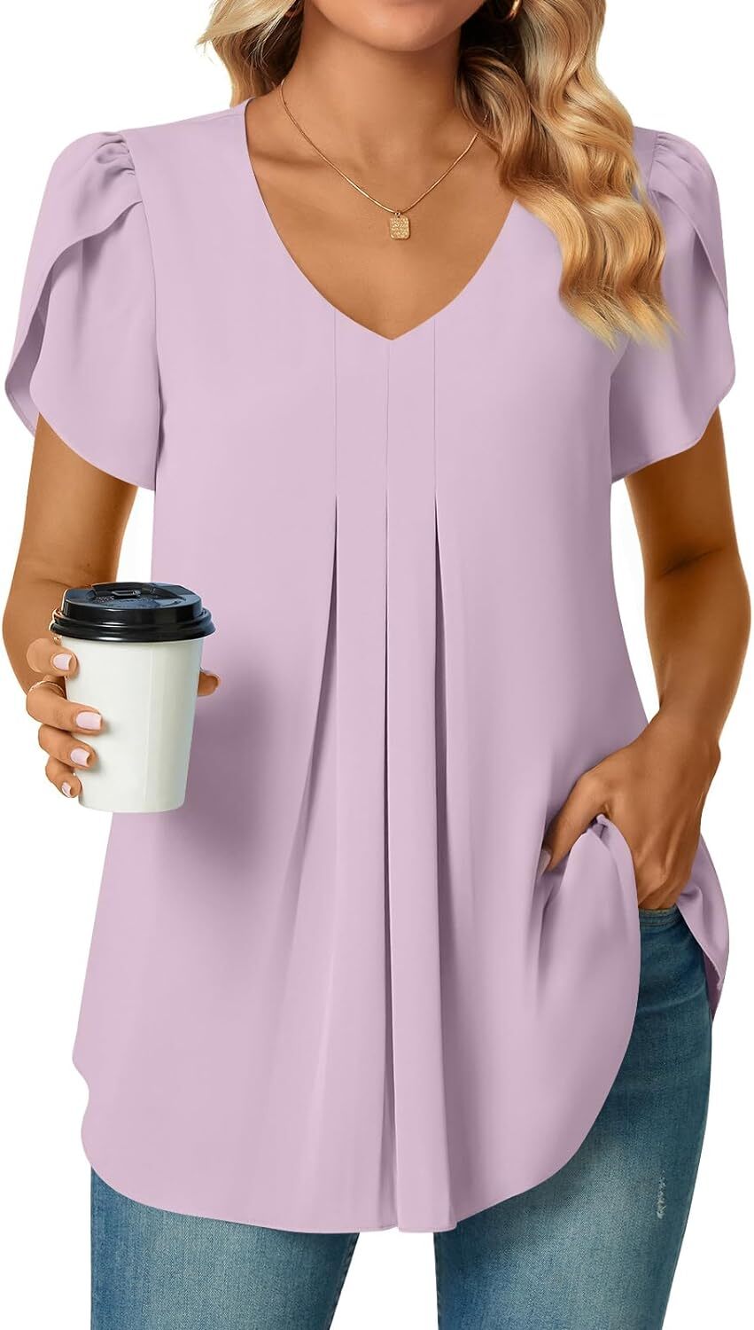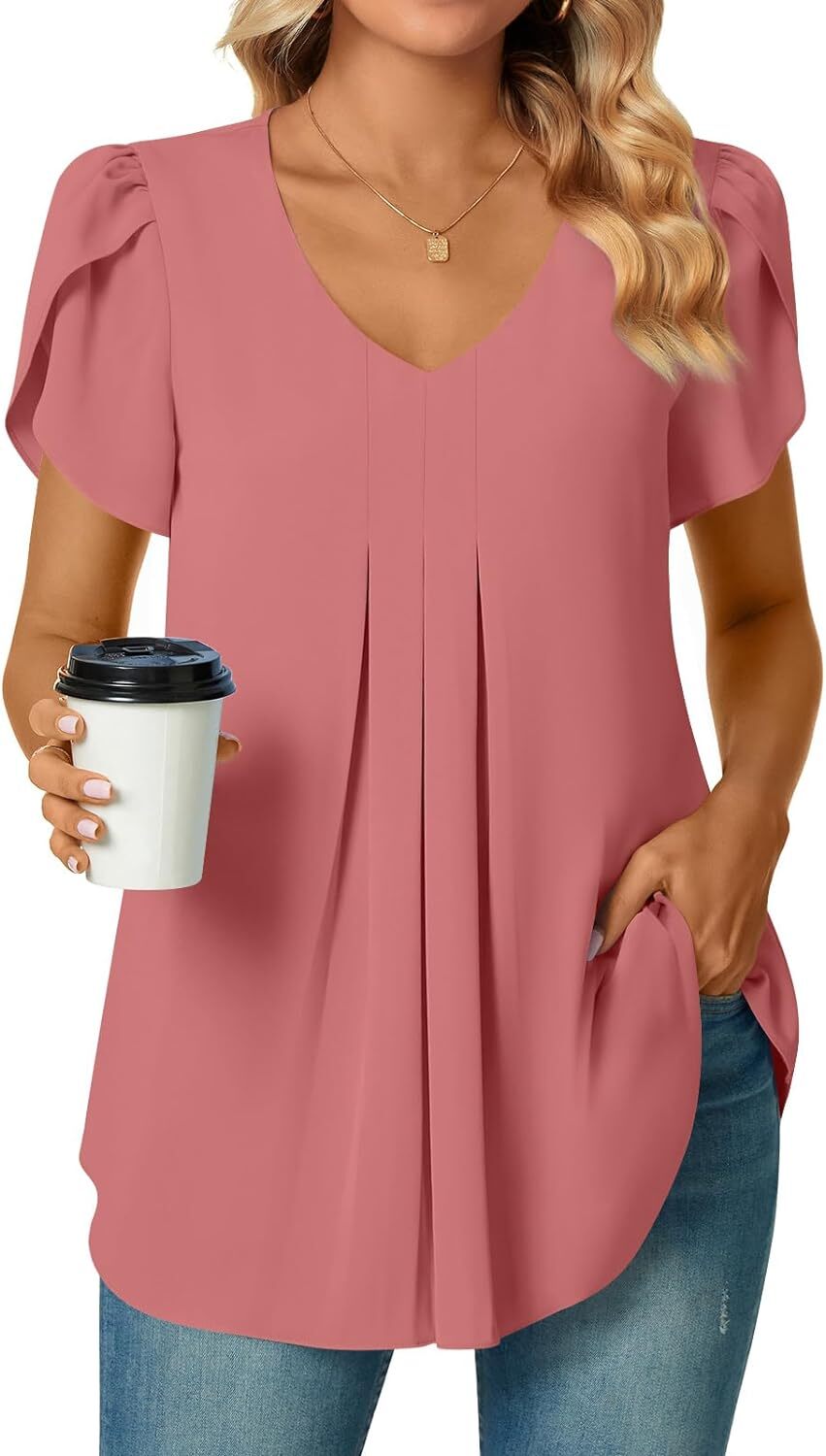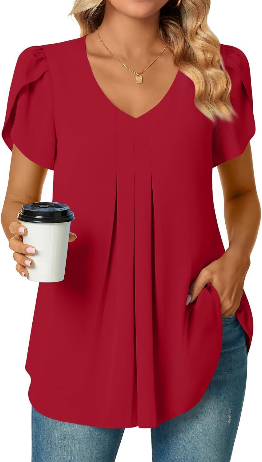 • Bestbee Women's Dressy Chiffon Blouse Shirts Pleated Tunic Tops V Neck Petal Short Sleeve Casual T-Shirts 2024 Summer Tops