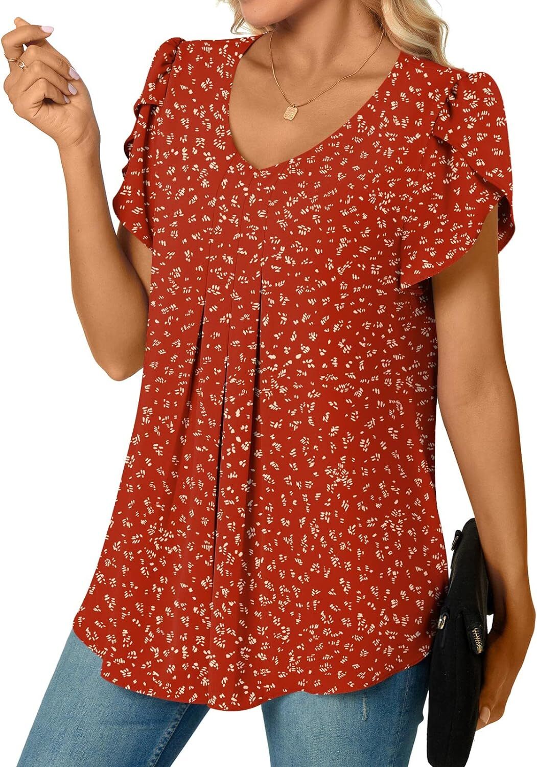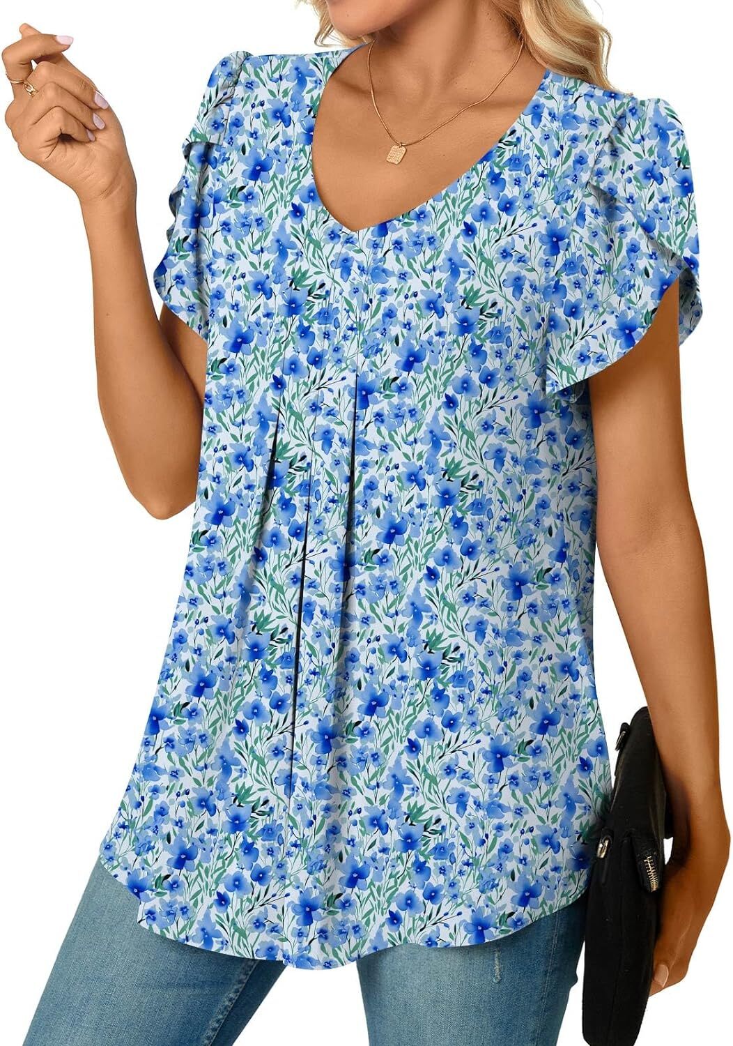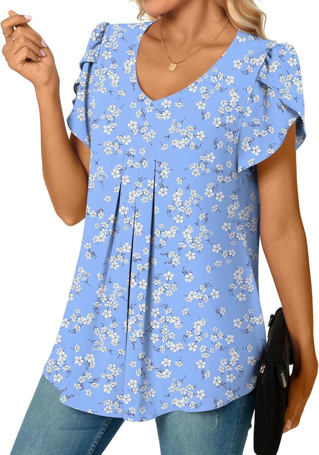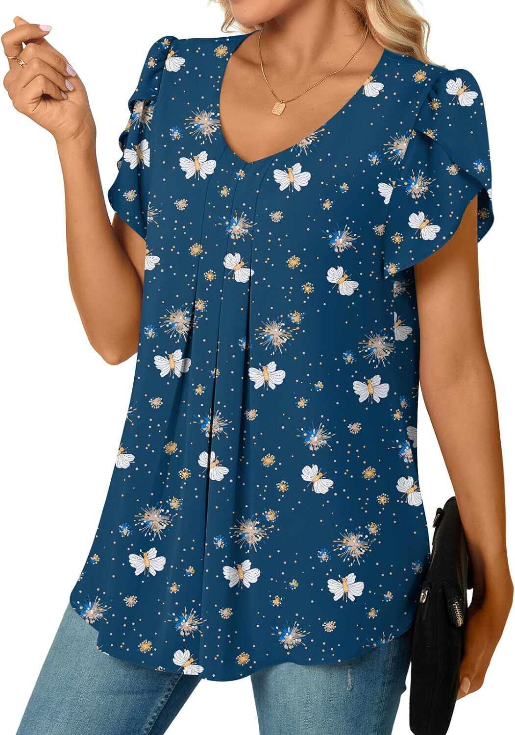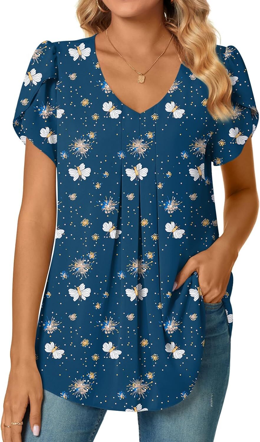 • Bestbee Women's Dressy Chiffon Blouse Shirts Pleated Tunic Tops V Neck Petal Short Sleeve Casual T-Shirts 2024 Summer Tops