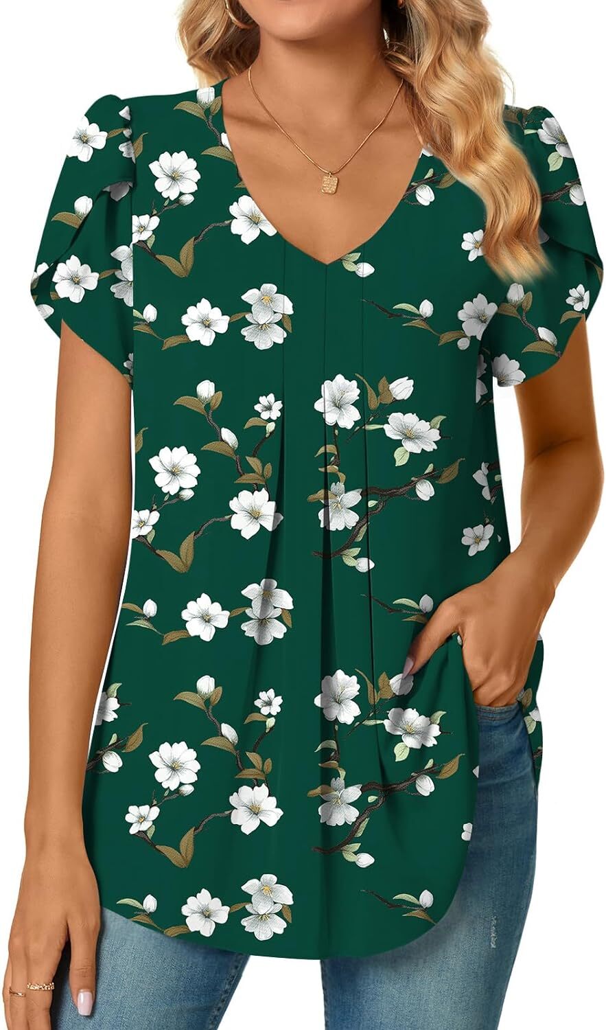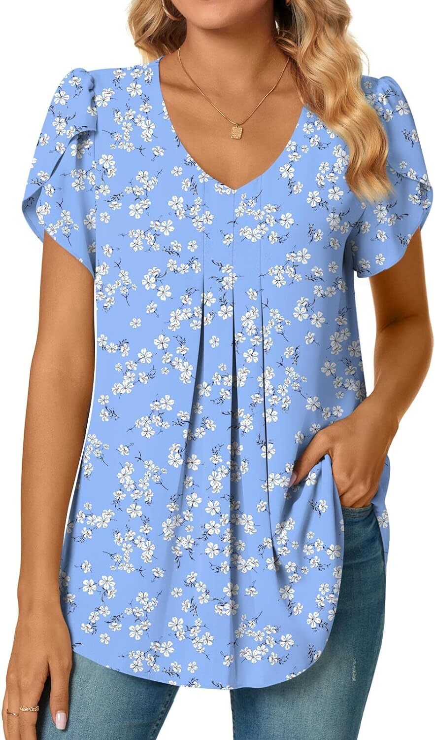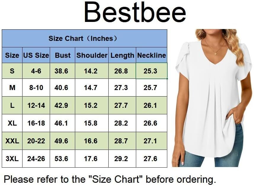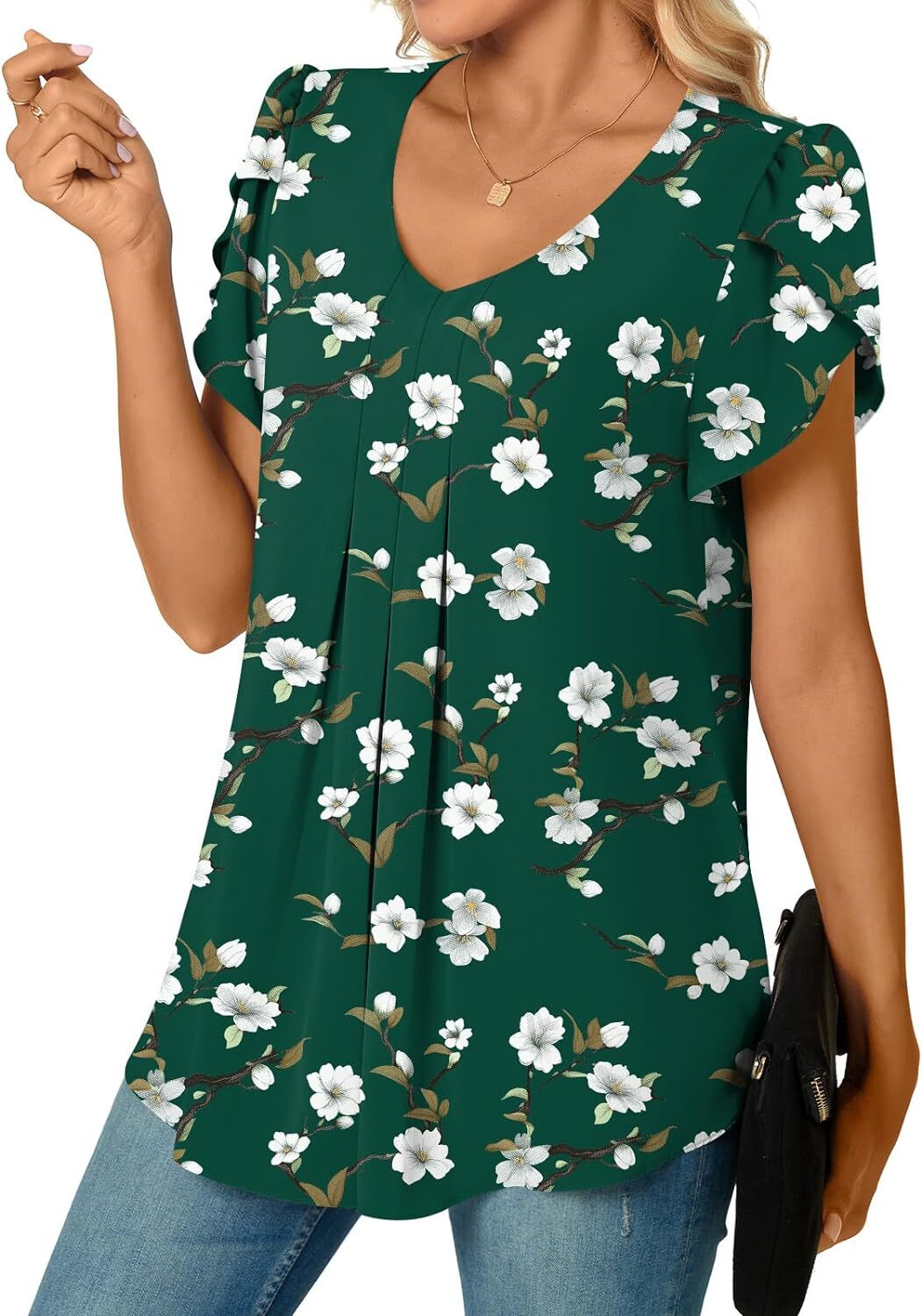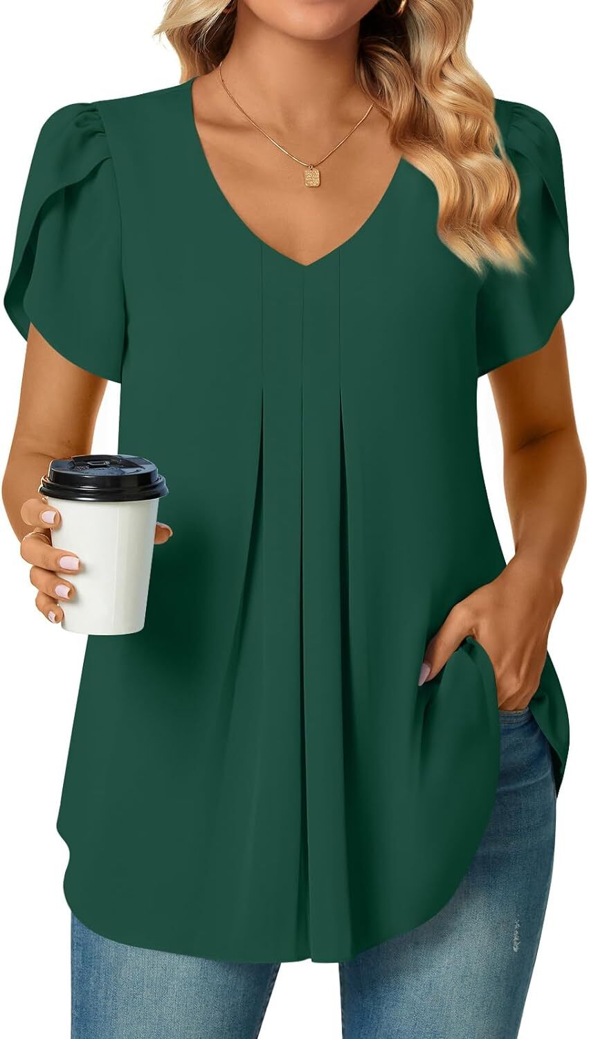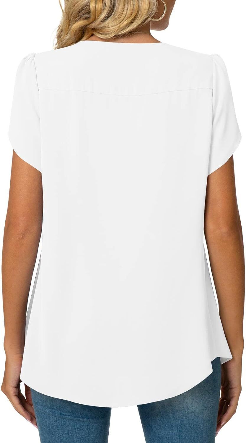 • Bestbee Women's Dressy Chiffon Blouse Shirts Pleated Tunic Tops V Neck Petal Short Sleeve Casual T-Shirts 2024 Summer Tops