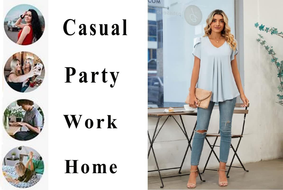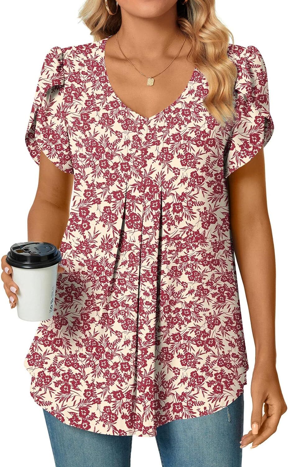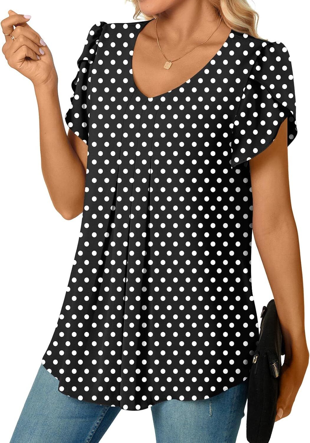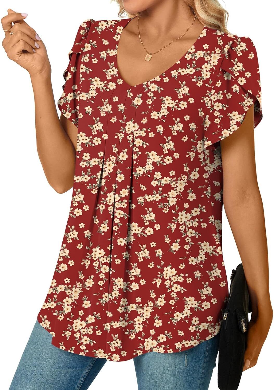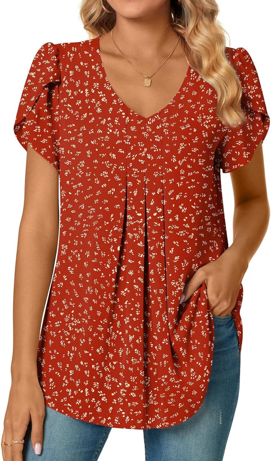 • Bestbee Women's Dressy Chiffon Blouse Shirts Pleated Tunic Tops V Neck Petal Short Sleeve Casual T-Shirts 2024 Summer Tops