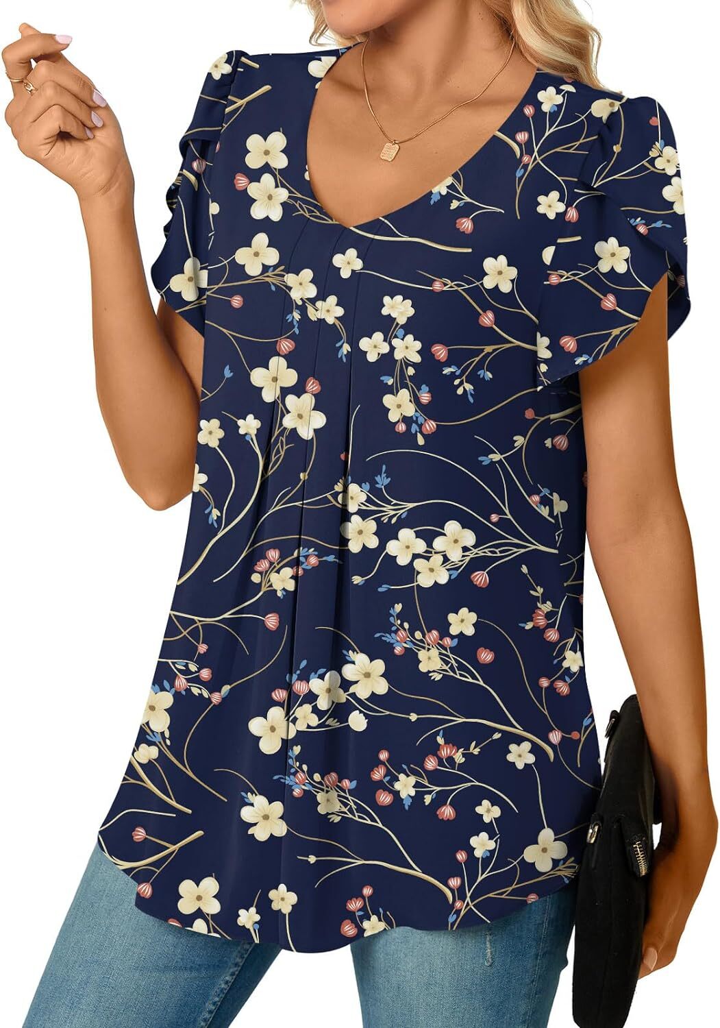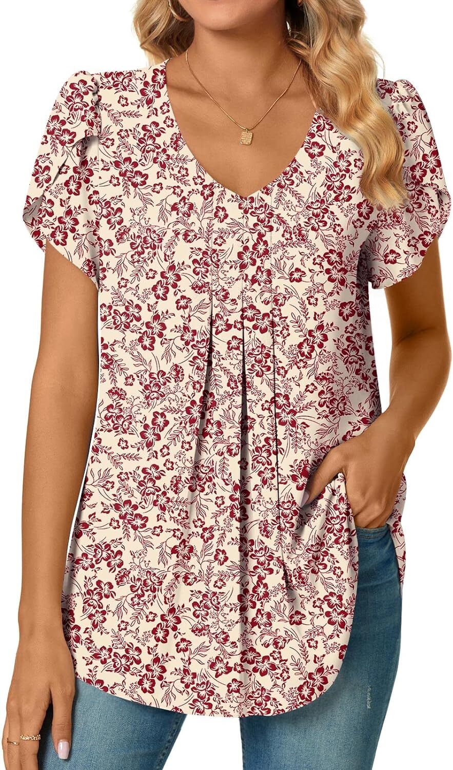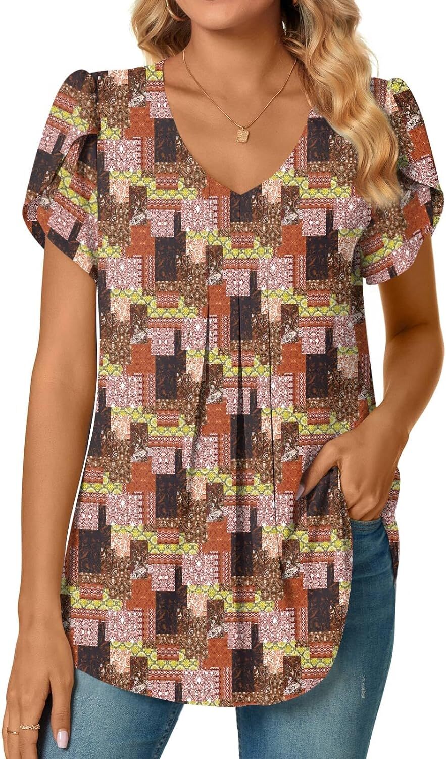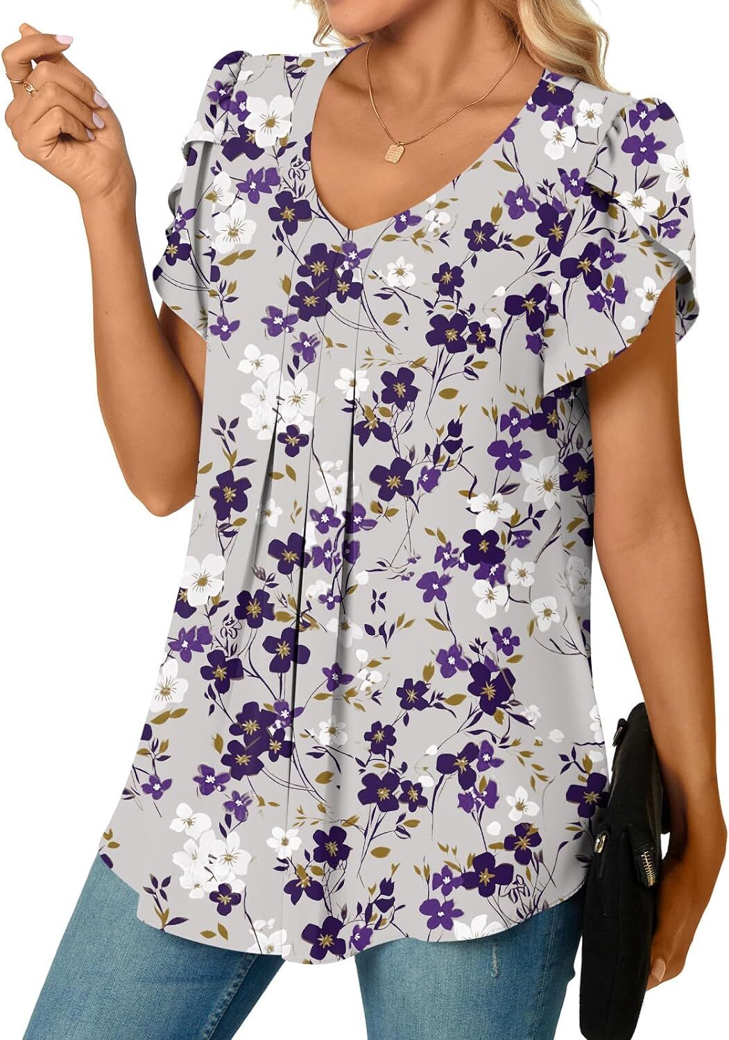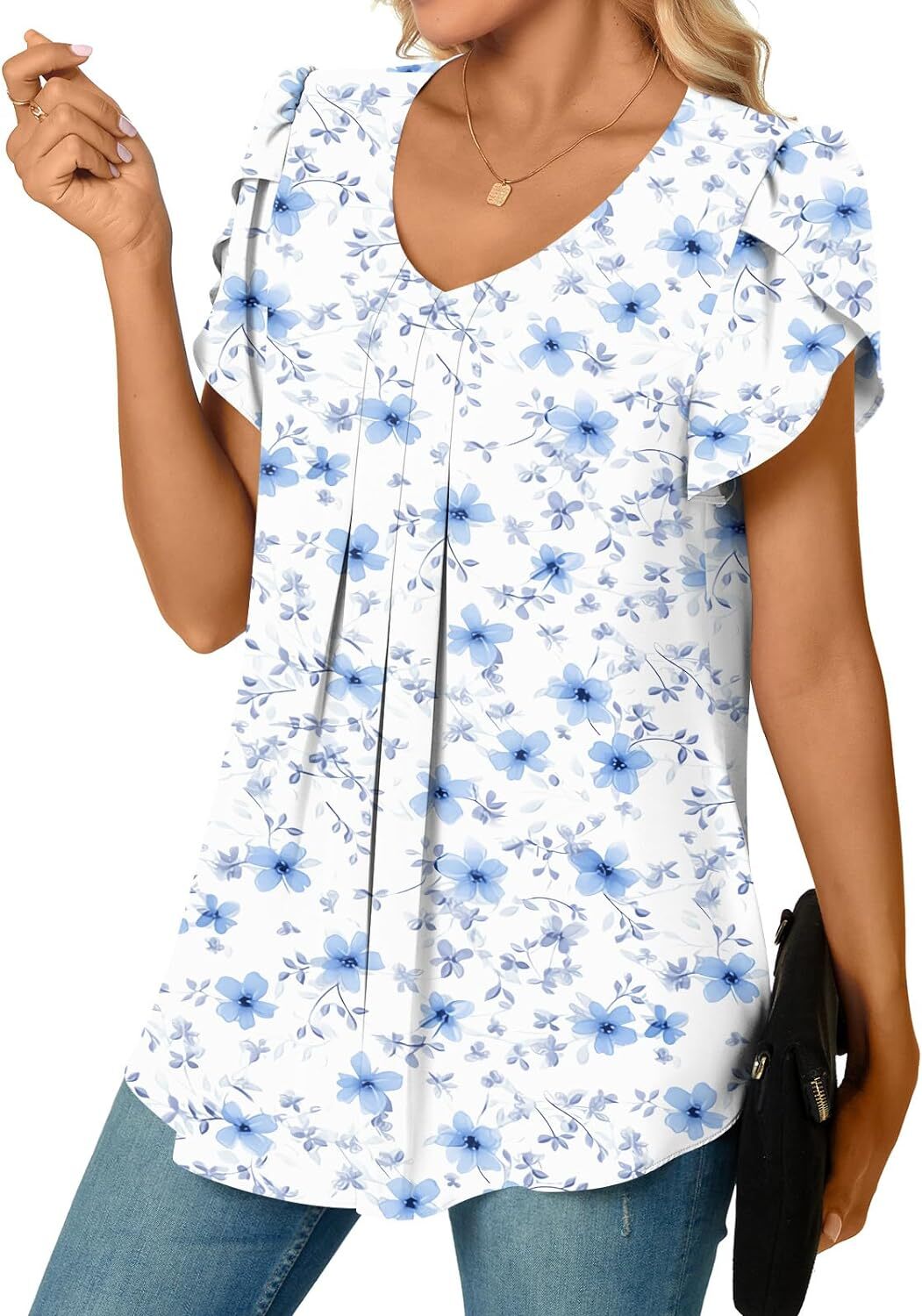 • Bestbee Women's Dressy Chiffon Blouse Shirts Pleated Tunic Tops V Neck Petal Short Sleeve Casual T-Shirts 2024 Summer Tops
