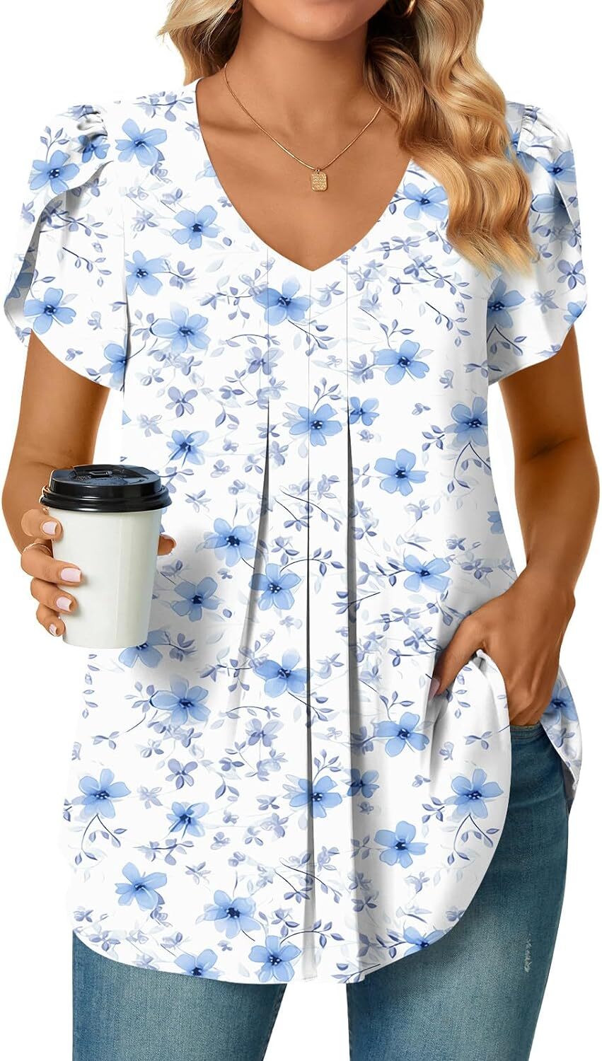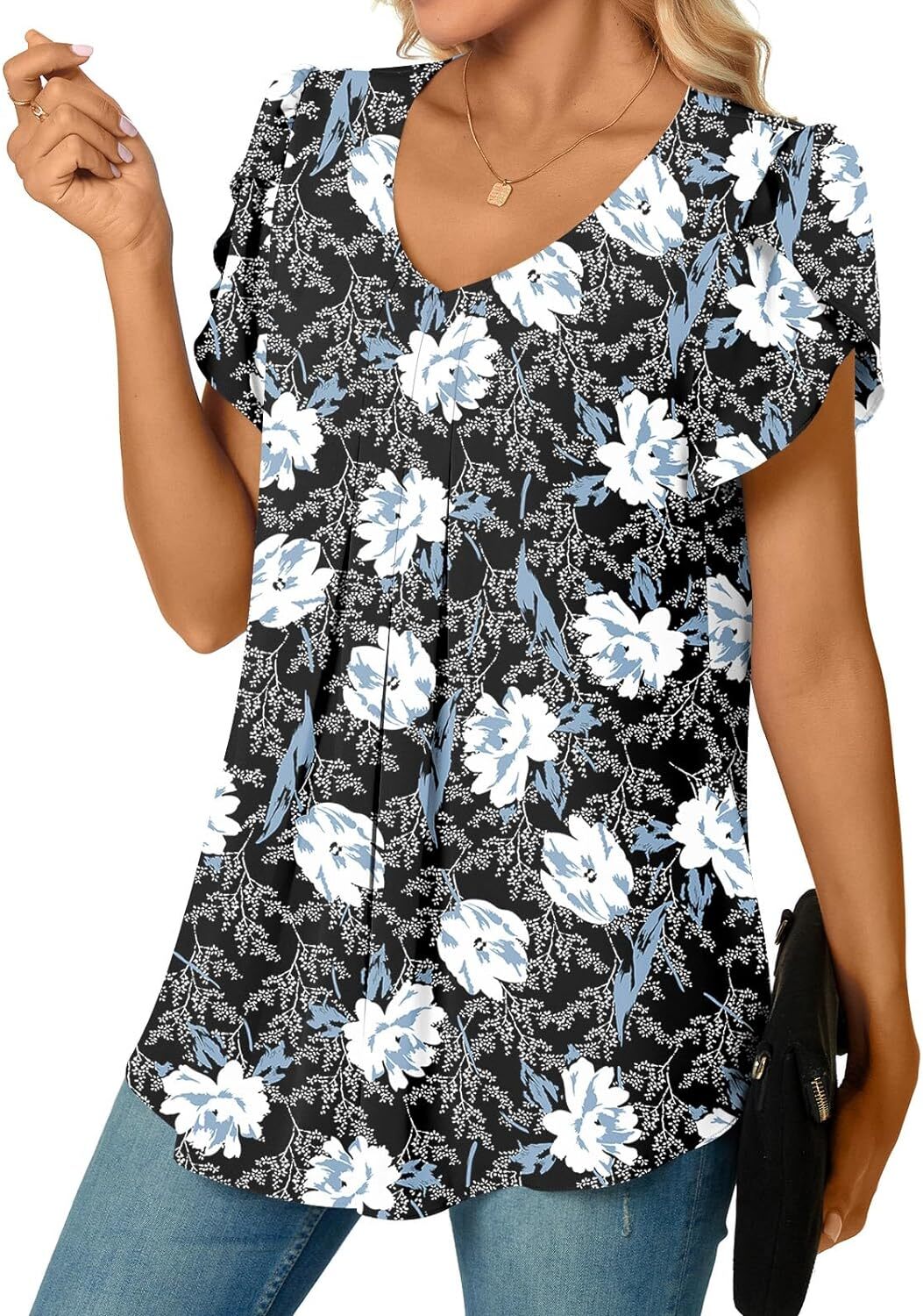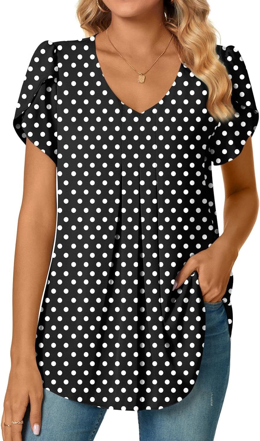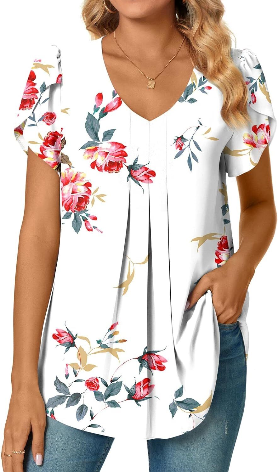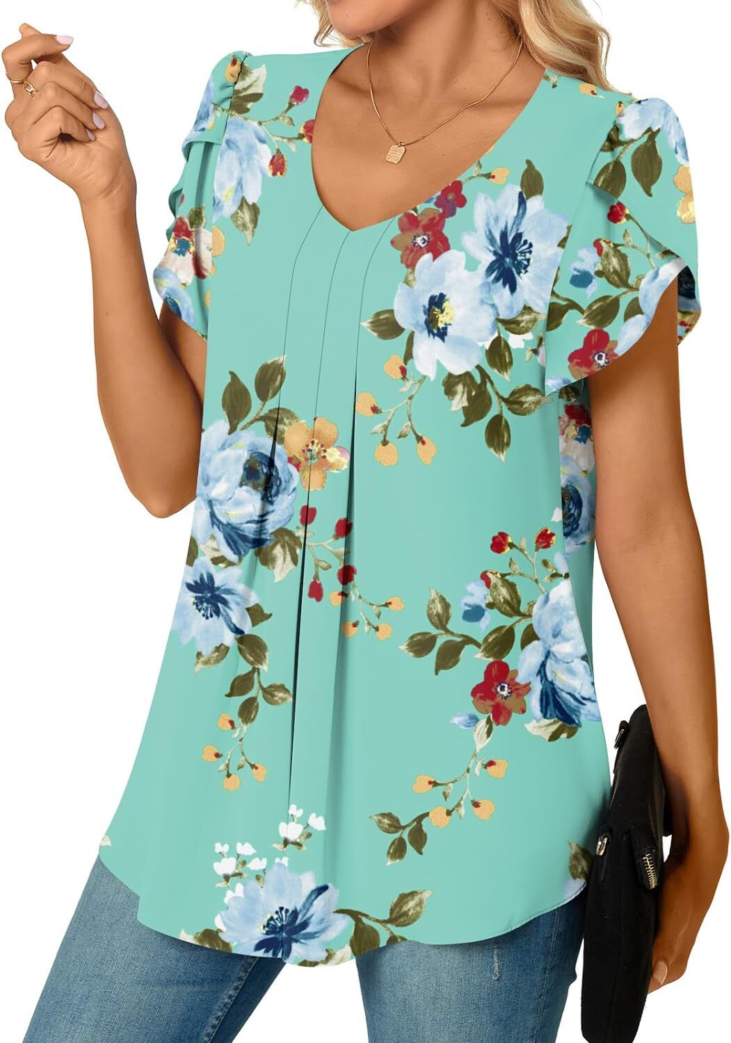 • Bestbee Women's Dressy Chiffon Blouse Shirts Pleated Tunic Tops V Neck Petal Short Sleeve Casual T-Shirts 2024 Summer Tops