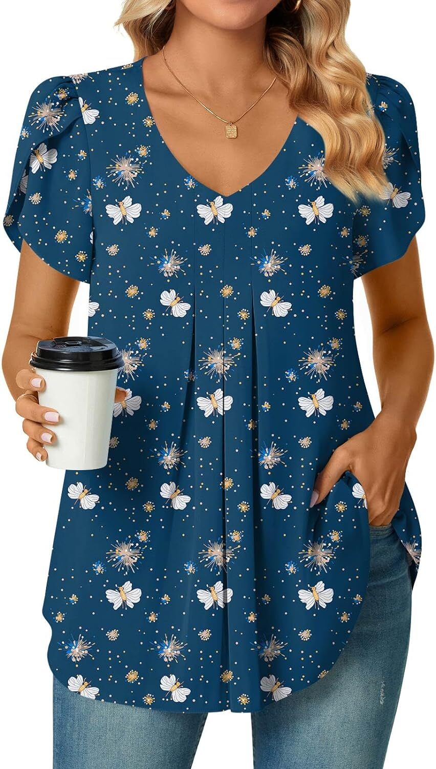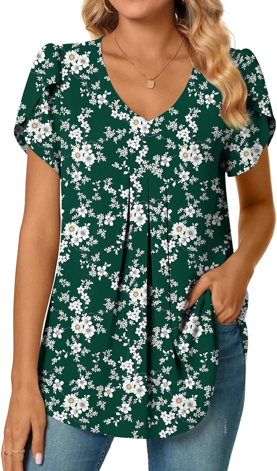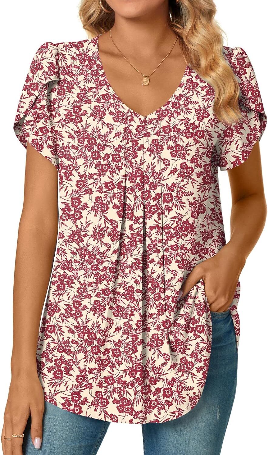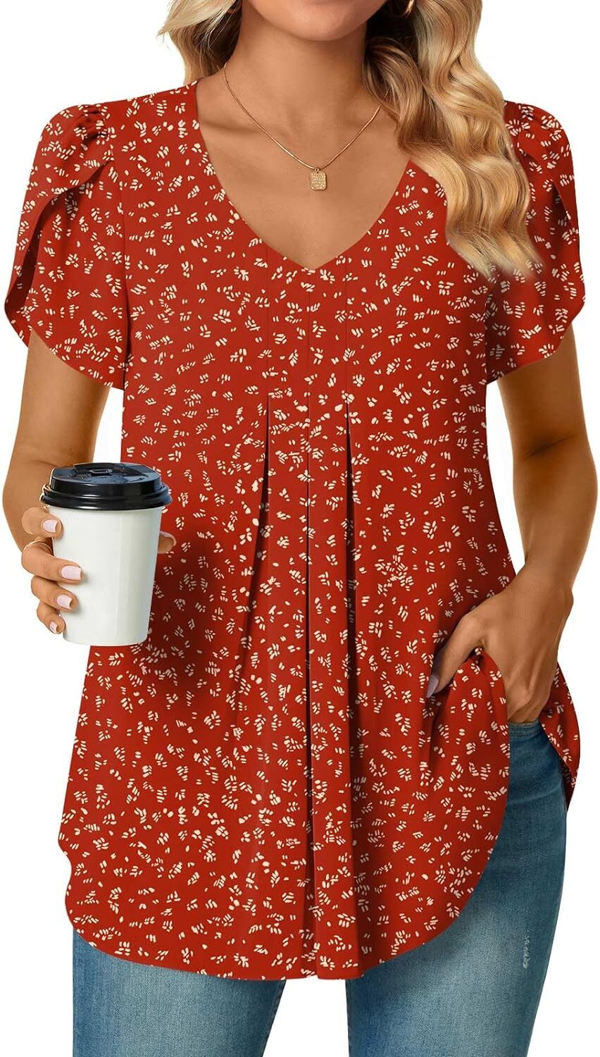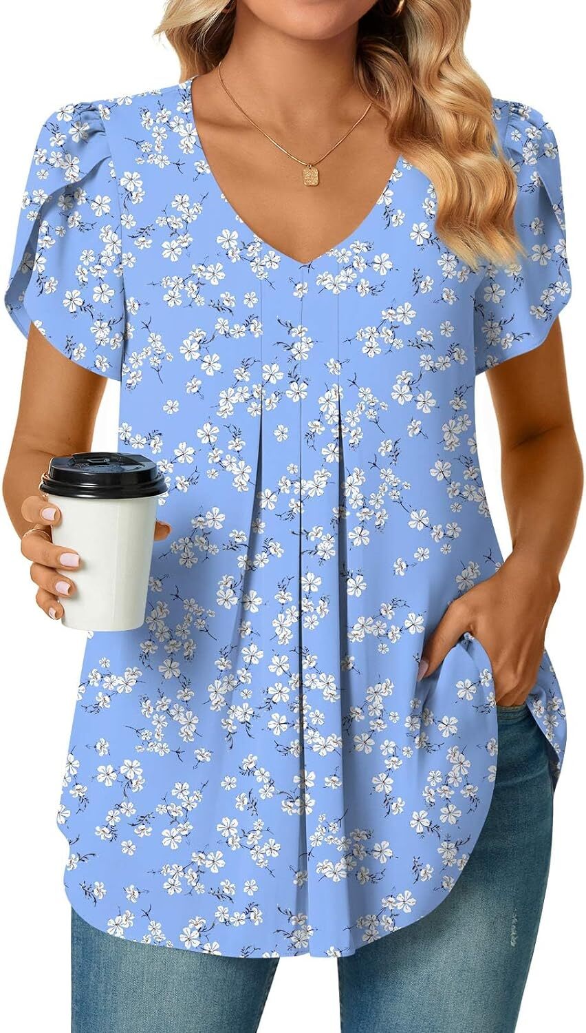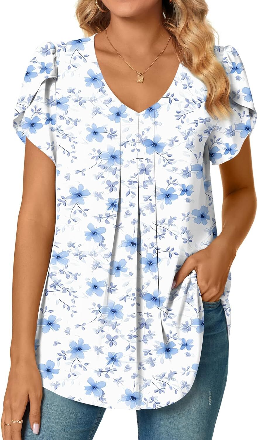 • Bestbee Women's Dressy Chiffon Blouse Shirts Pleated Tunic Tops V Neck Petal Short Sleeve Casual T-Shirts 2024 Summer Tops