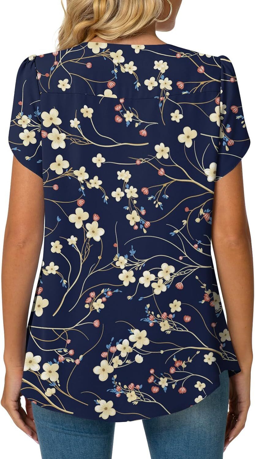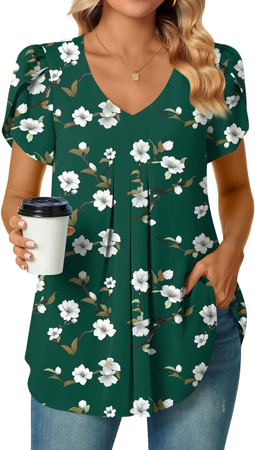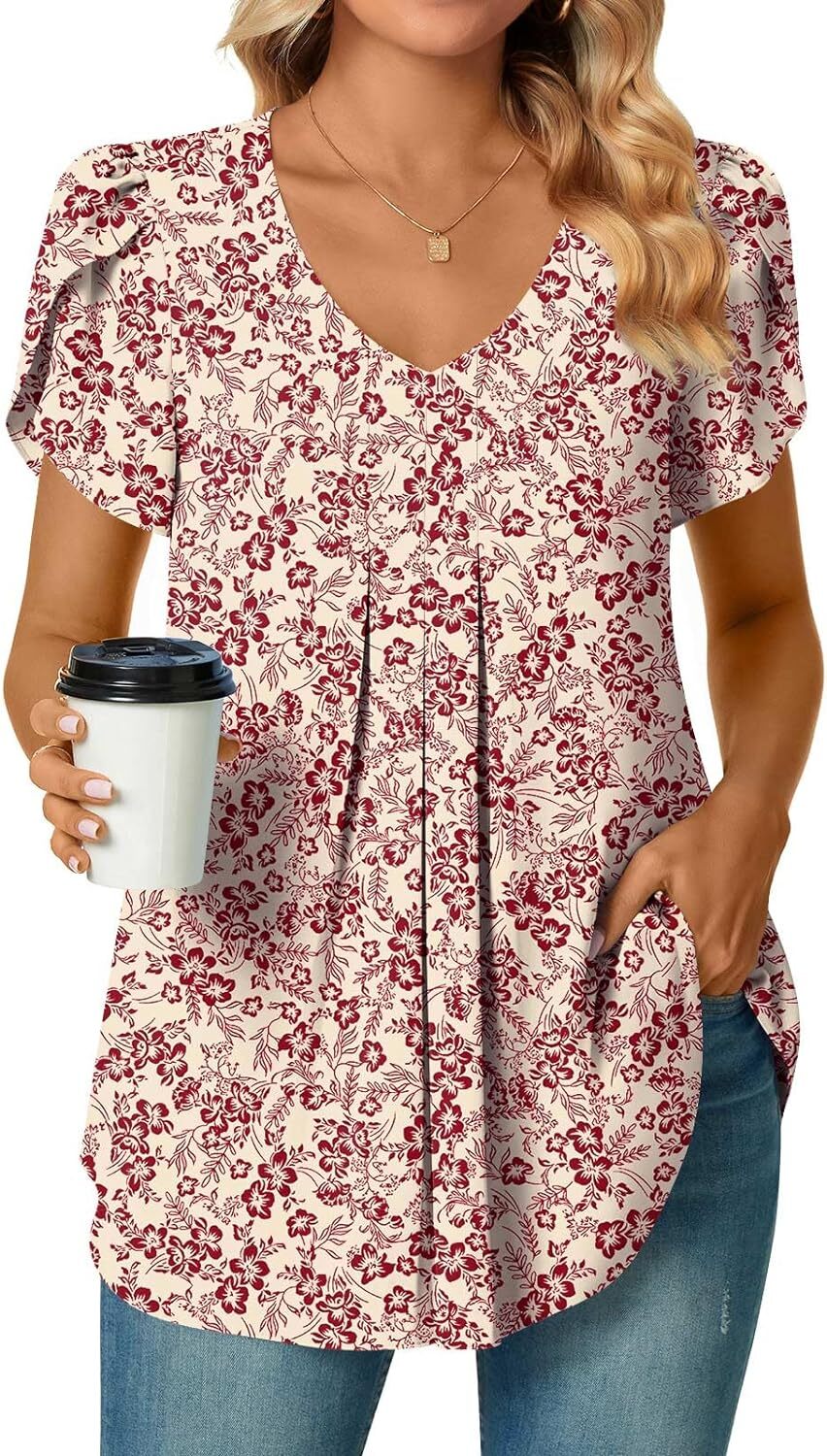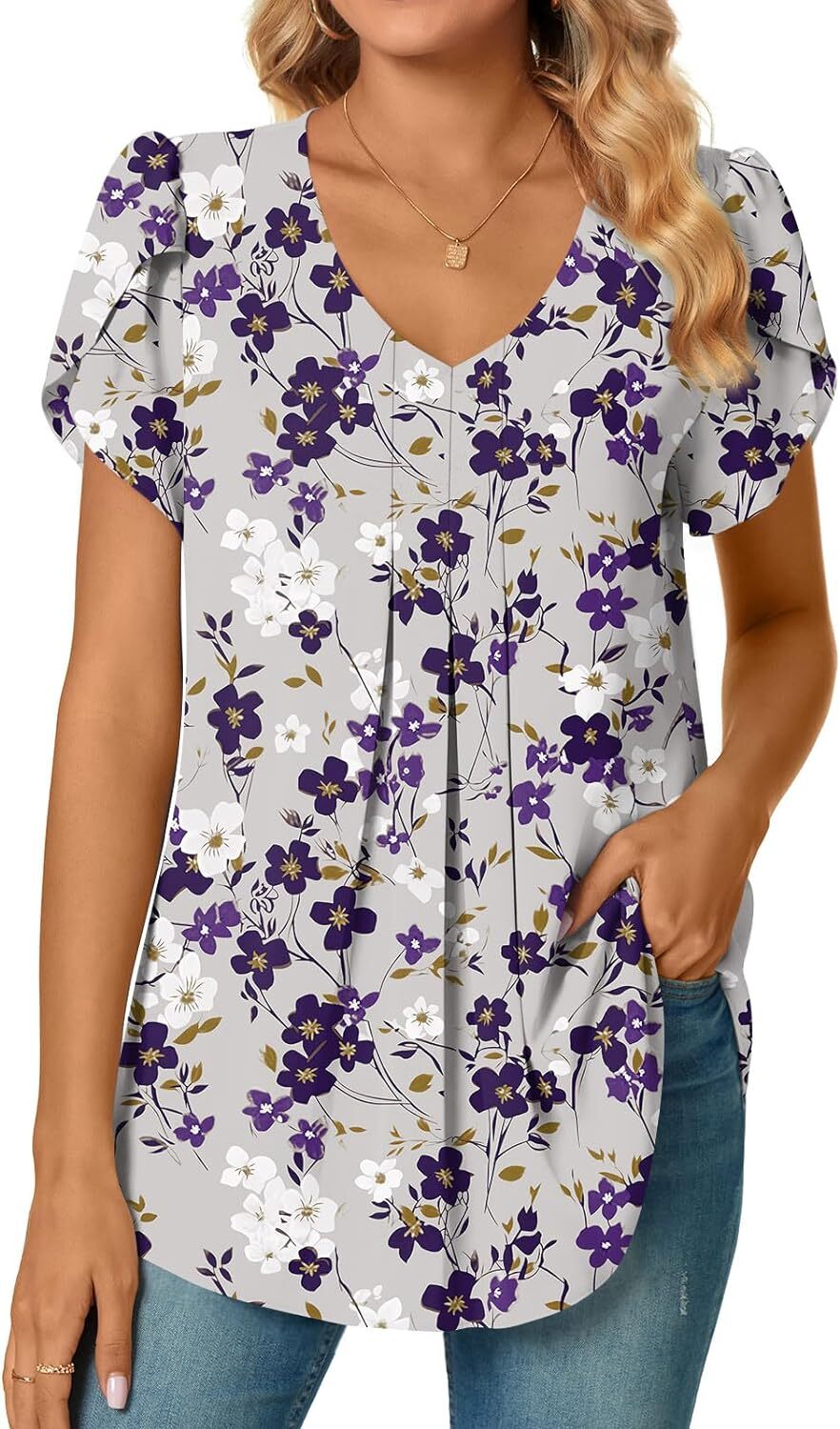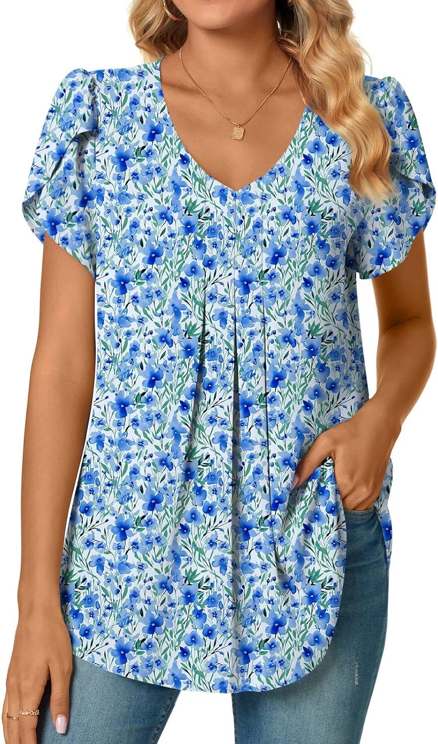 • Bestbee Women's Dressy Chiffon Blouse Shirts Pleated Tunic Tops V Neck Petal Short Sleeve Casual T-Shirts 2024 Summer Tops