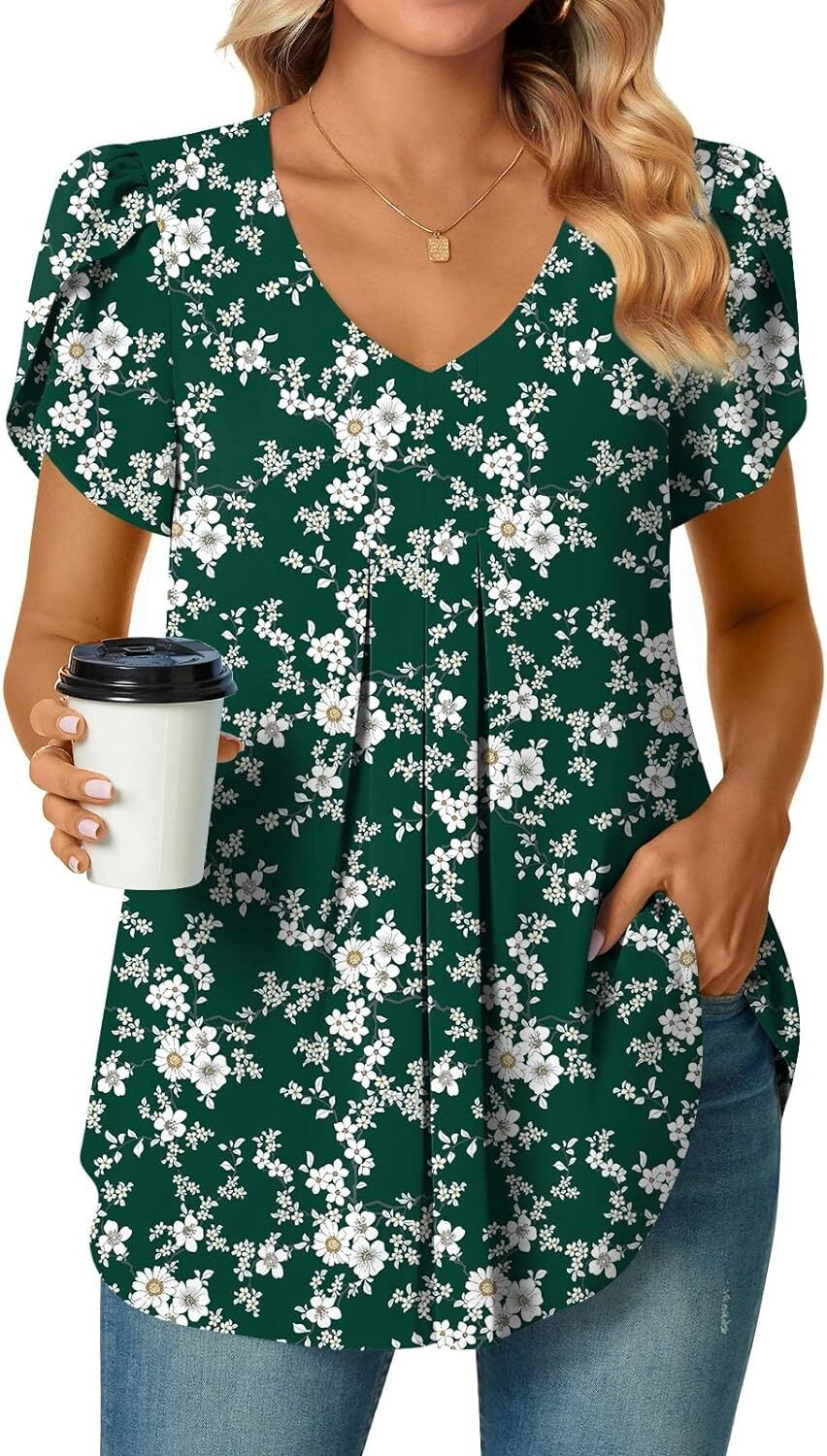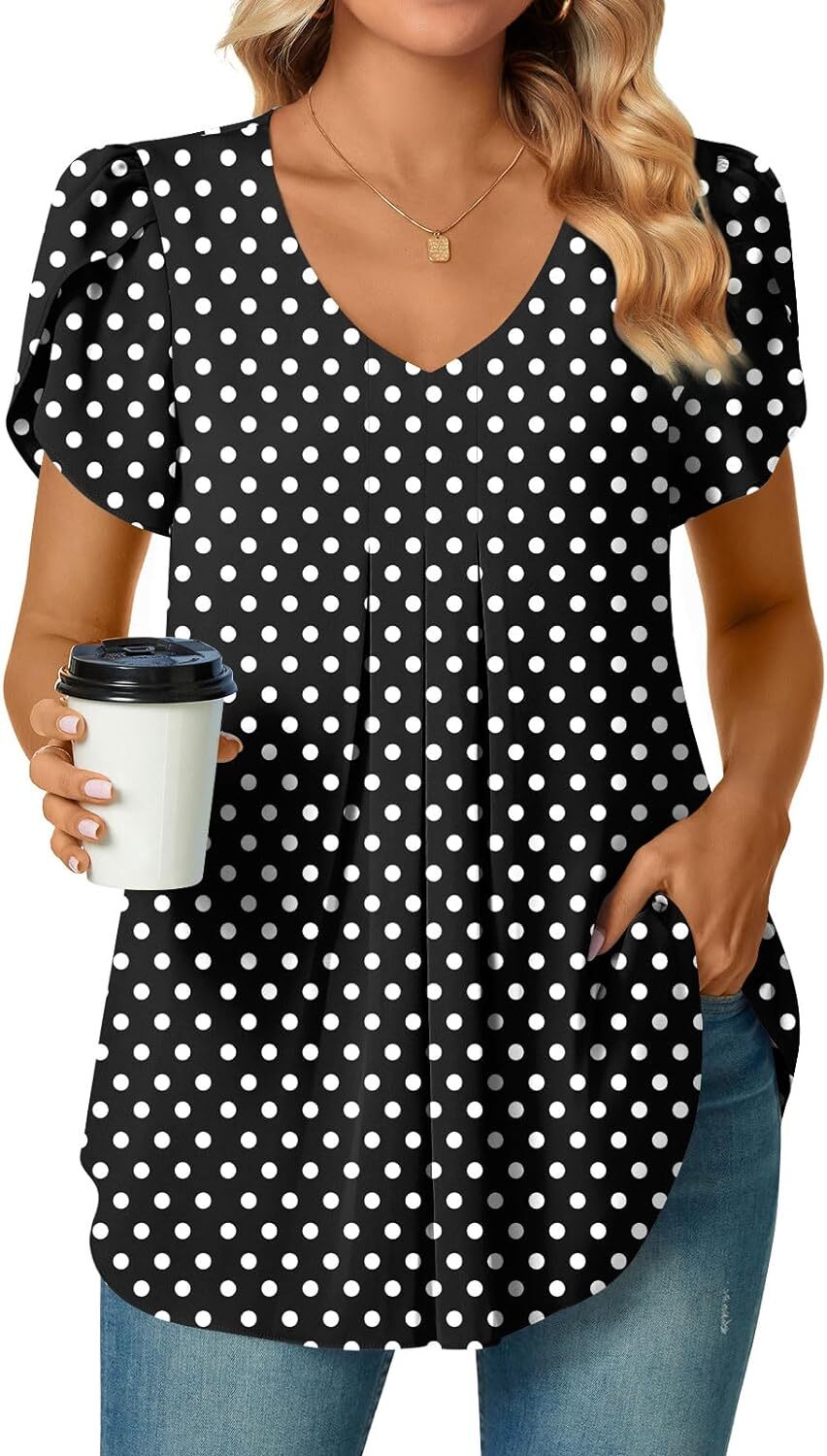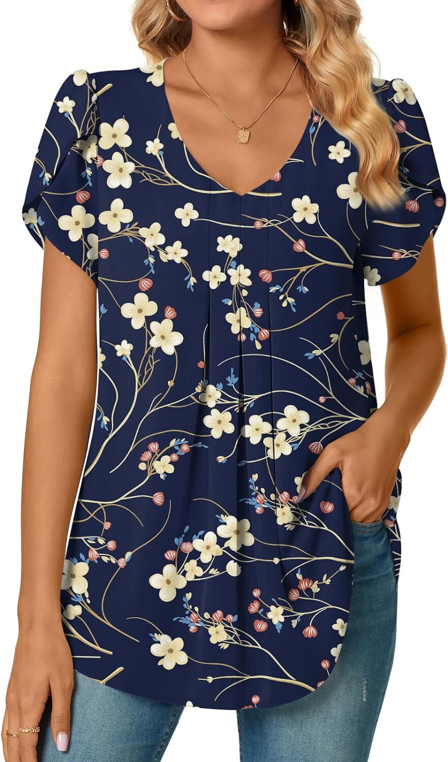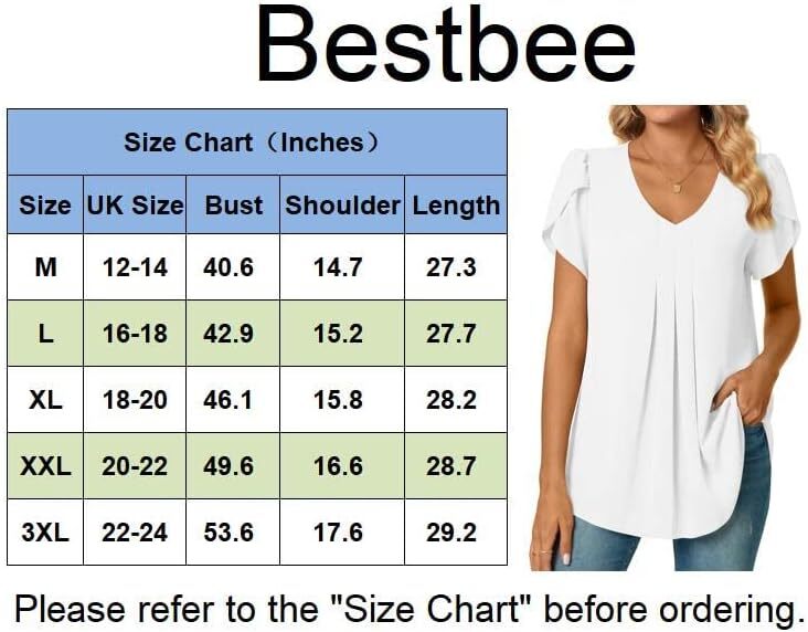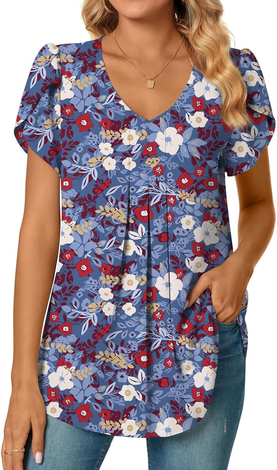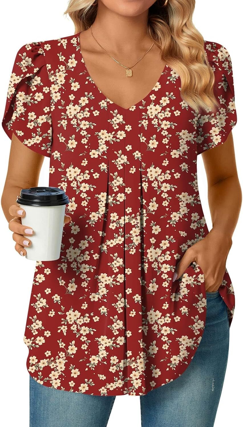 • Bestbee Women's Dressy Chiffon Blouse Shirts Pleated Tunic Tops V Neck Petal Short Sleeve Casual T-Shirts 2024 Summer Tops