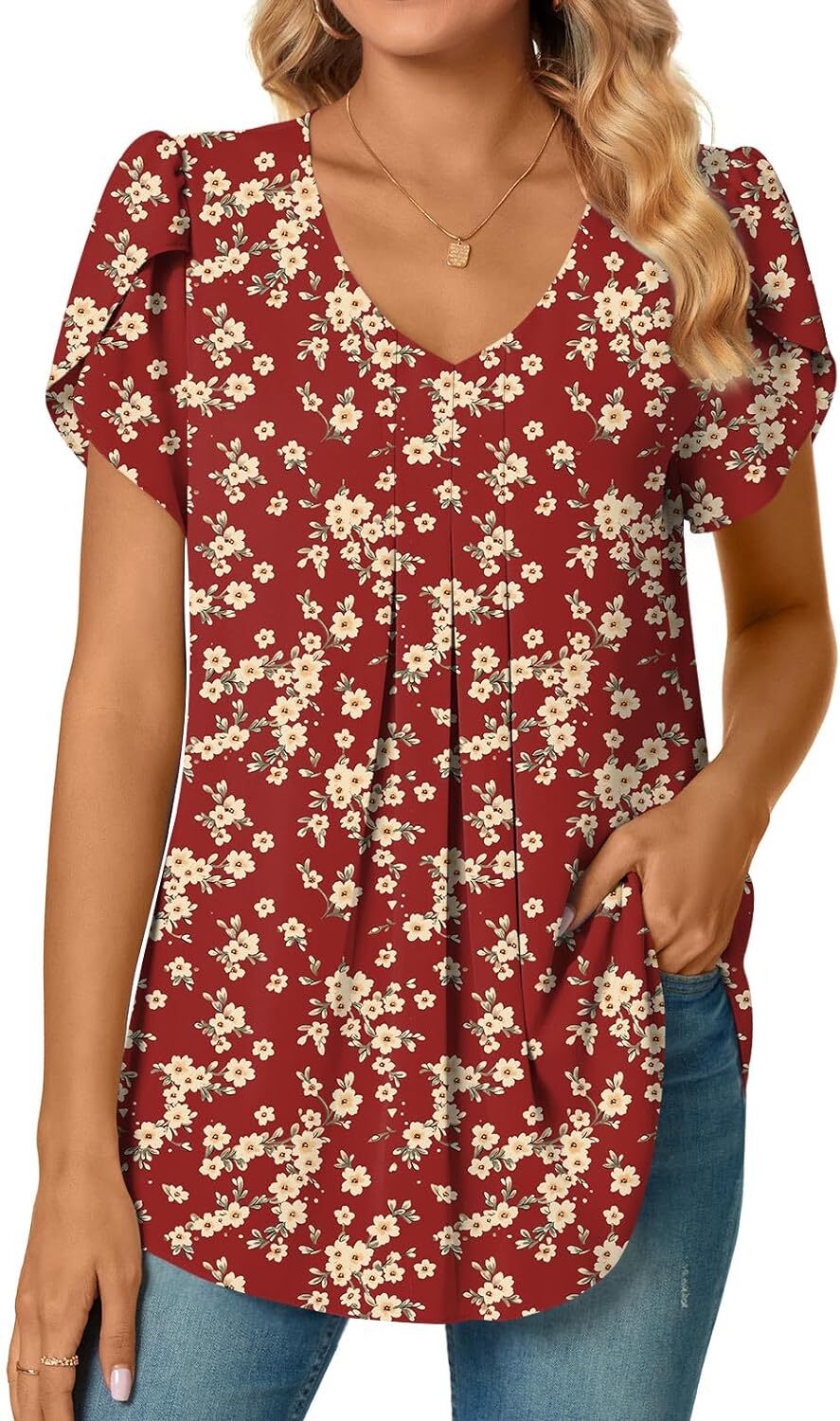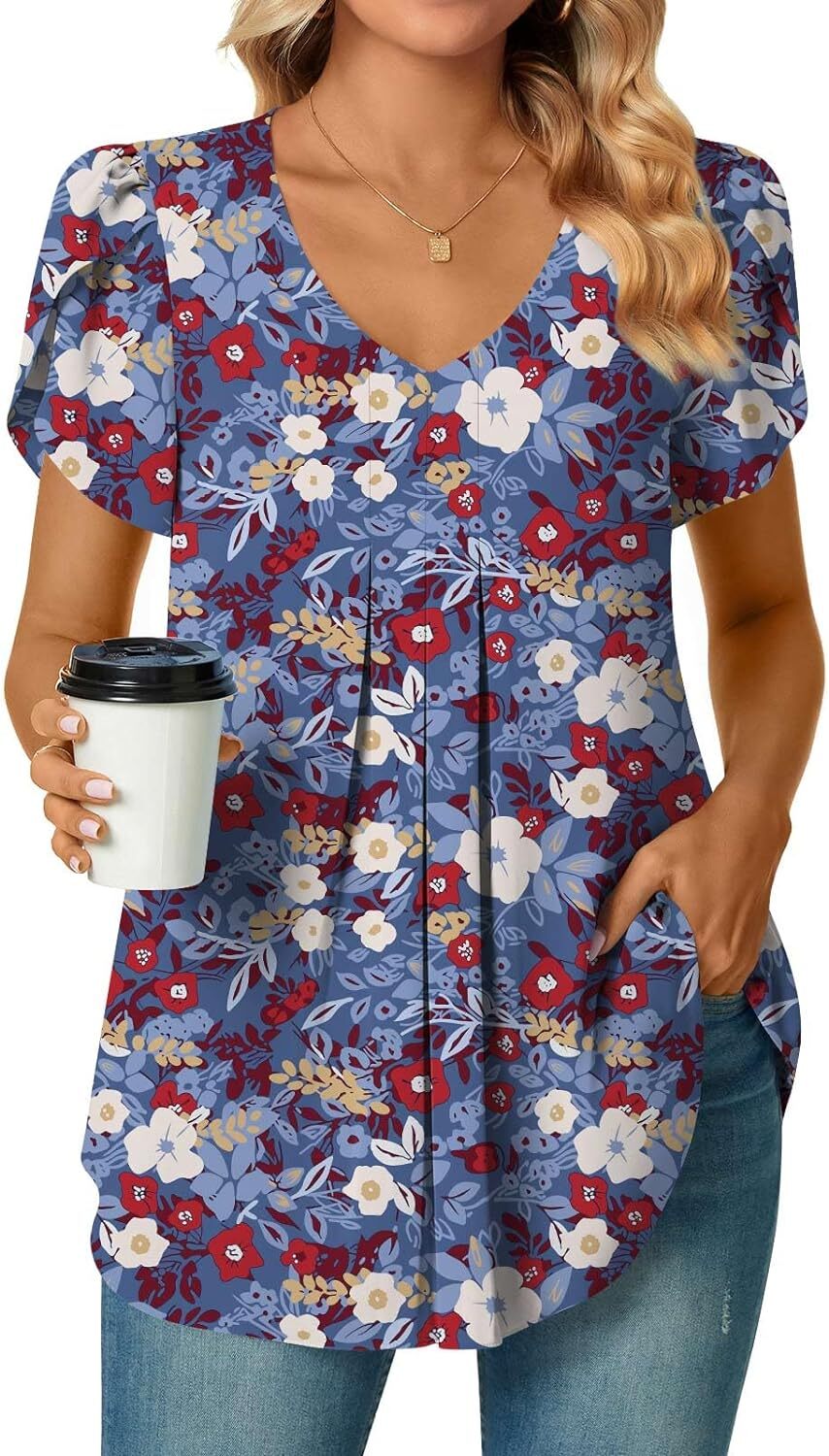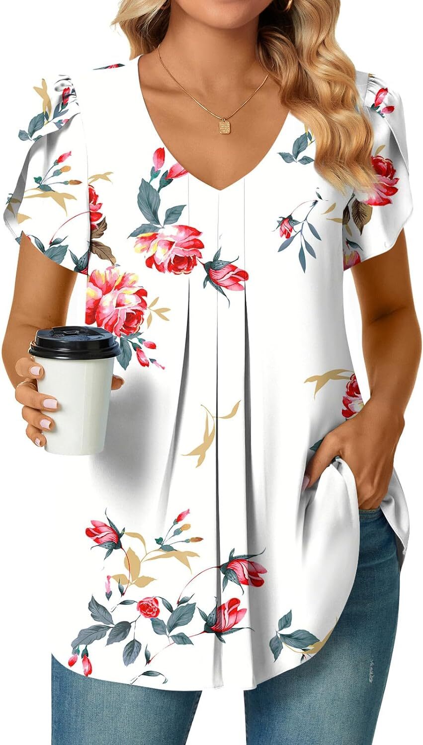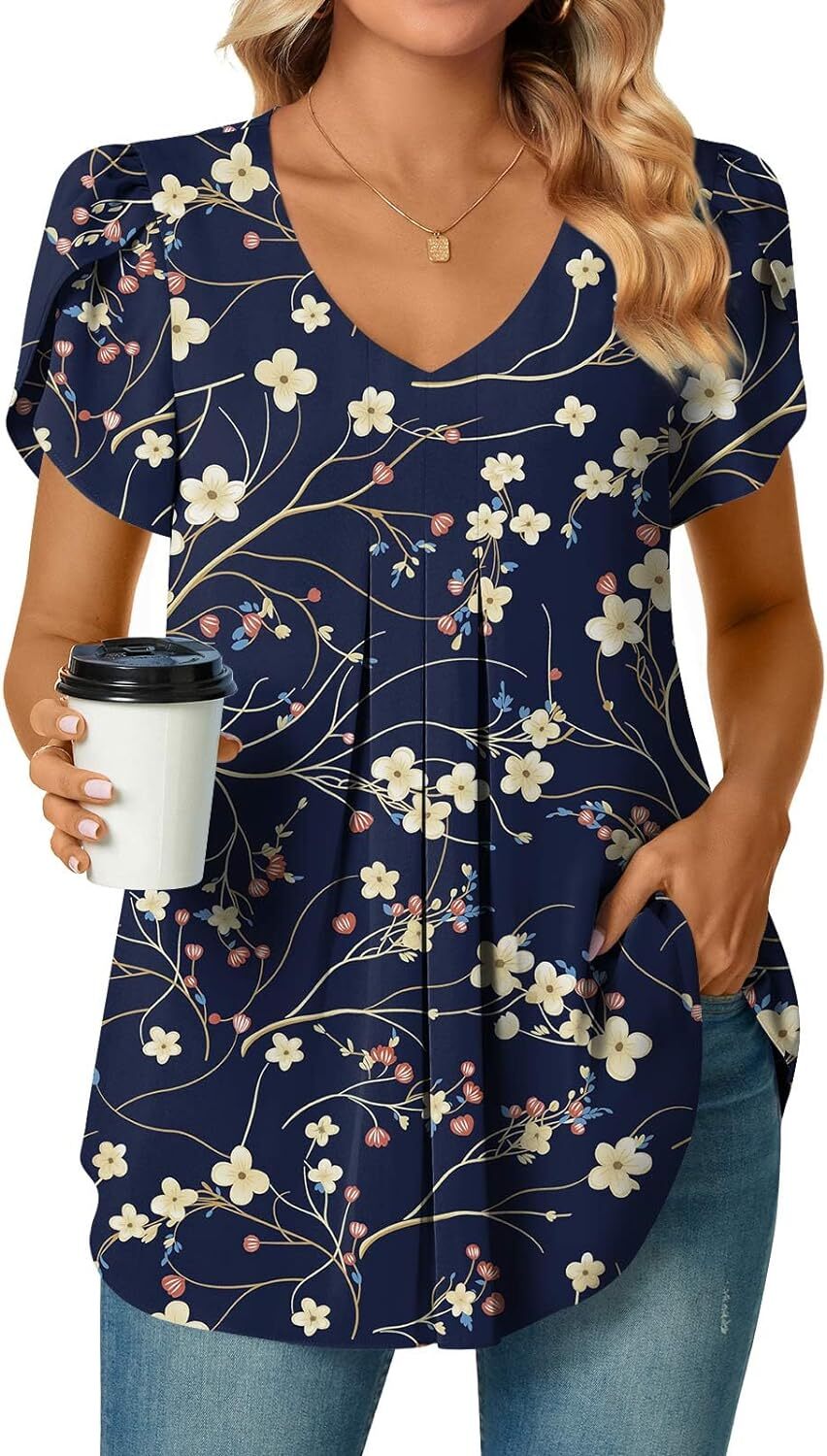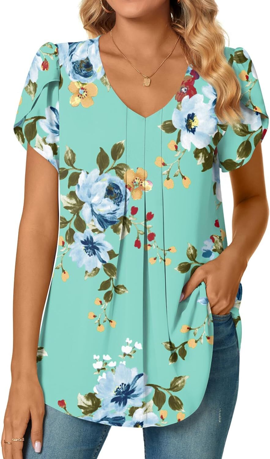 • Bestbee Women's Dressy Chiffon Blouse Shirts Pleated Tunic Tops V Neck Petal Short Sleeve Casual T-Shirts 2024 Summer Tops