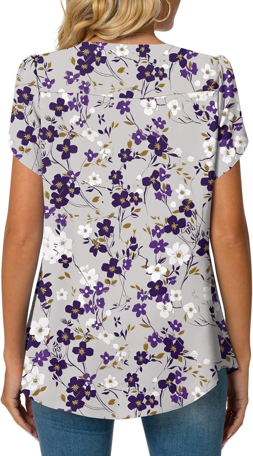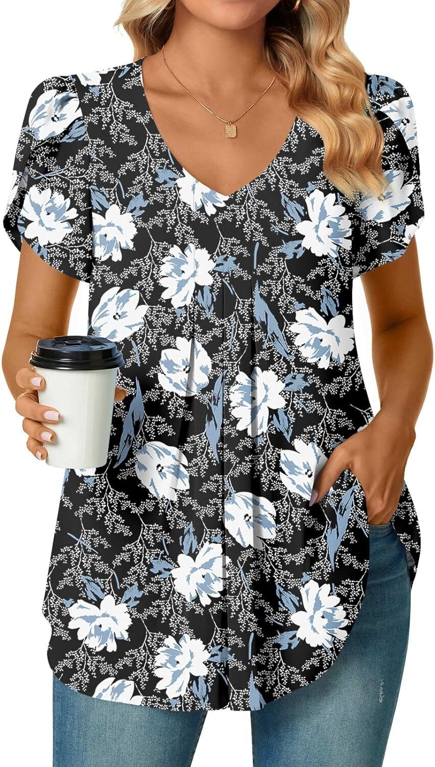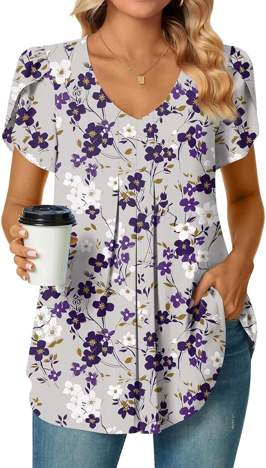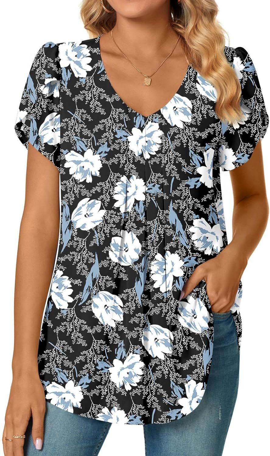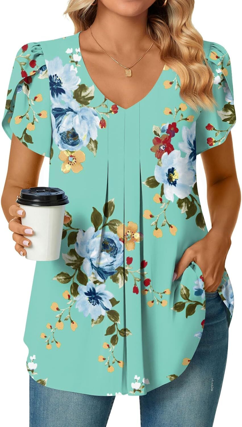• Bestbee Women's Dressy Chiffon Blouse Shirts Pleated Tunic Tops V Neck Petal Short Sleeve Casual T-Shirts 2024 Summer Tops