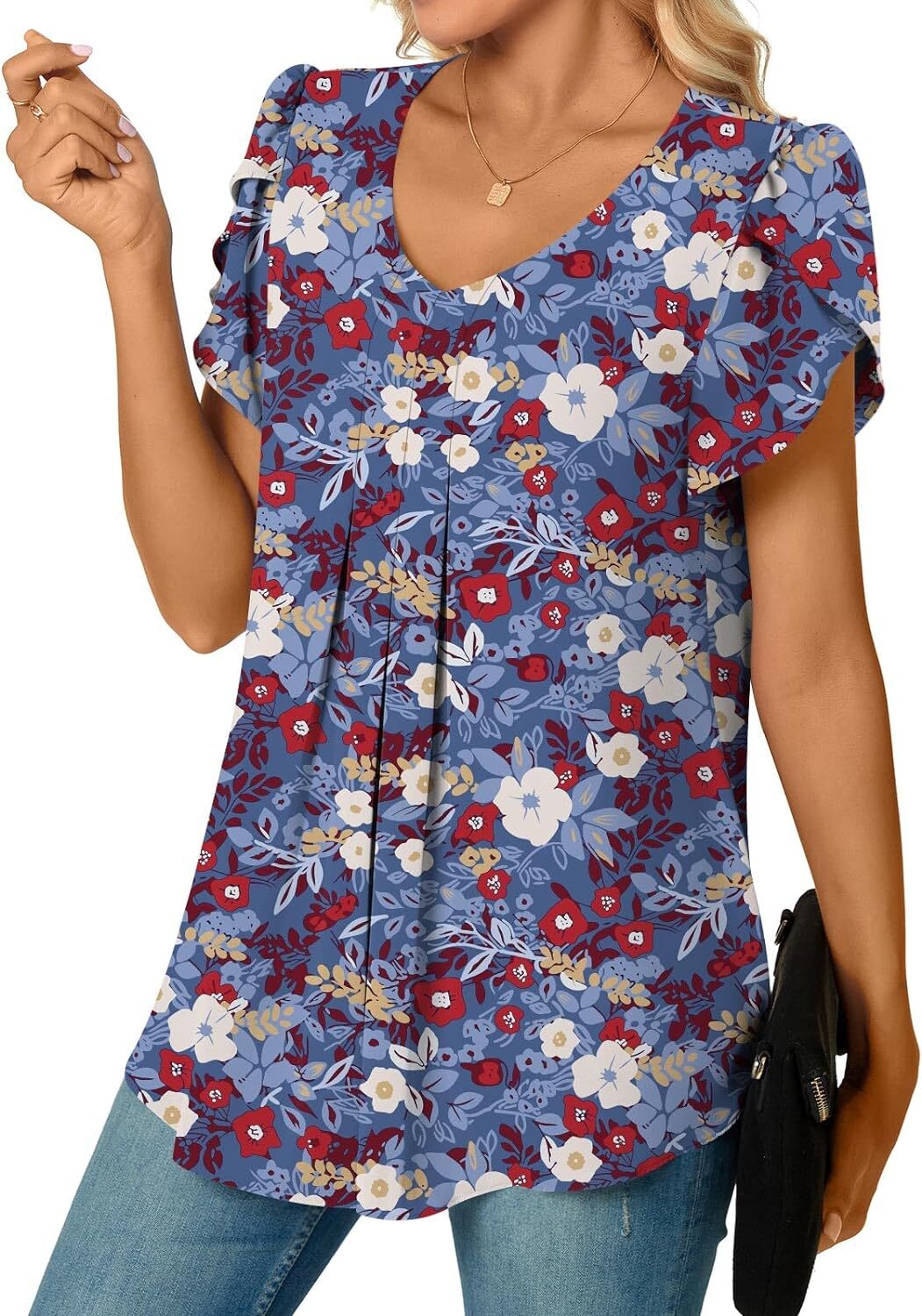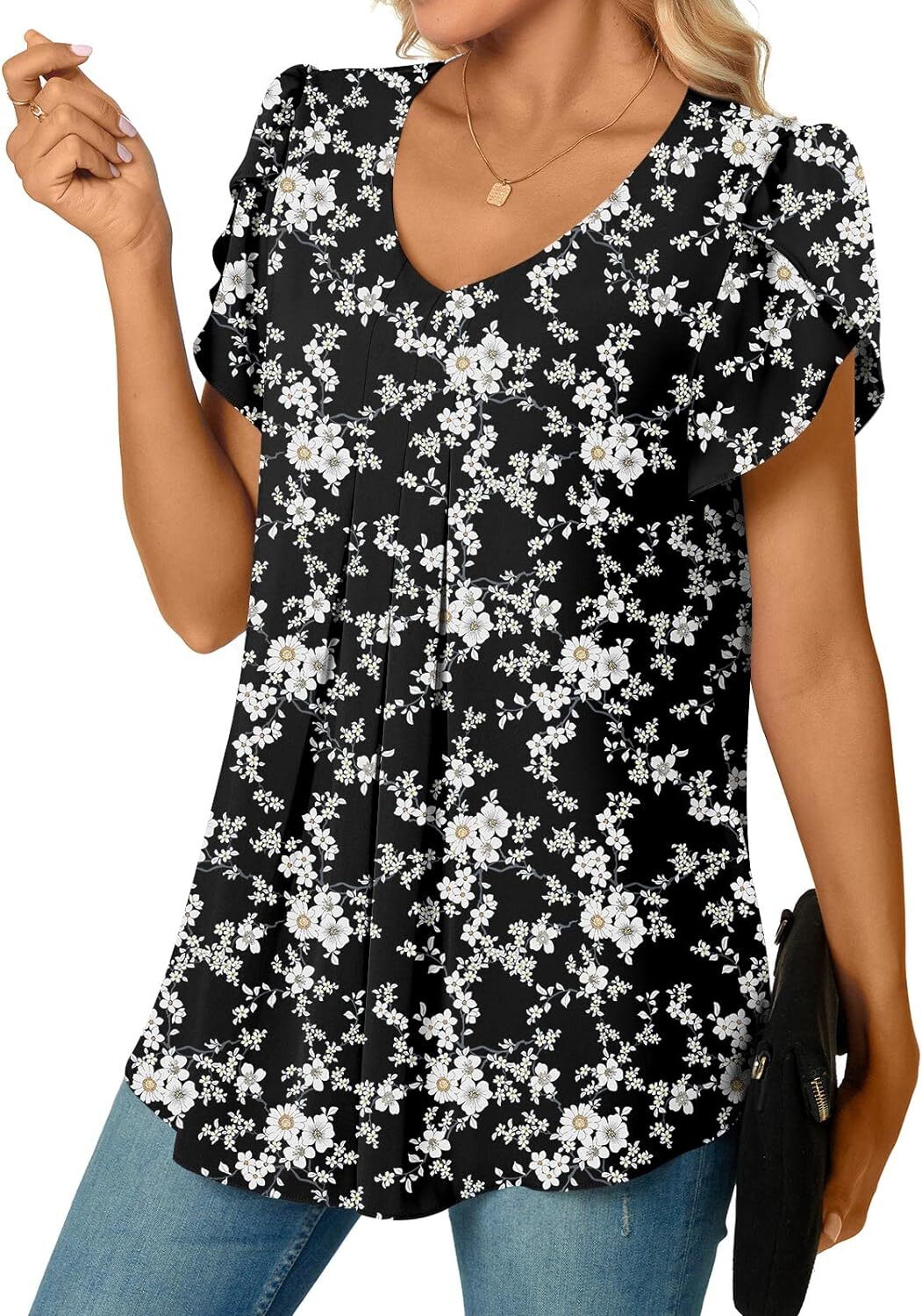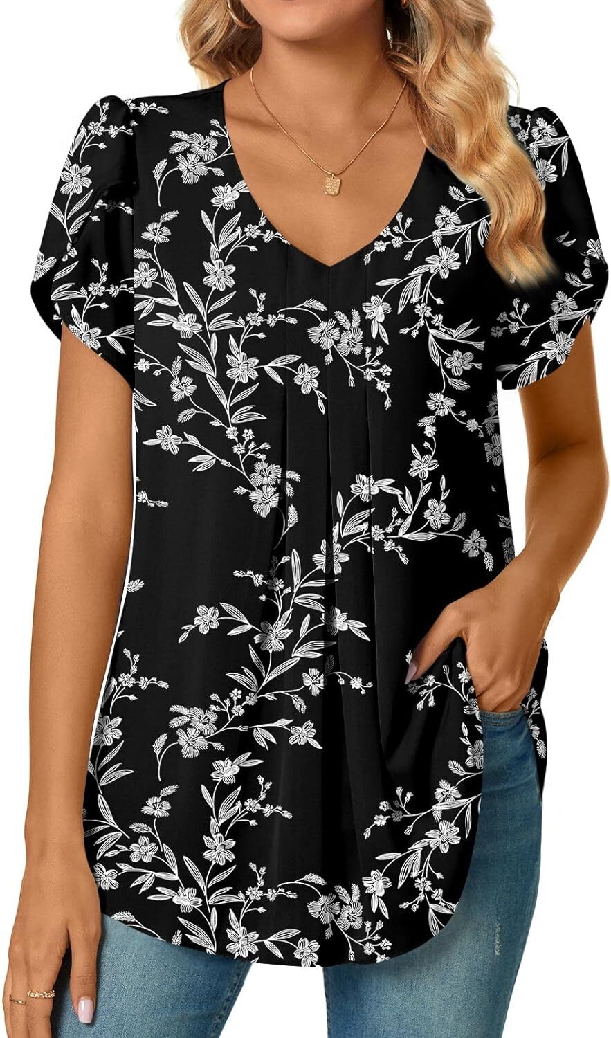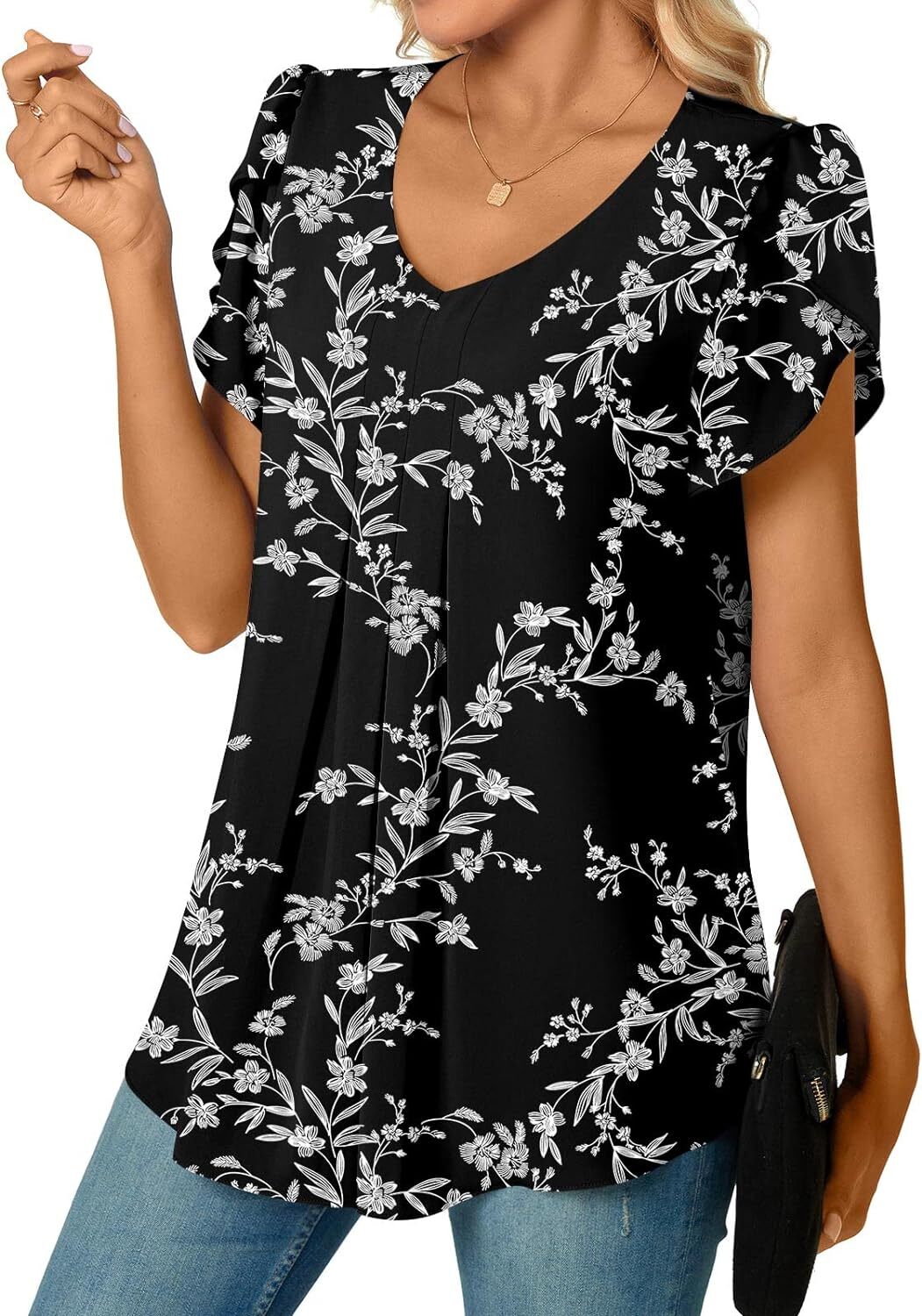 Bestbee Women's Dressy Chiffon Blouse Shirts Pleated Tunic Tops V Neck Petal Short Sleeve Casual T-Shirts 2024 Summer Tops