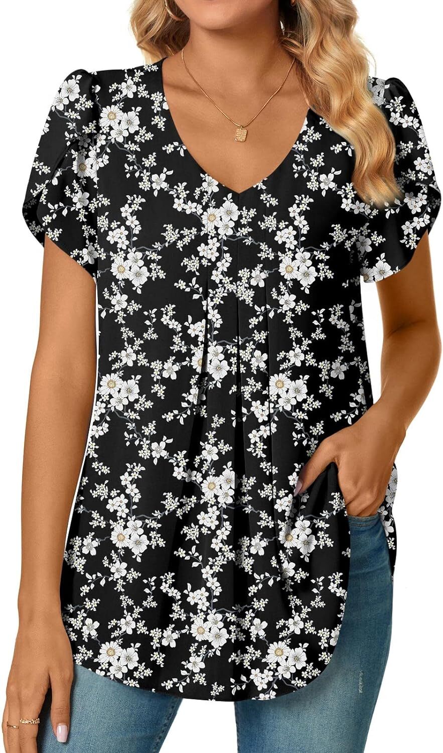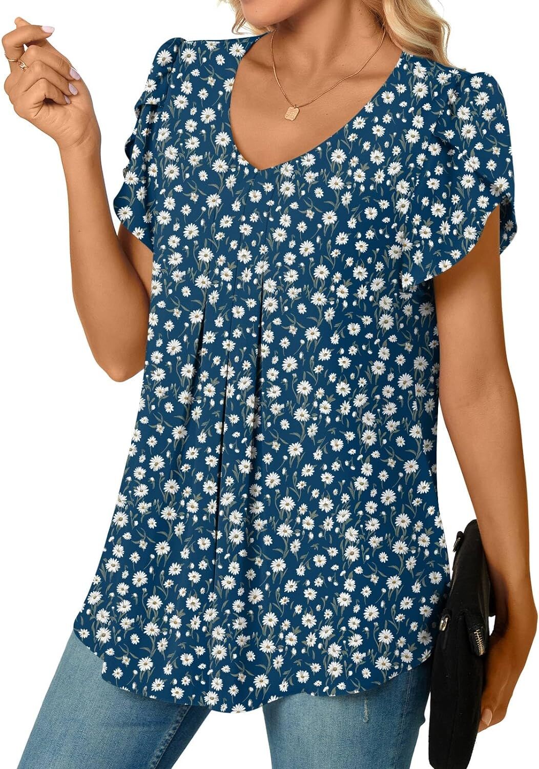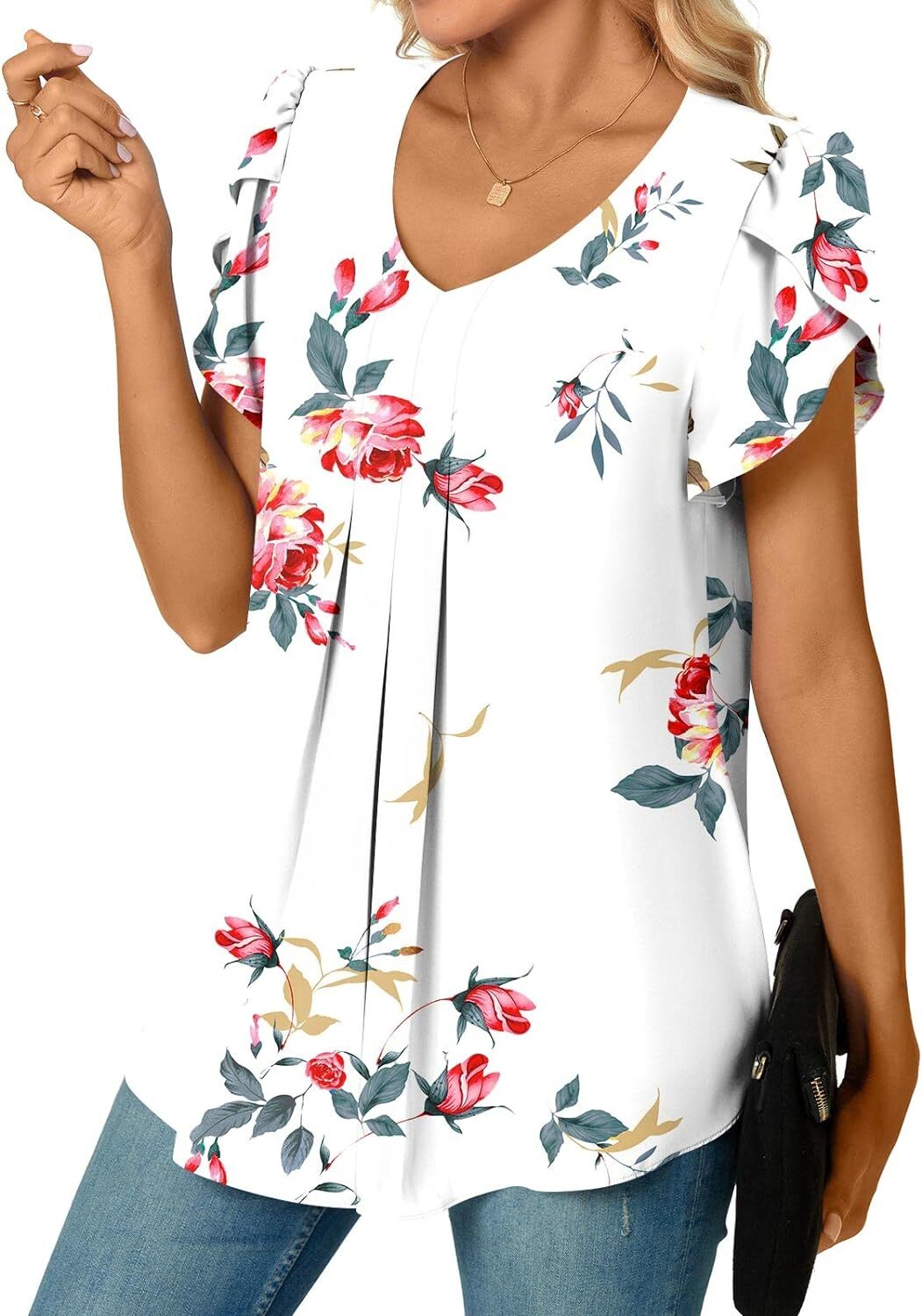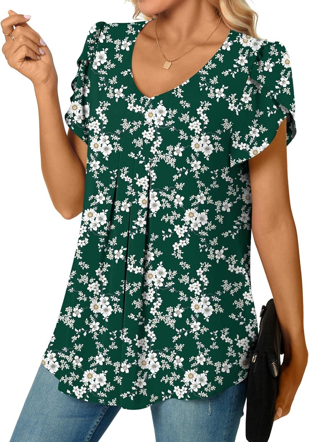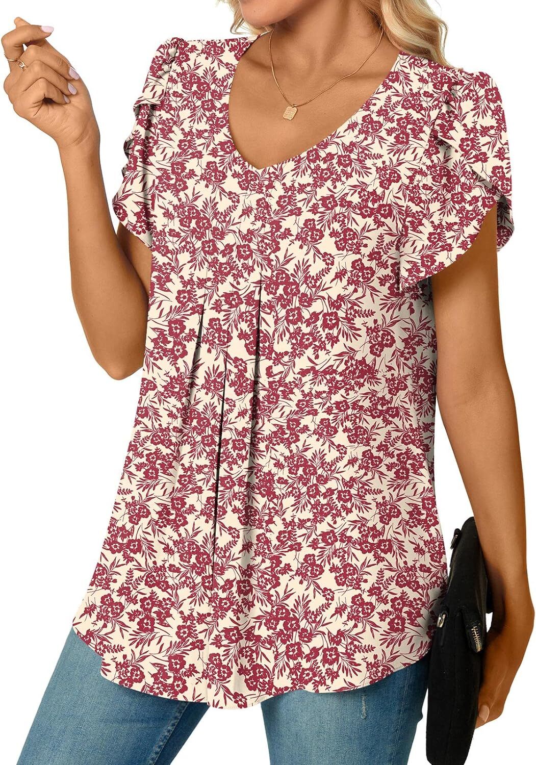 Bestbee Women's Dressy Chiffon Blouse Shirts Pleated Tunic Tops V Neck Petal Short Sleeve Casual T-Shirts 2024 Summer Tops