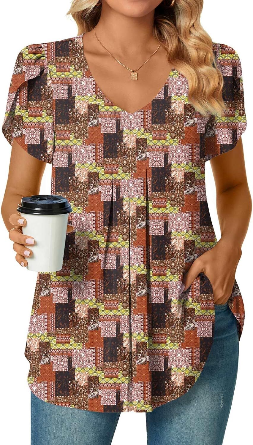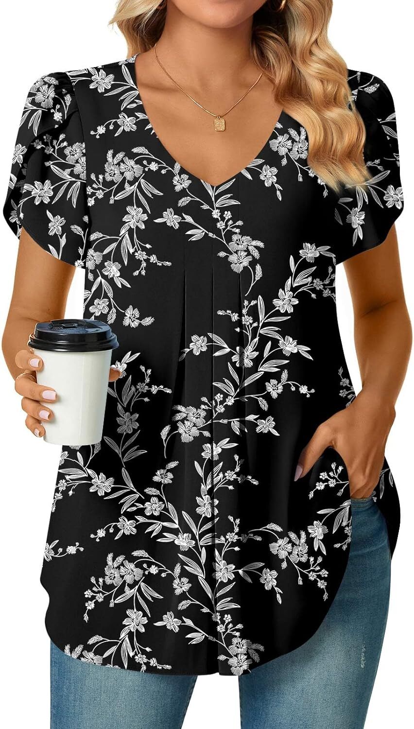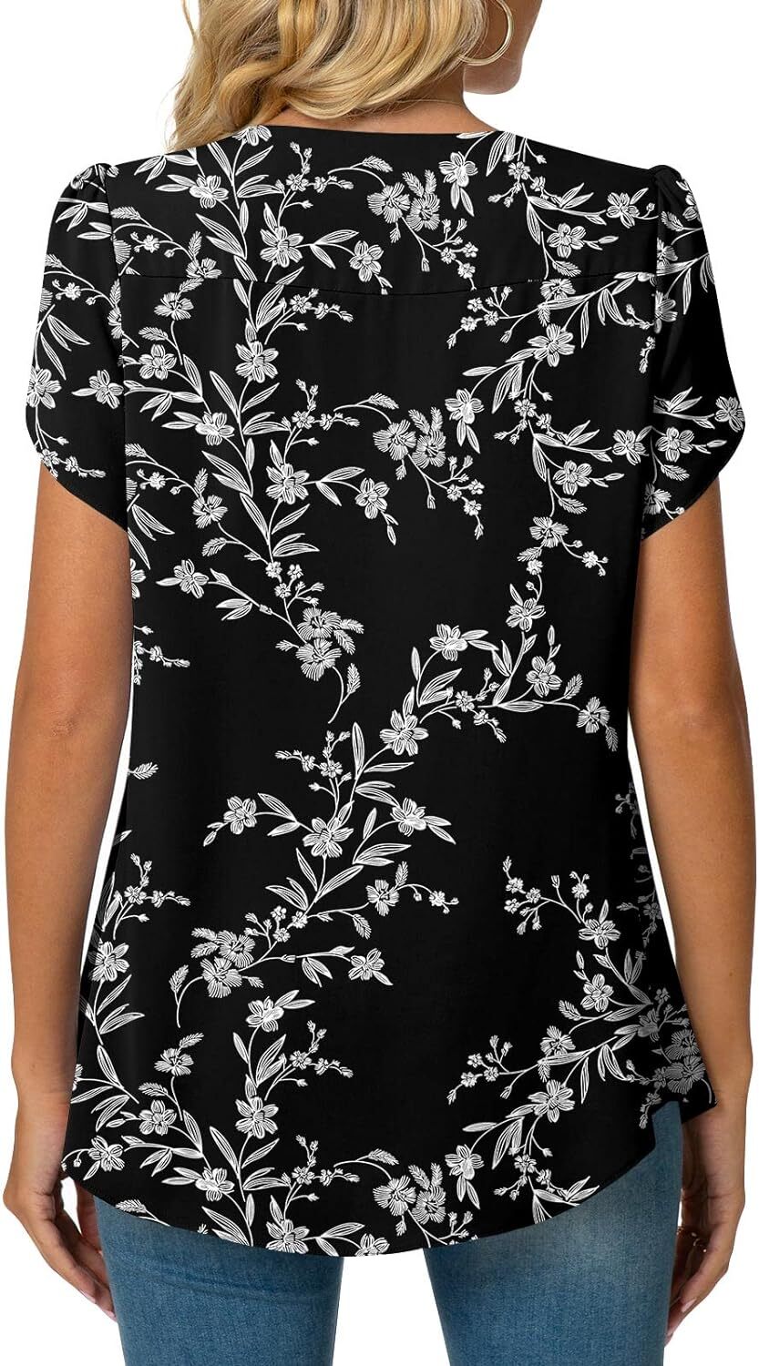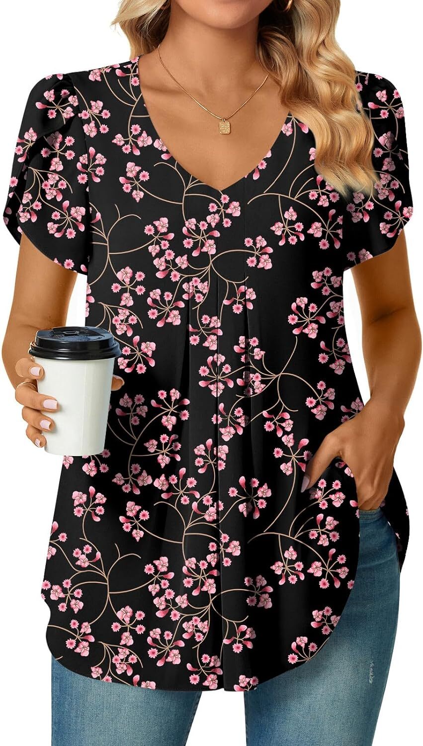 Bestbee Women's Dressy Chiffon Blouse Shirts Pleated Tunic Tops V Neck Petal Short Sleeve Casual T-Shirts 2024 Summer Tops