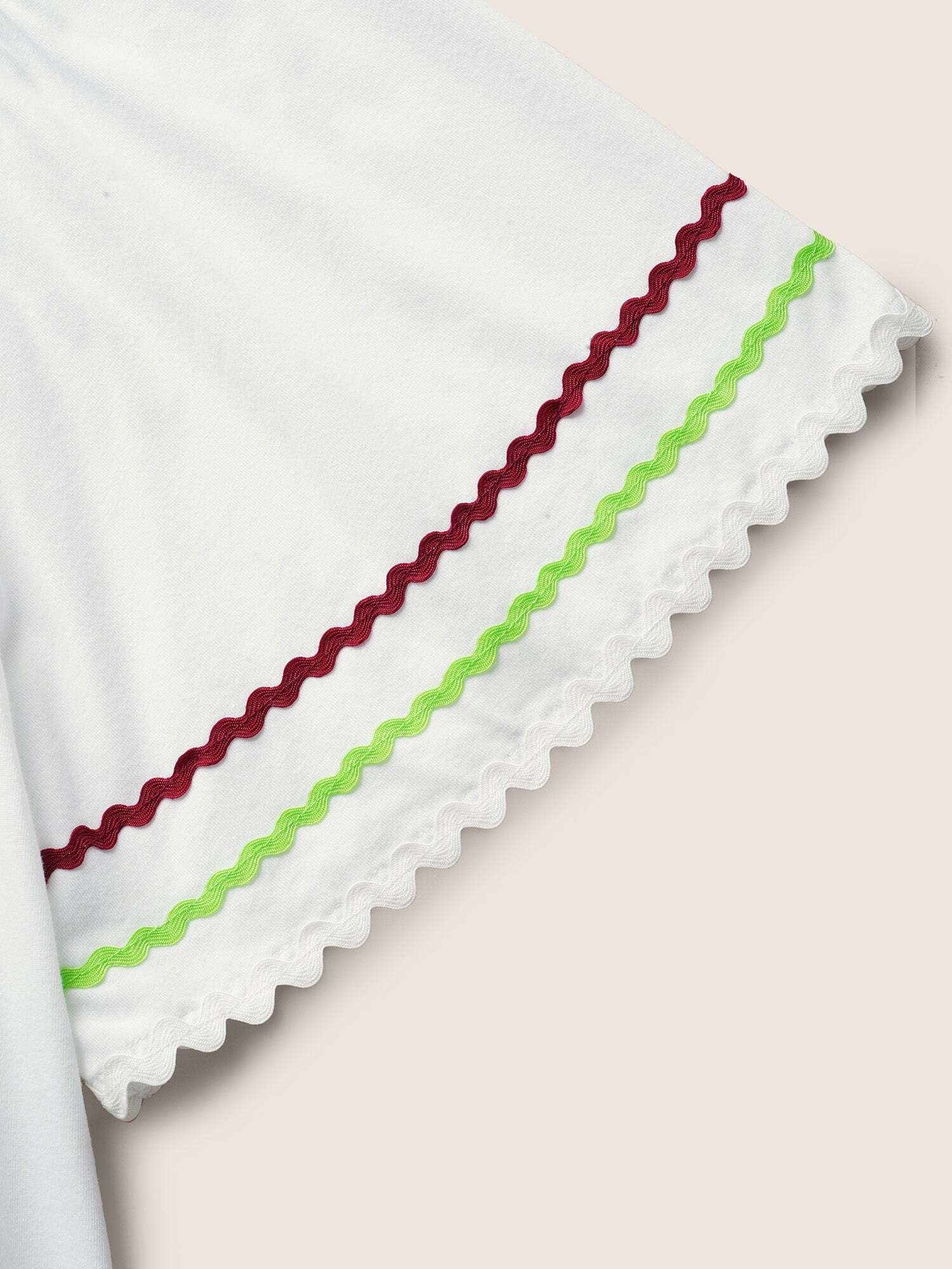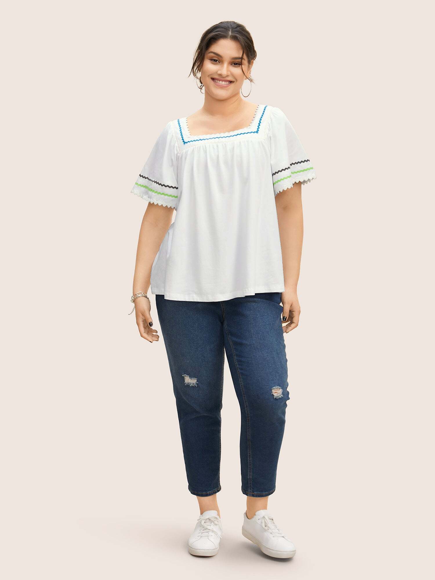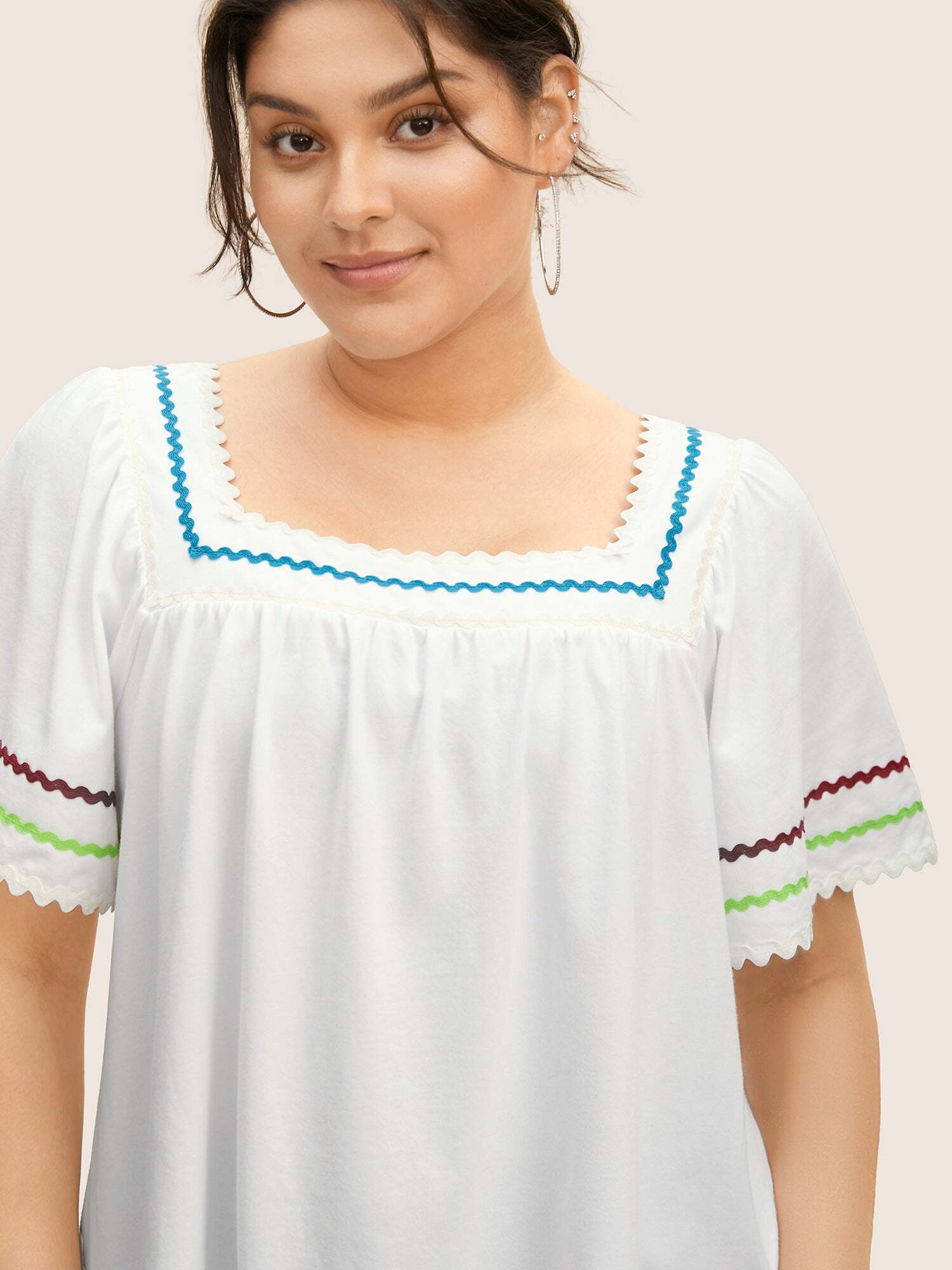 • Square Neck Woven Ribbon Contrast Ruffle Sleeve T-shirt